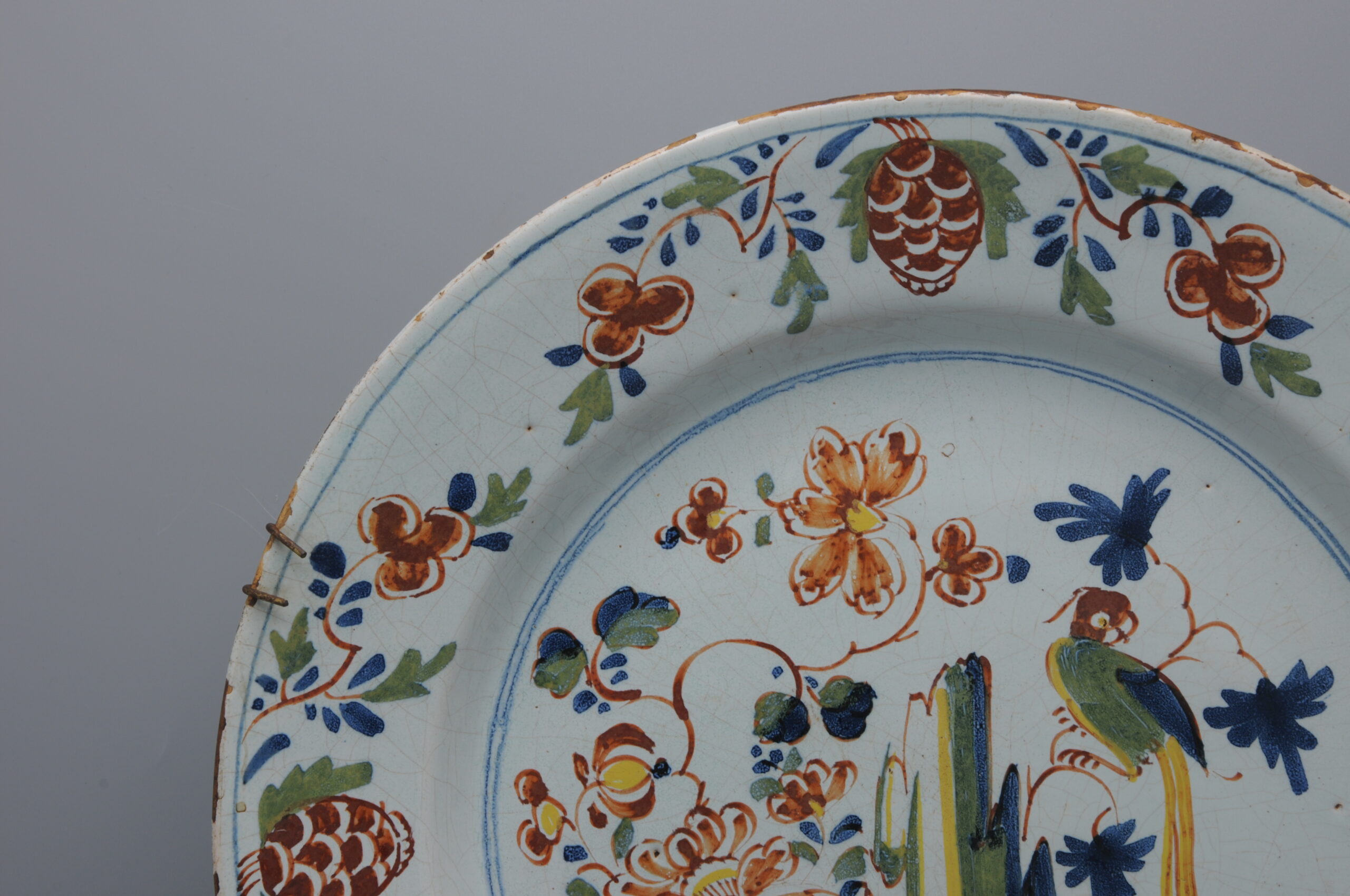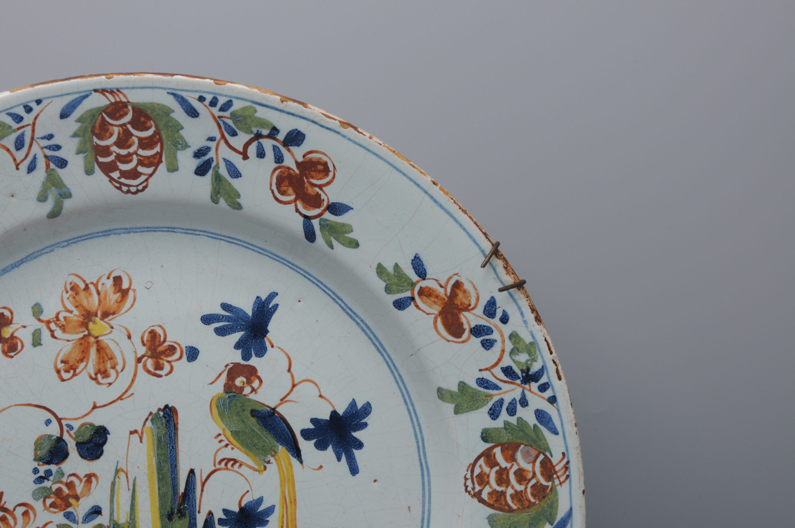 Beloved English delft pattern, the Parrakeet on branch within a rock and flower landscape. This particular pattern has been attributed to the Lambeth High Street pottery of Abigail Griffith.
