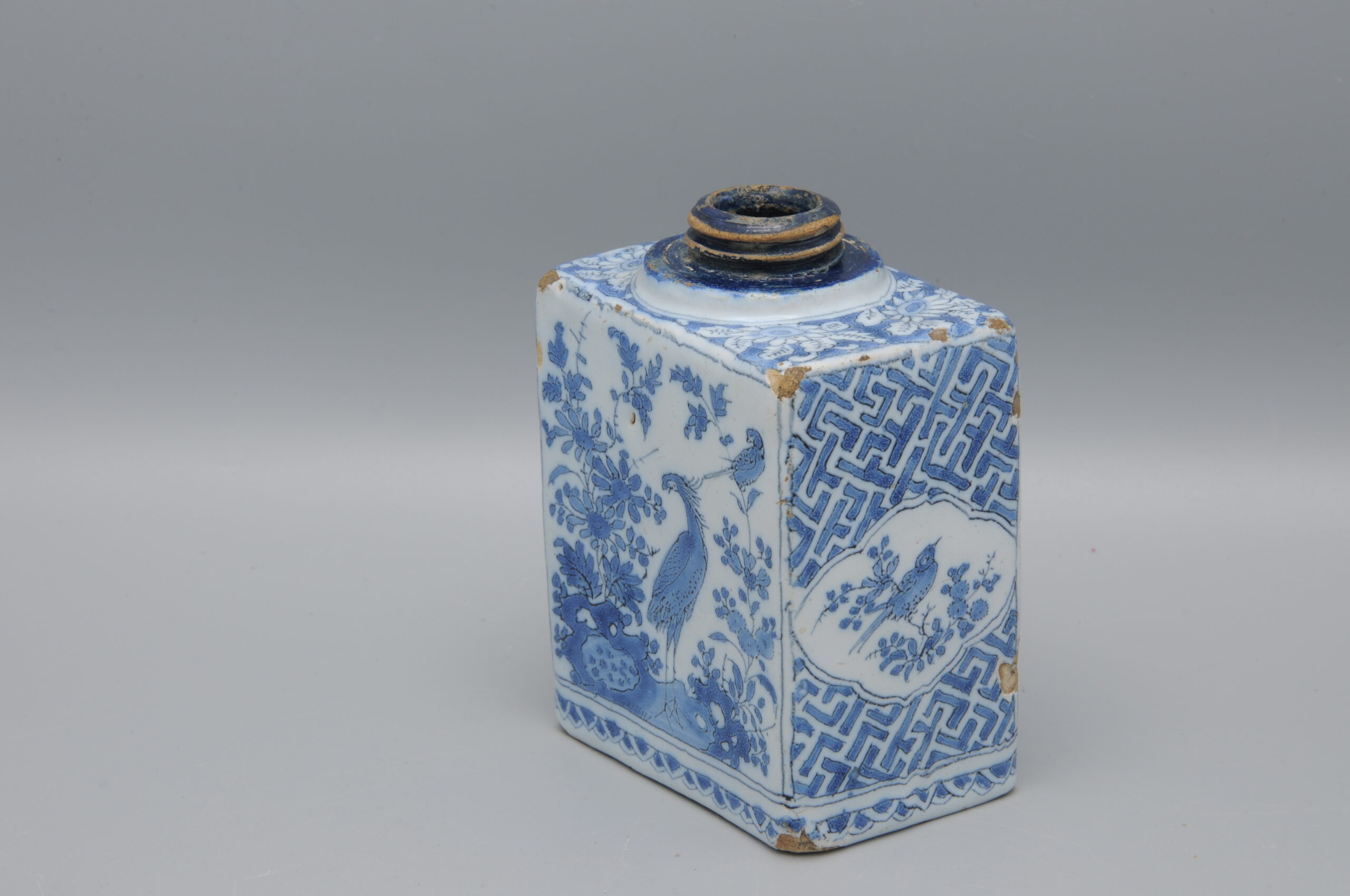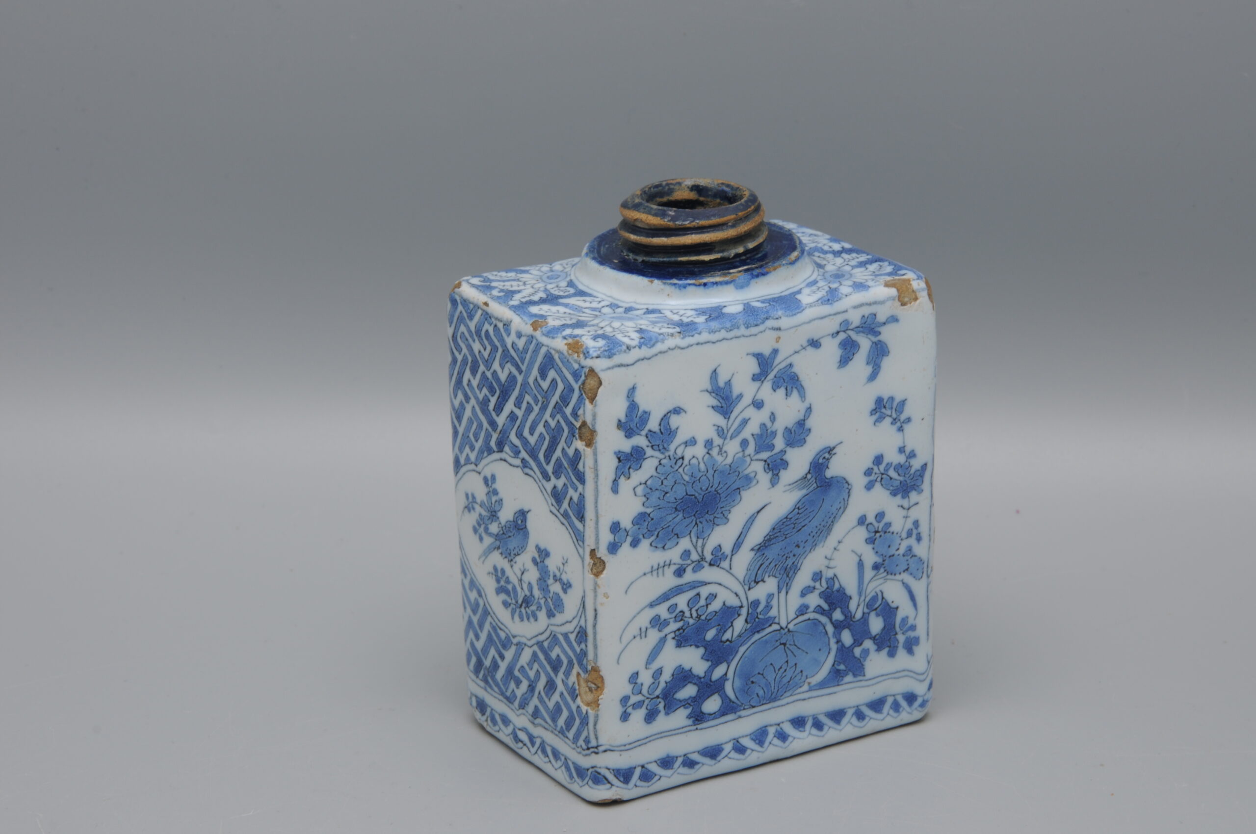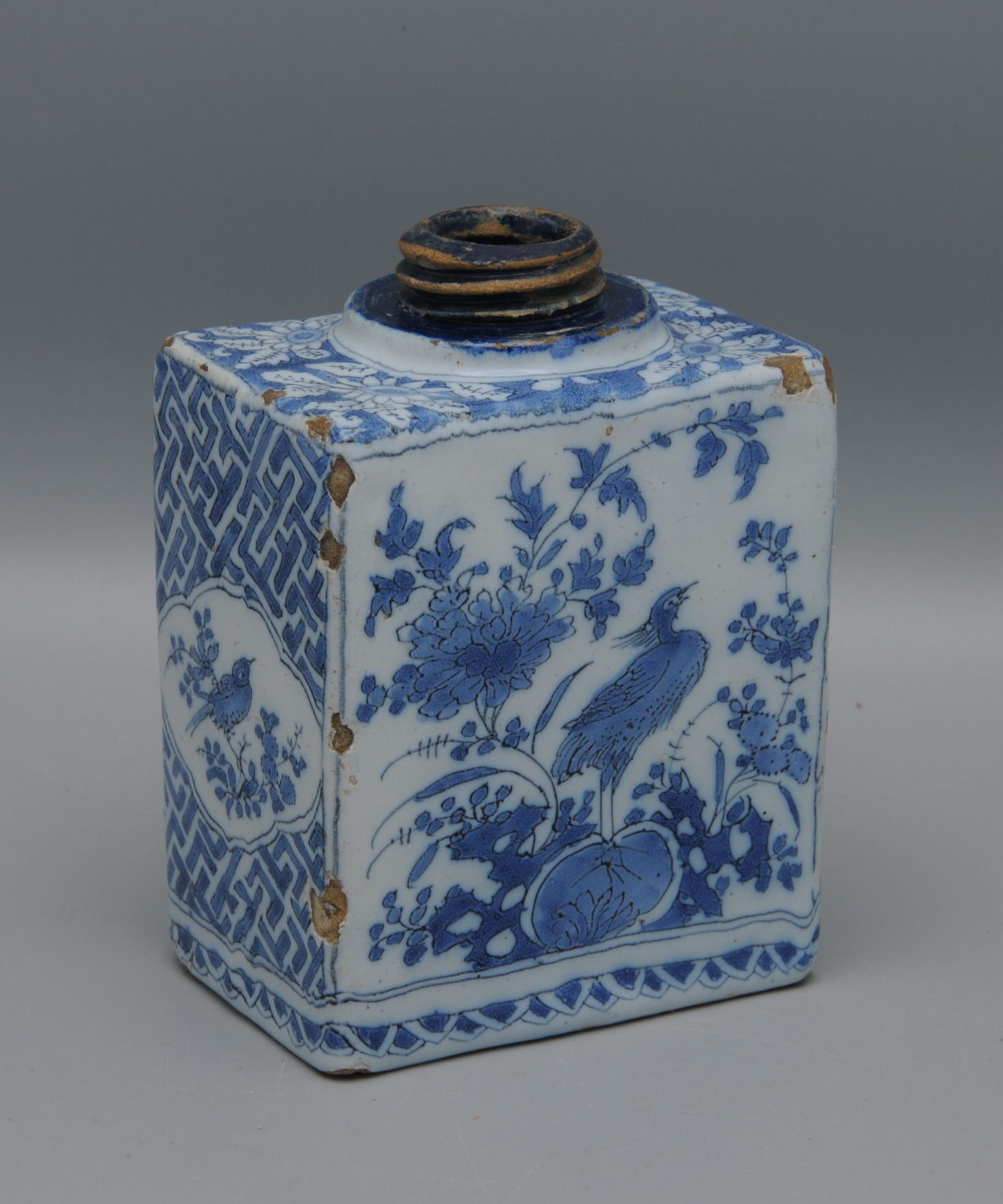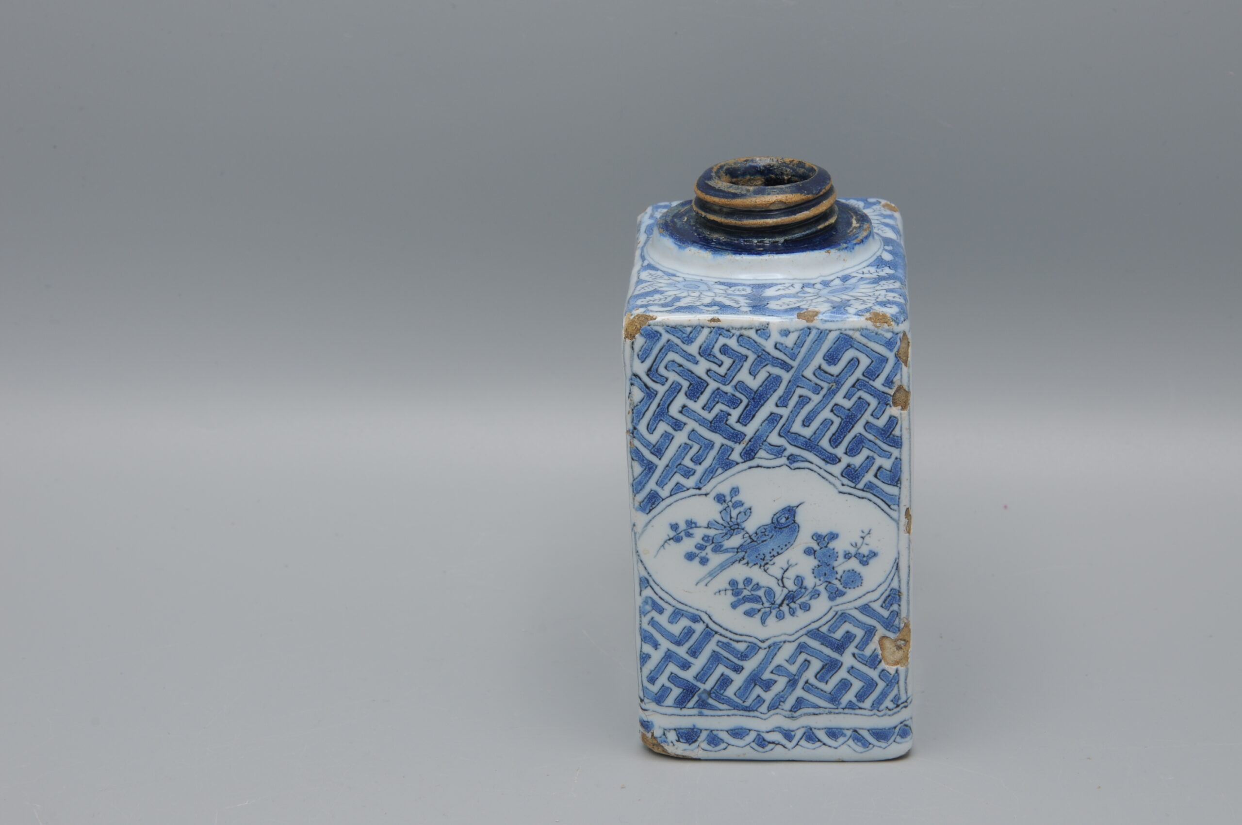 A late 17th-century Dutch Delftware tea canister, tin-glazed and painted in underglaze cobalt blue. The rectangular body features Chinoiserie landscapes on the front and back, depicting birds, trees, rocks, and flowering plants. The sides are adorned with cartouches enclosing birds within stylized ornamental frameworks, inspired by contemporary Chinese porcelain models.