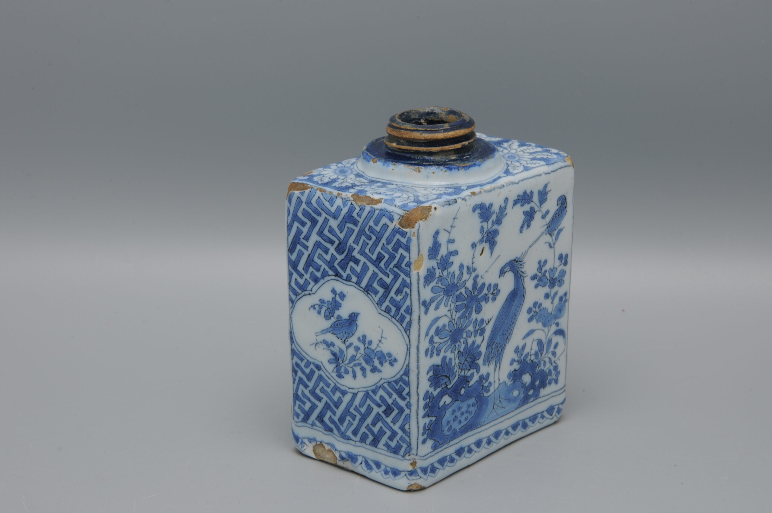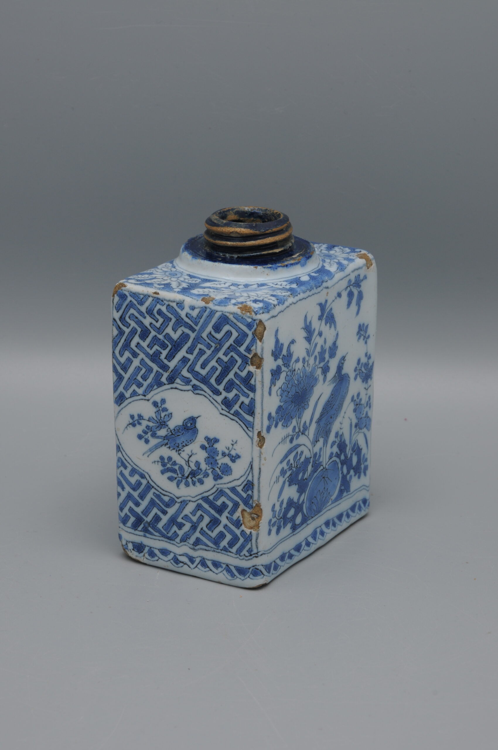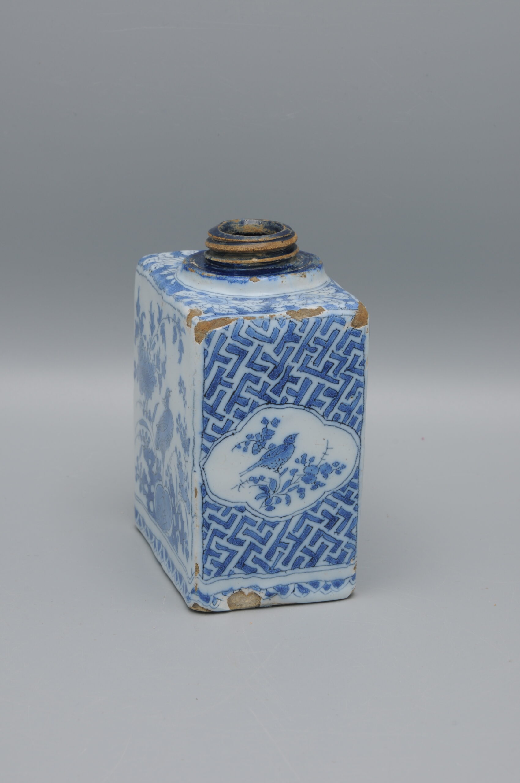 A late 17th-century Dutch Delftware tea canister, tin-glazed and painted in underglaze cobalt blue. The rectangular body features Chinoiserie landscapes on the front and back, depicting birds, trees, rocks, and flowering plants. The sides are adorned with cartouches enclosing birds within stylized ornamental frameworks, inspired by contemporary Chinese porcelain models.