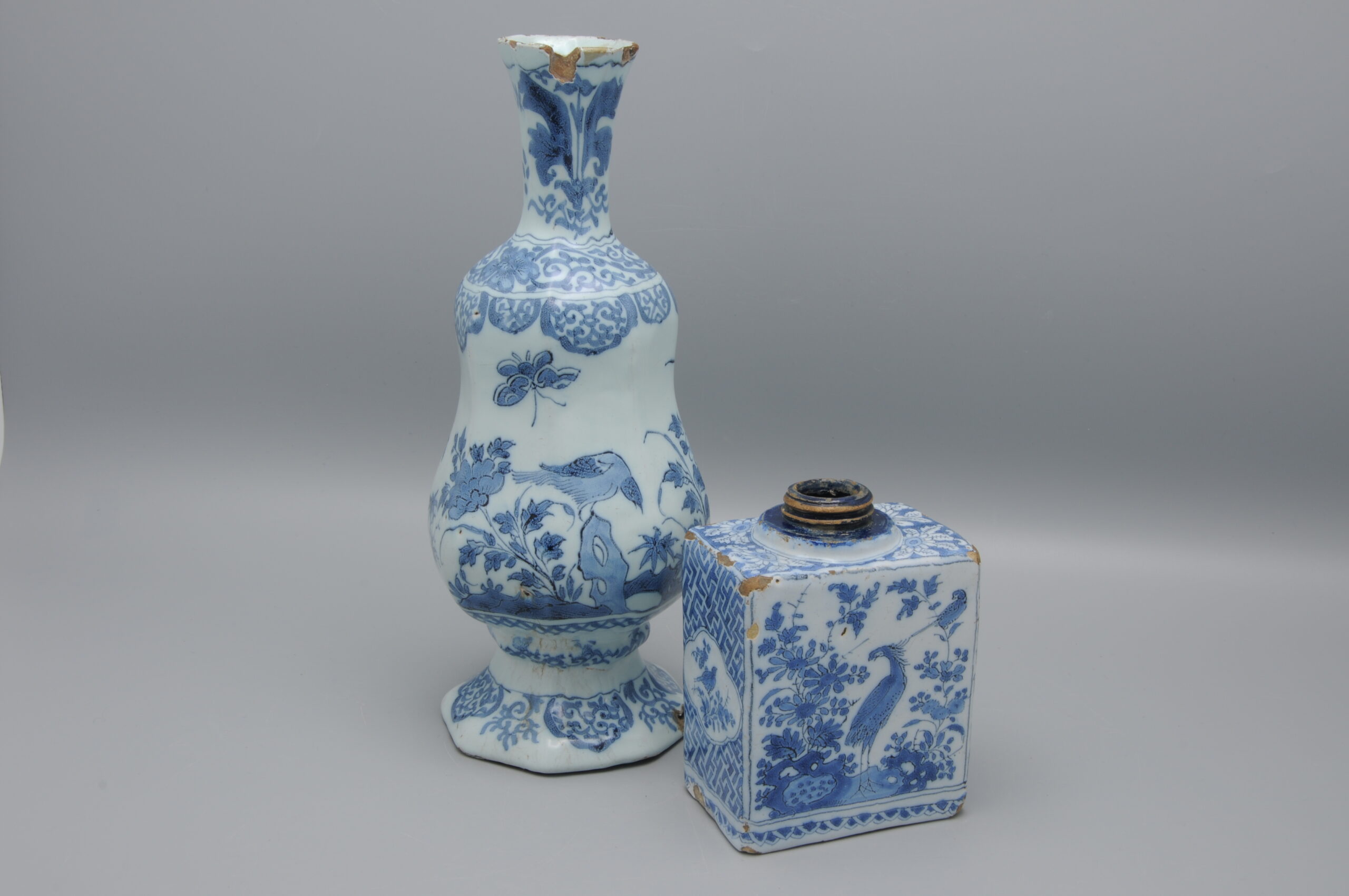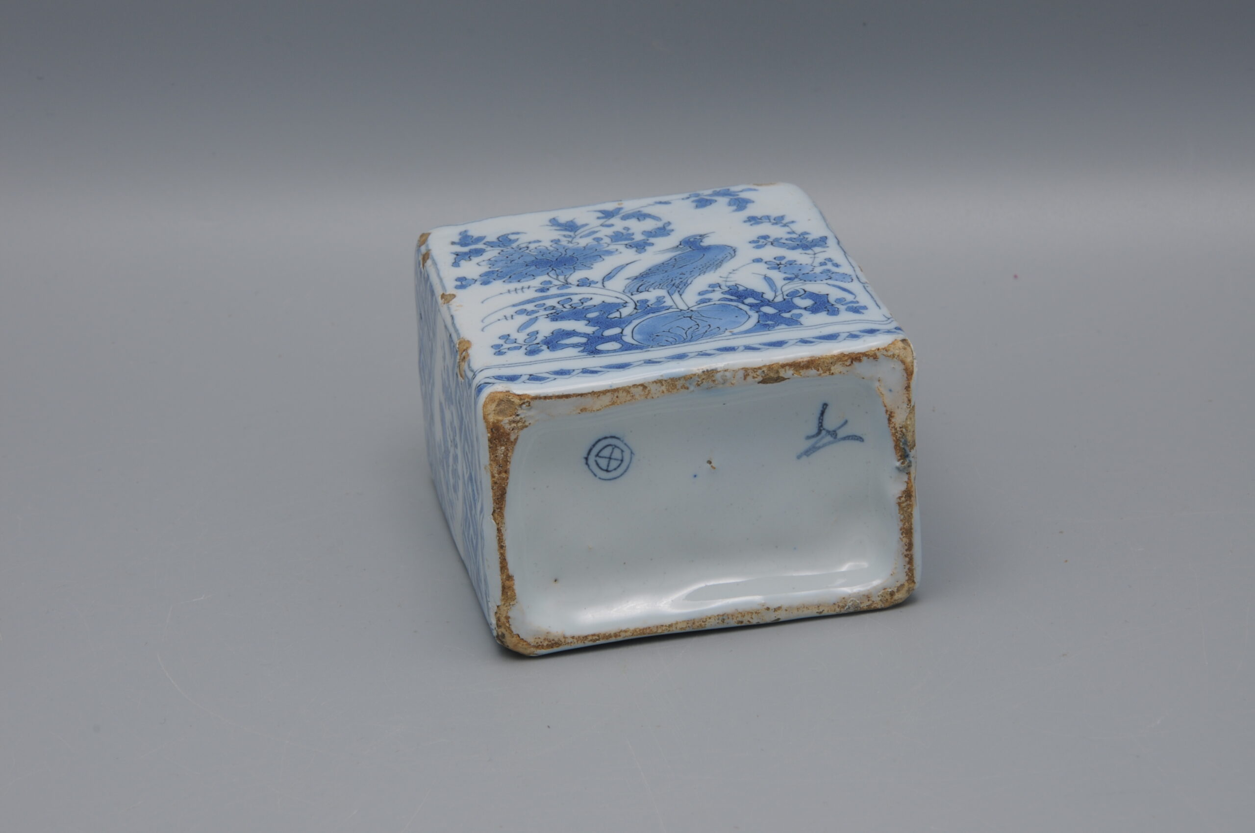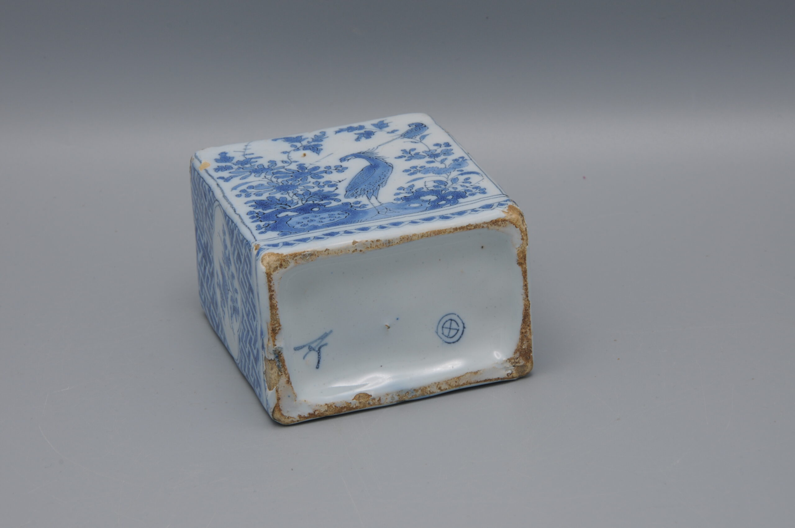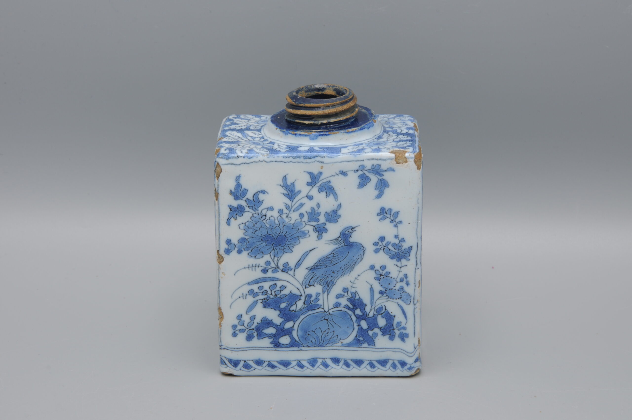 A late 17th-century Dutch Delftware tea canister, tin-glazed and painted in underglaze cobalt blue. The rectangular body features Chinoiserie landscapes on the front and back, depicting birds, trees, rocks, and flowering plants. The sides are adorned with cartouches enclosing birds within stylized ornamental frameworks, inspired by contemporary Chinese porcelain models.