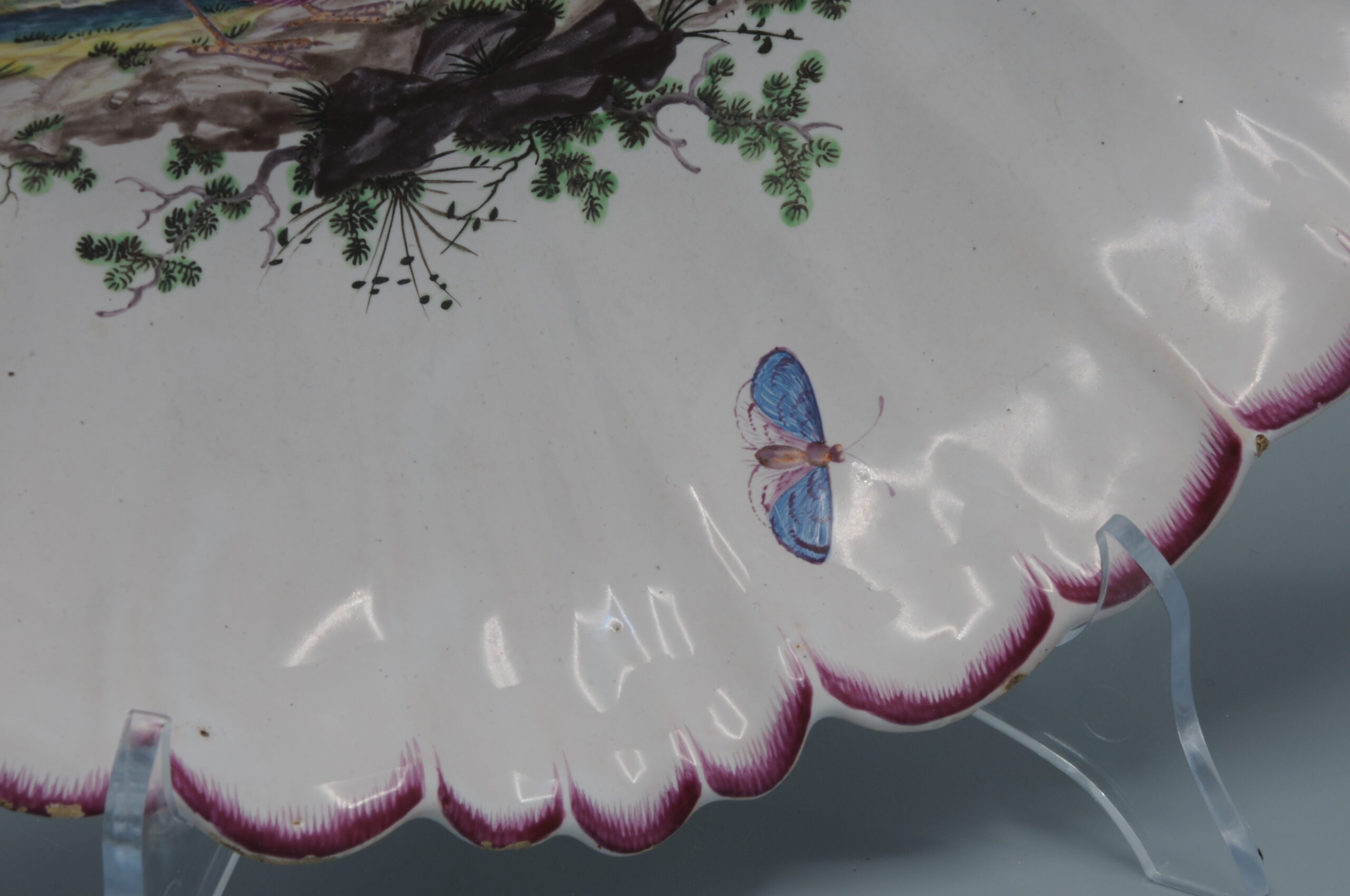 An 18th-century Aprey faience oval dish, finely painted in polychrome with perching birds at the centre and insects on the rim.