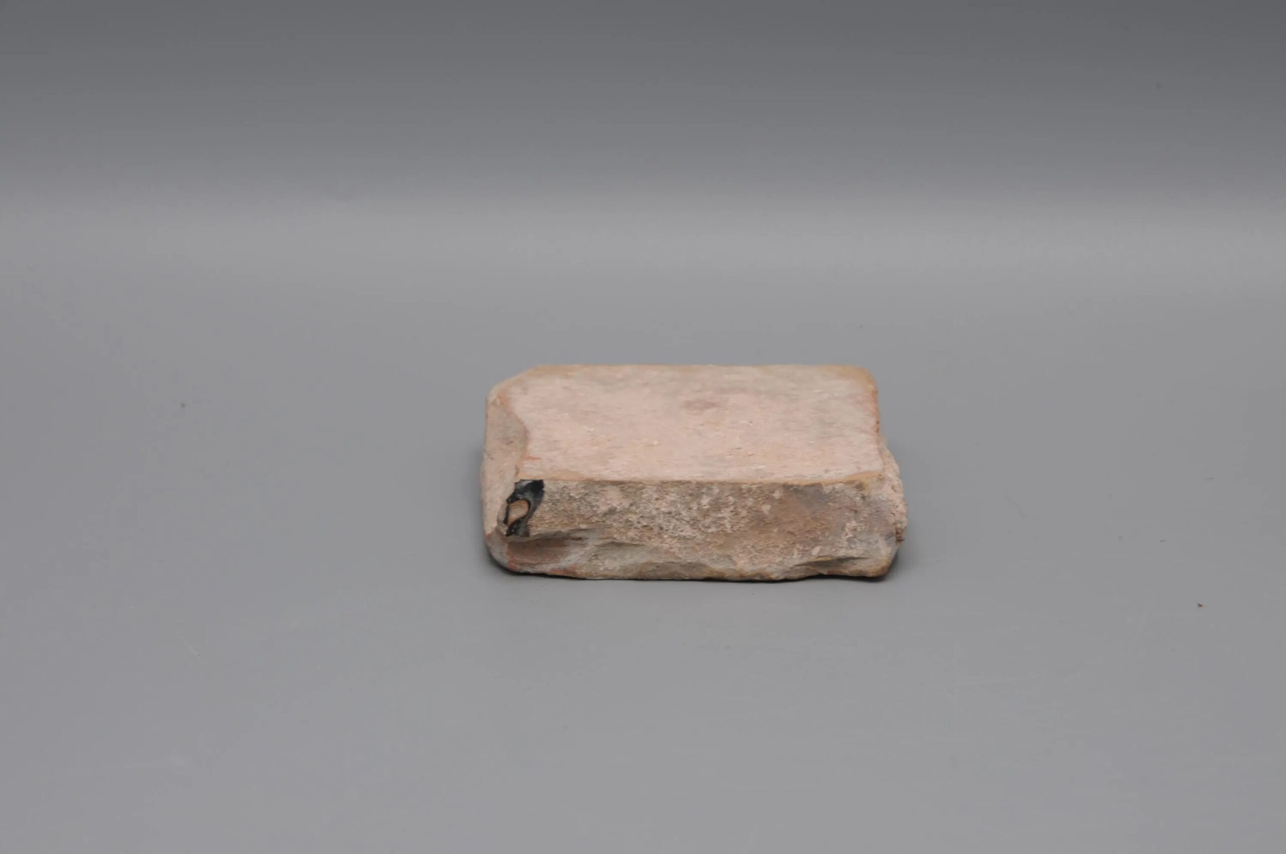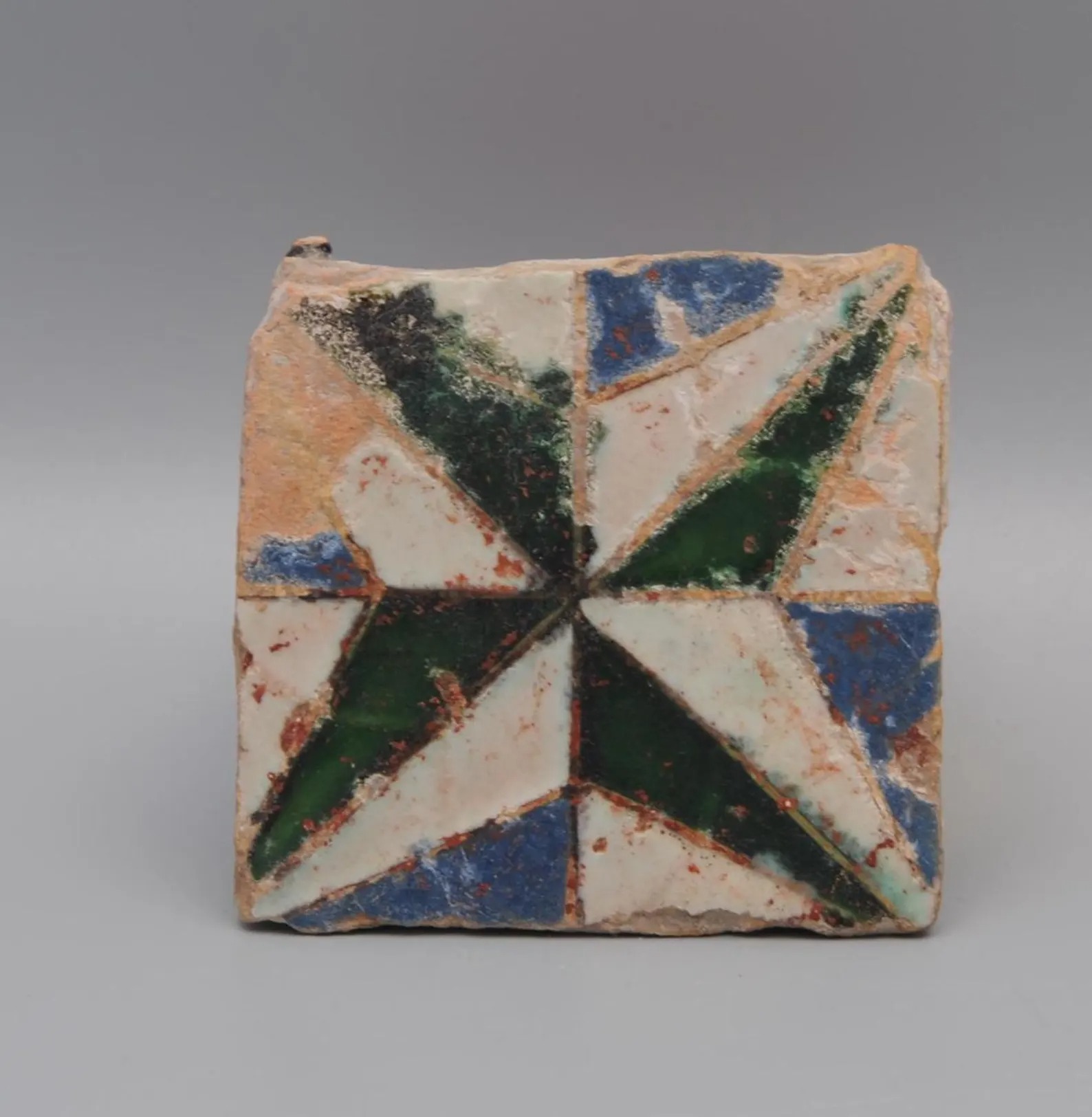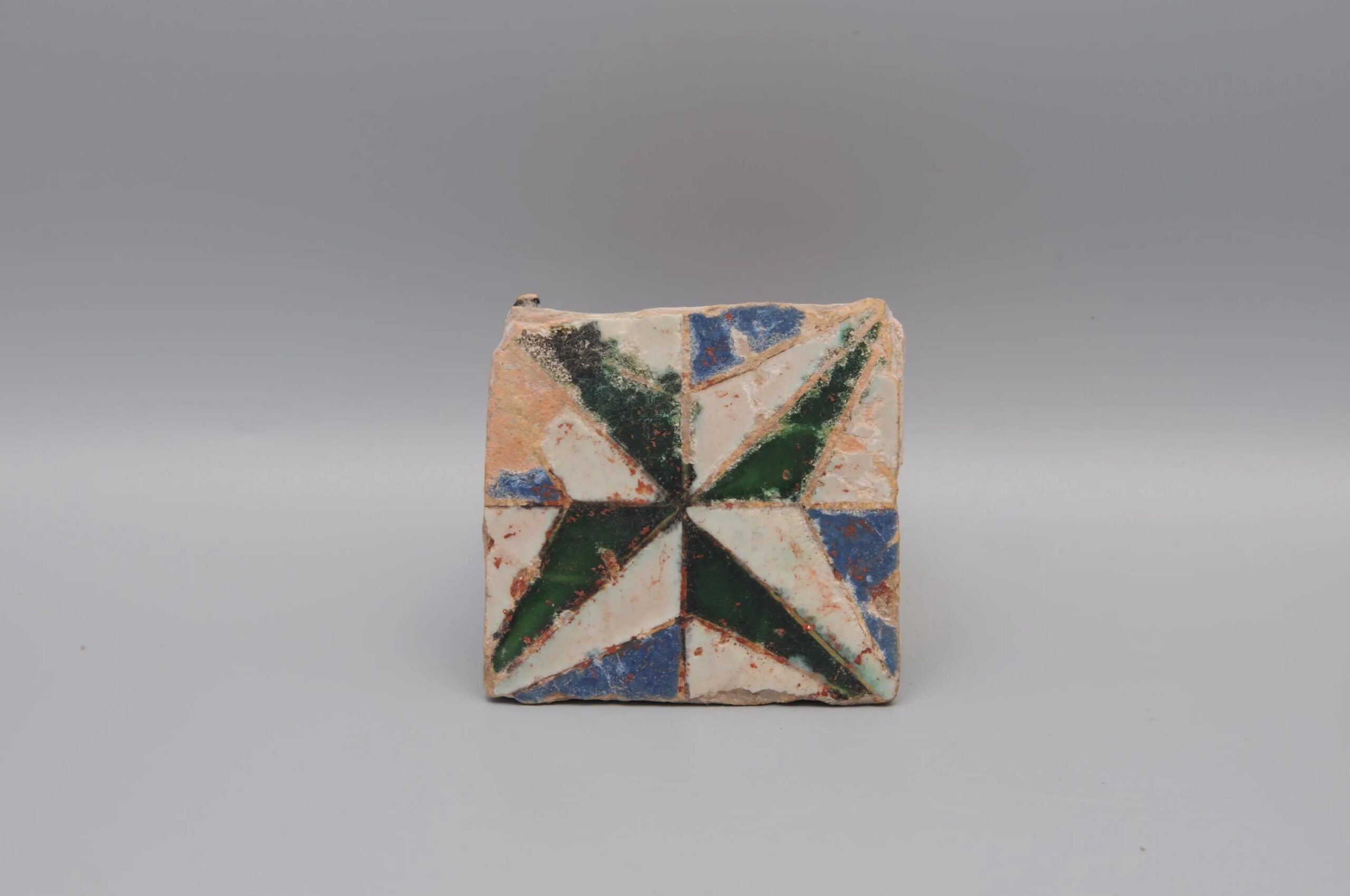This small tile is a so-called olambrilla. They were used in flooring or pavements and to cover baseboards for decorative use, combined with rectangular unglazed red tiles.