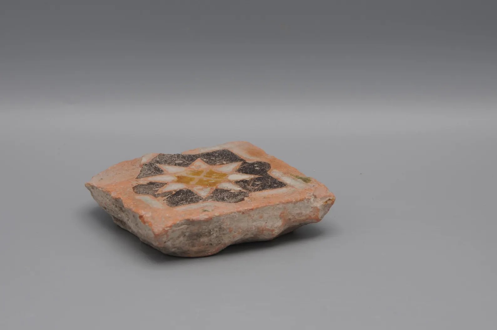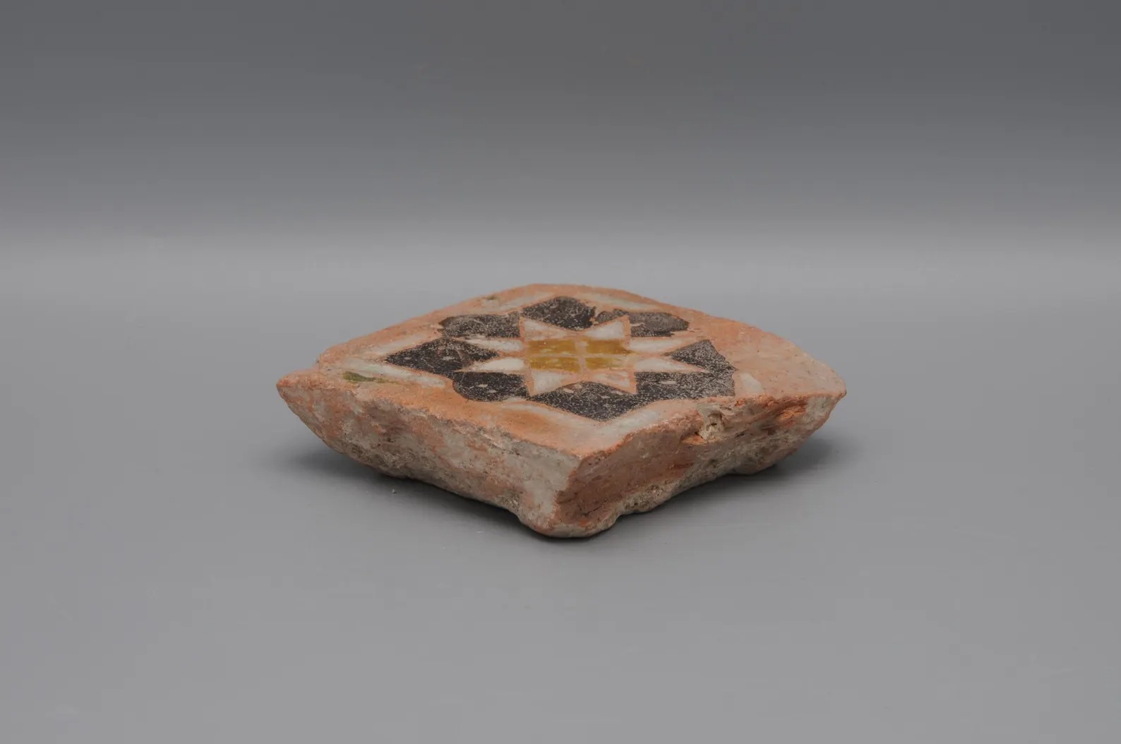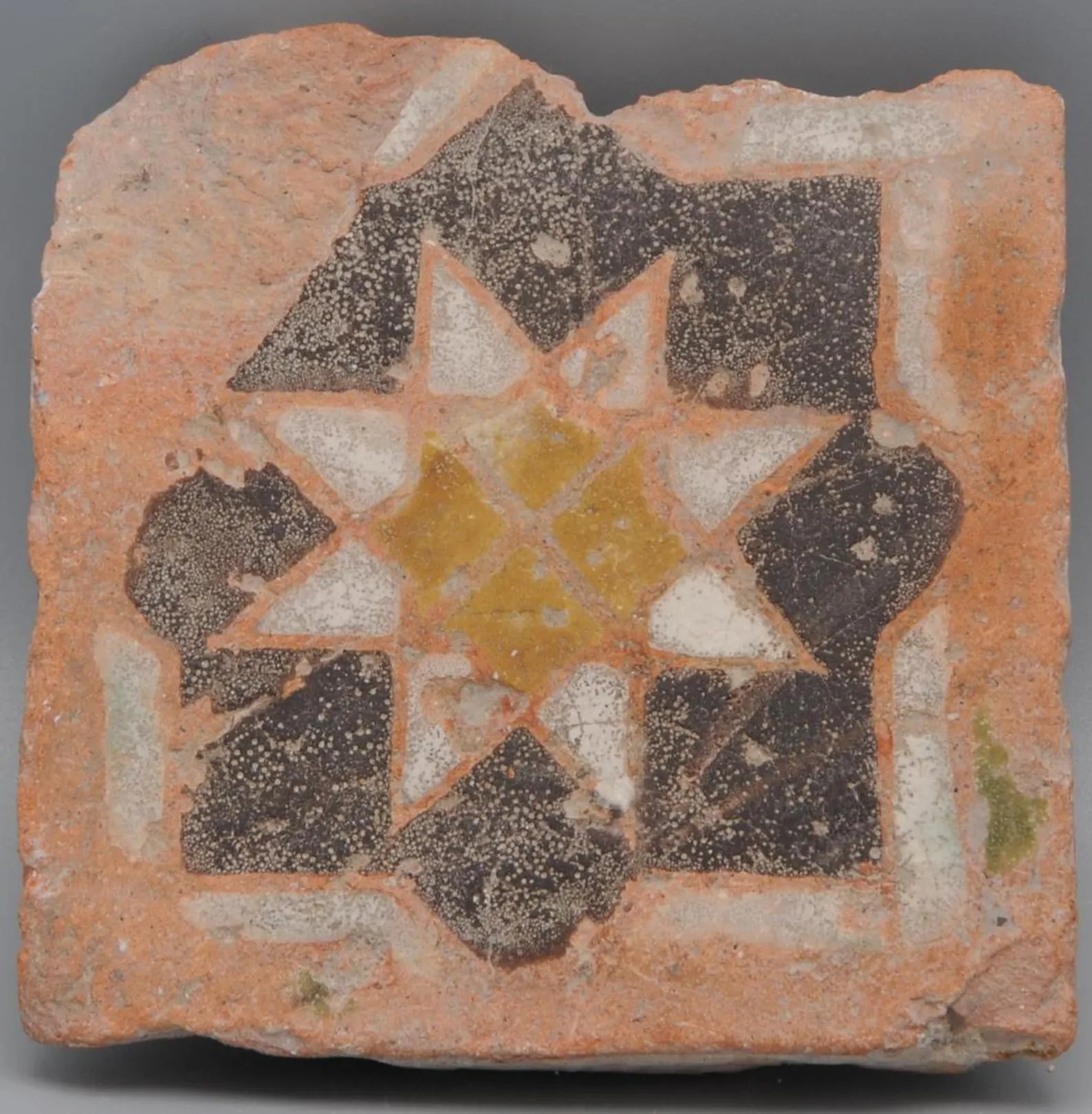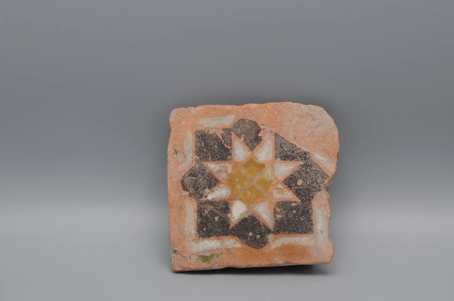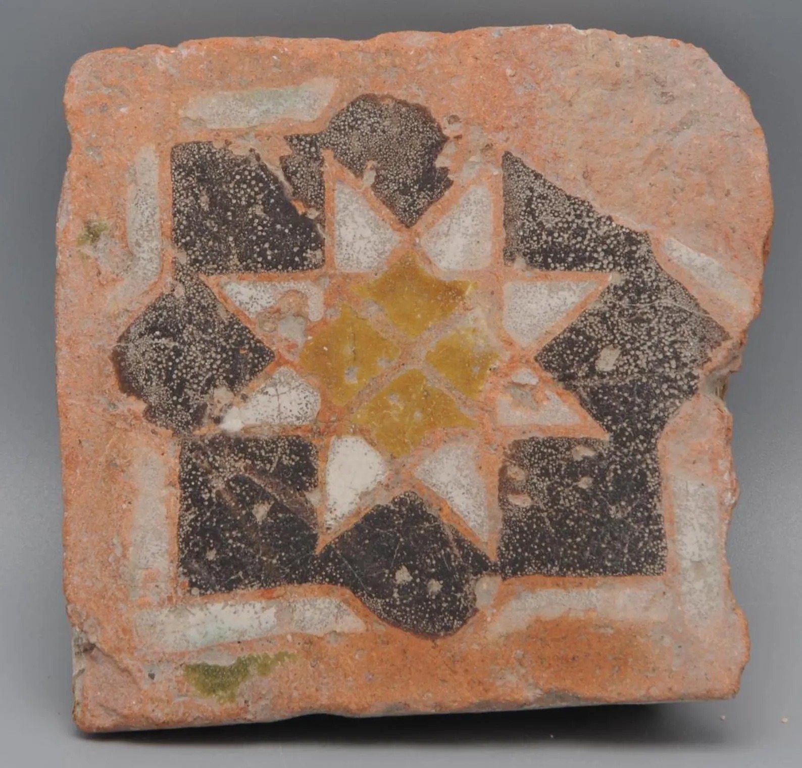 This small tile is a so-called olambrilla. They were used in flooring or pavements and to cover baseboards for decorative use, combined with rectangular unglazed red tiles.