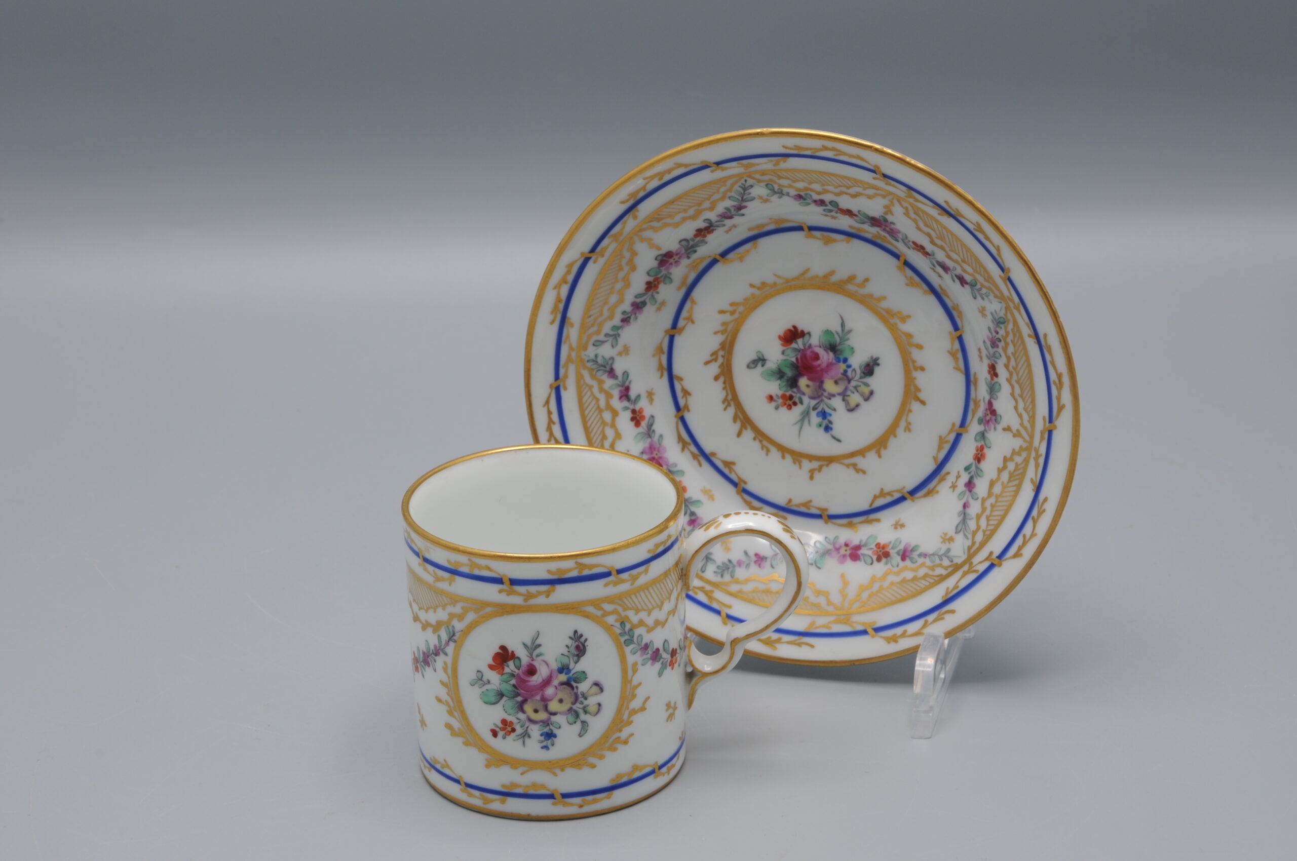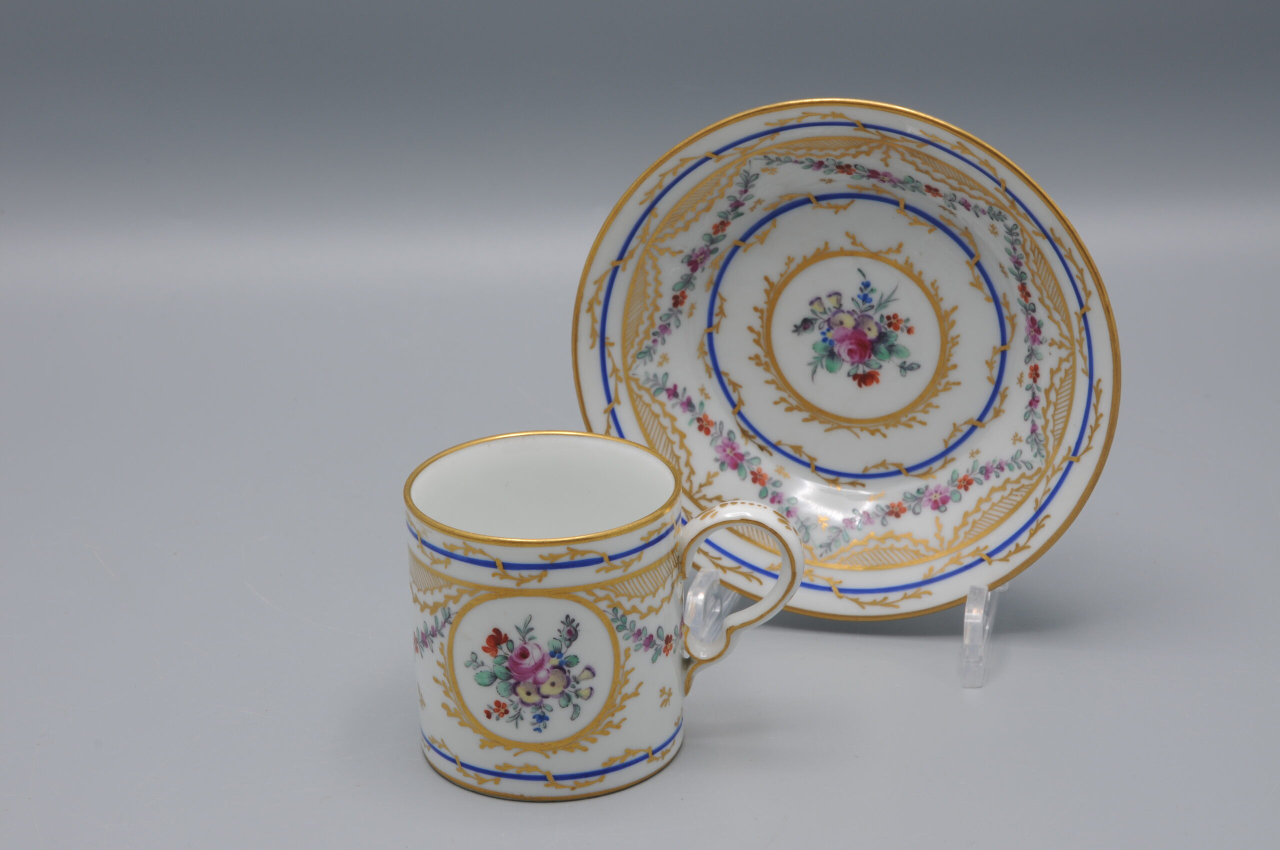 Elegant cup and saucer, of the model ‘Litron’, Central cartouche with a floral ornament.