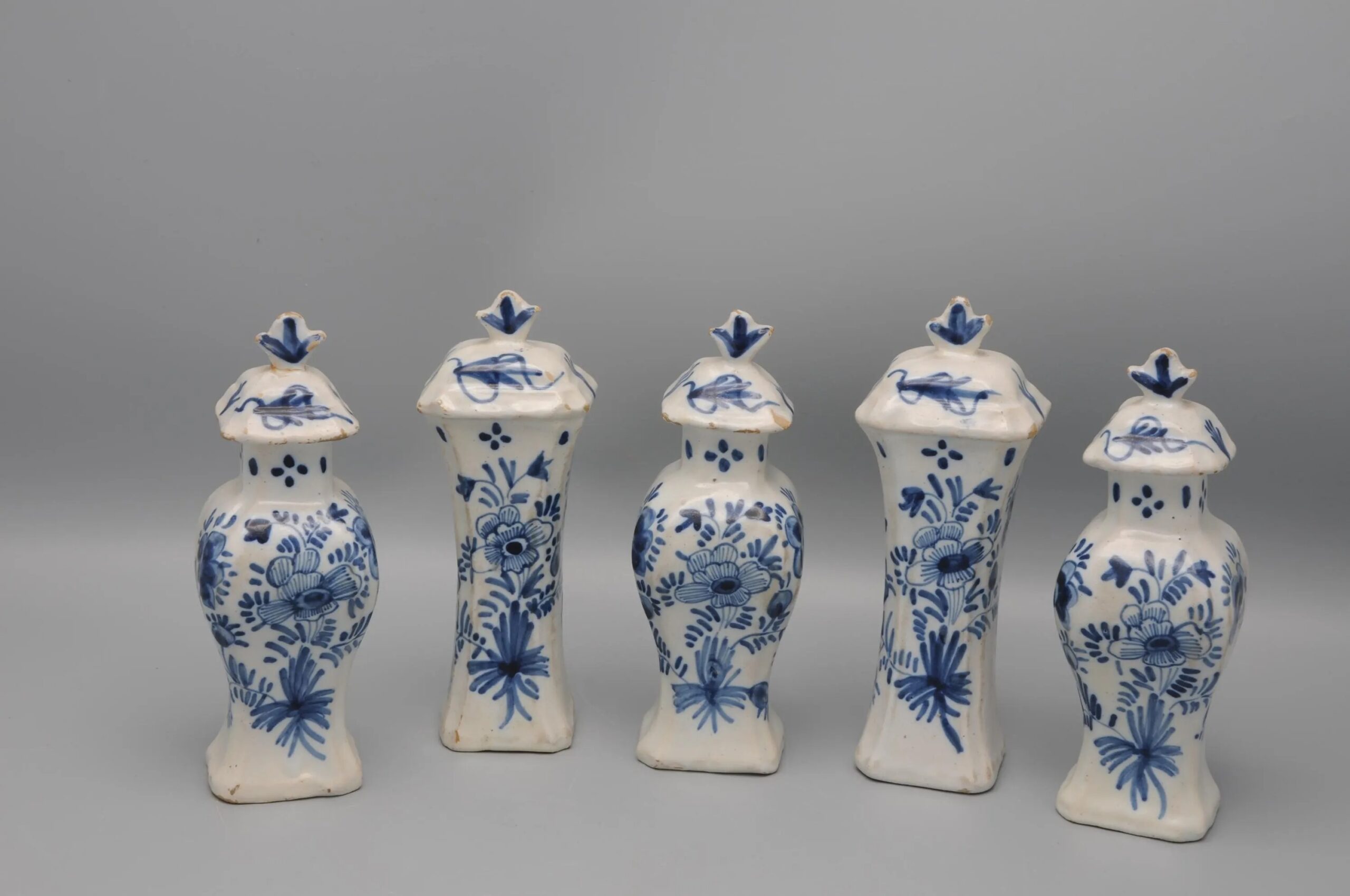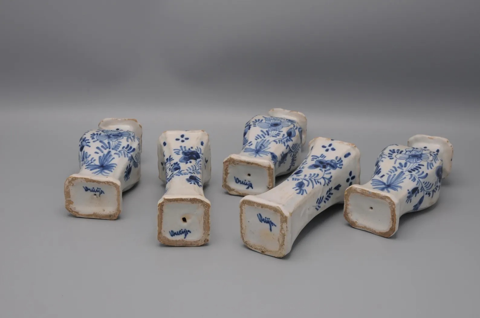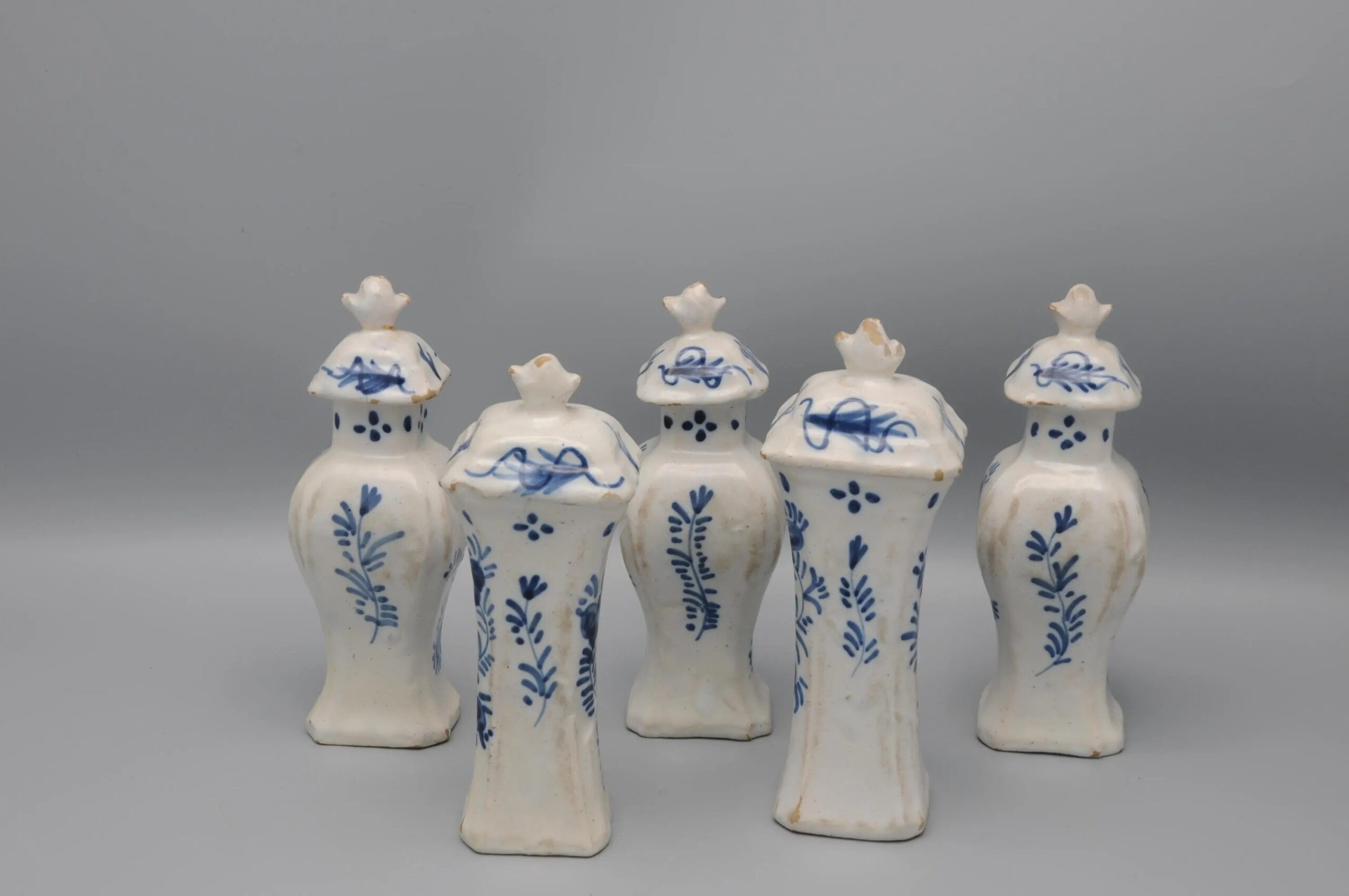Set of 5 miniature Delftware vases forming a cupboard garniture for a dollhouse. Most likely 19th century