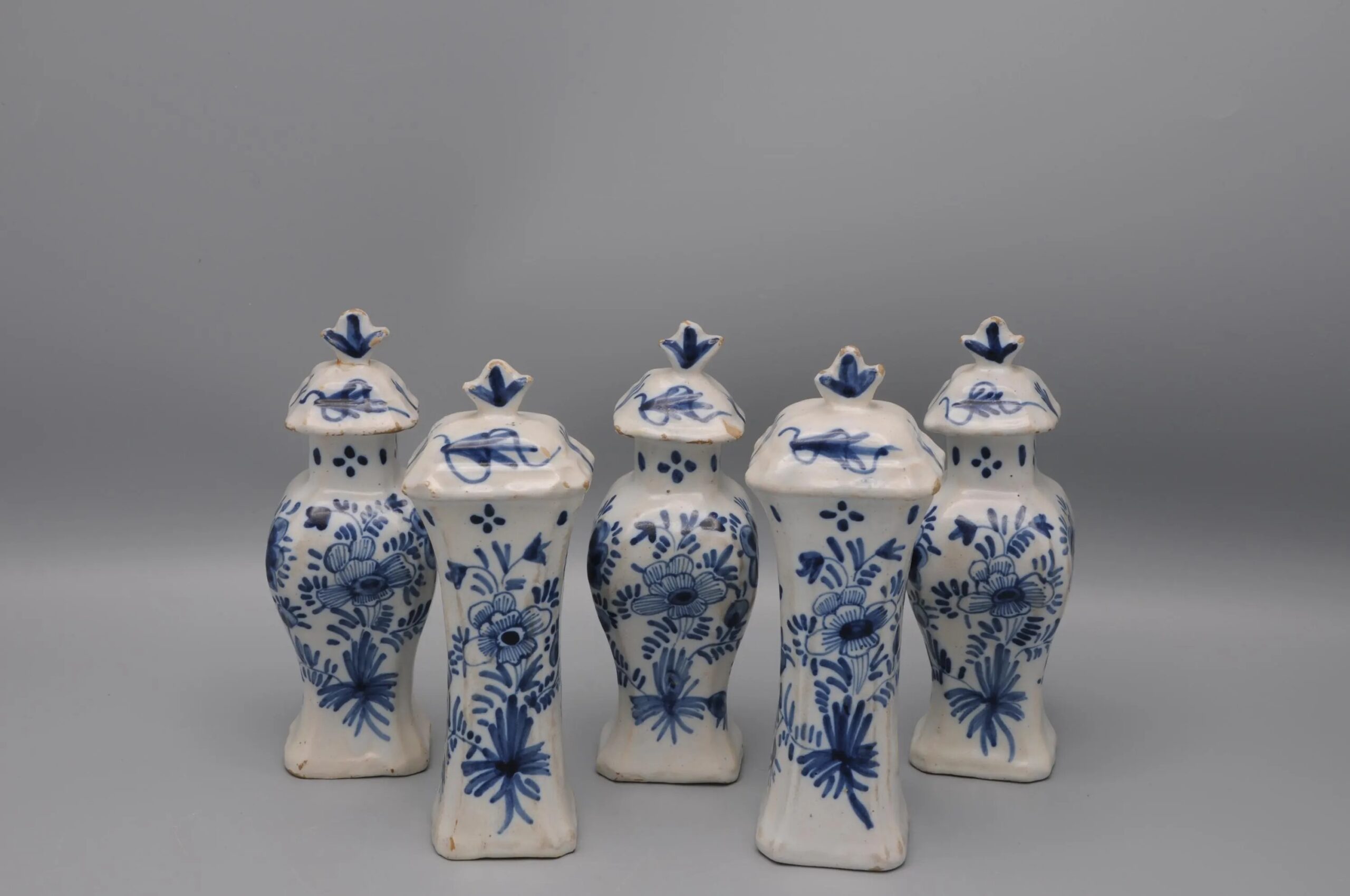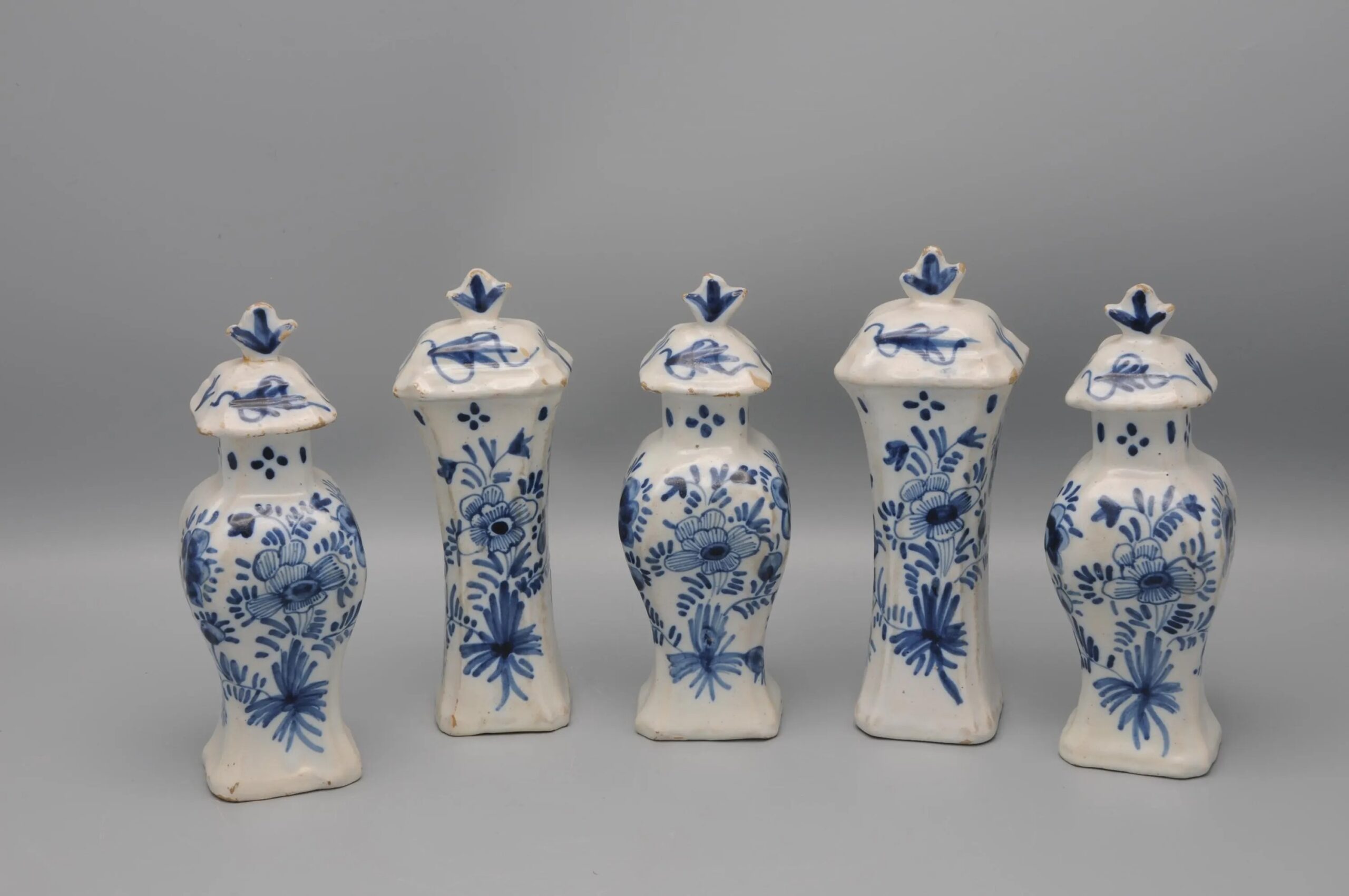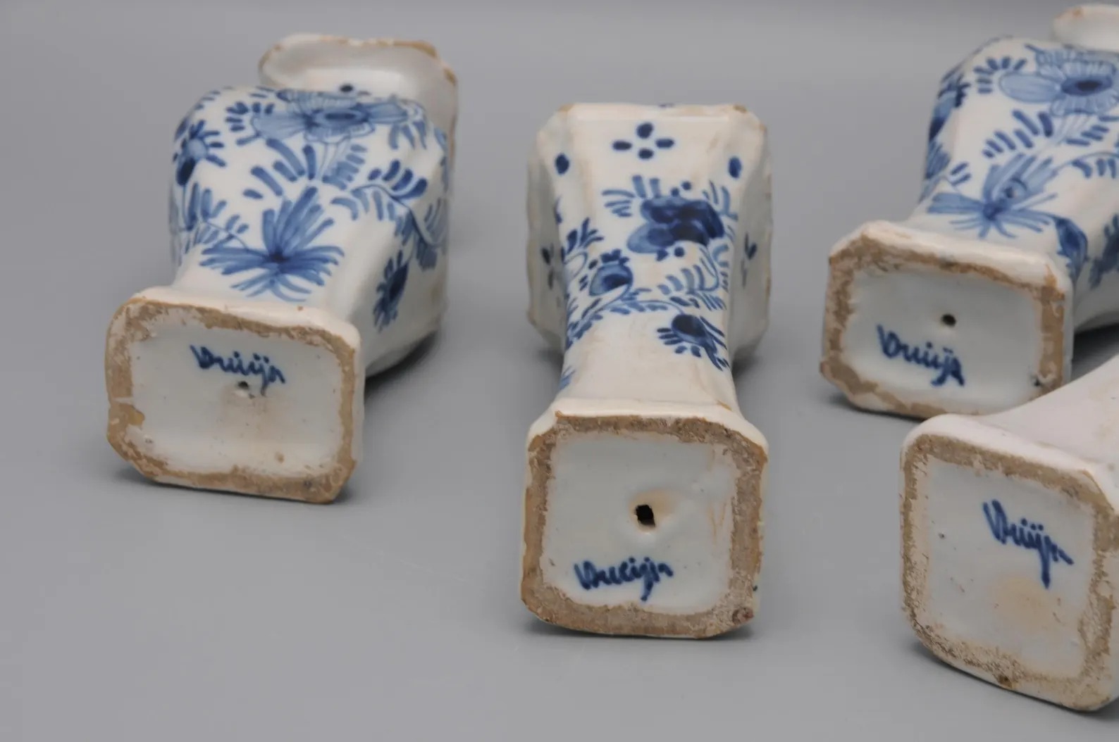 Set of 5 miniature Delftware vases forming a cupboard garniture for a dollhouse. Most likely 19th century
