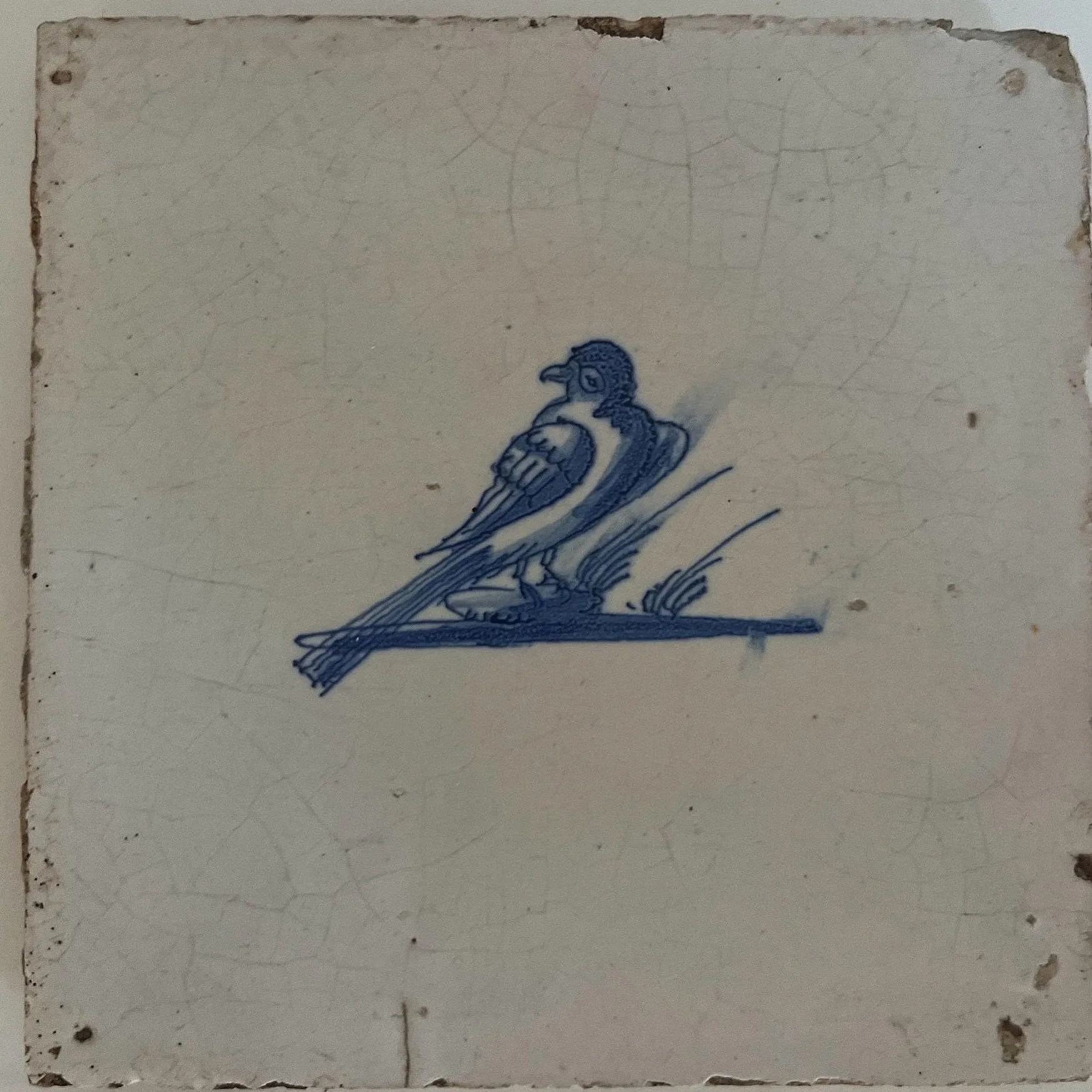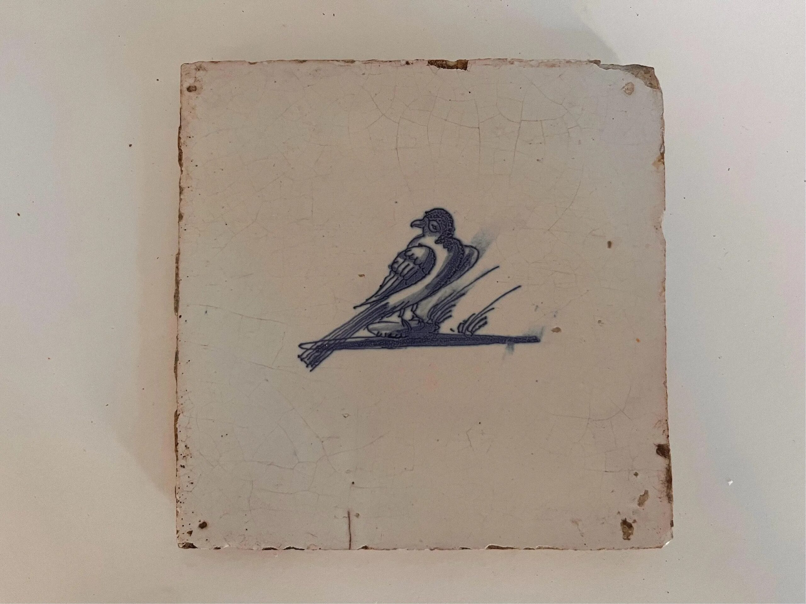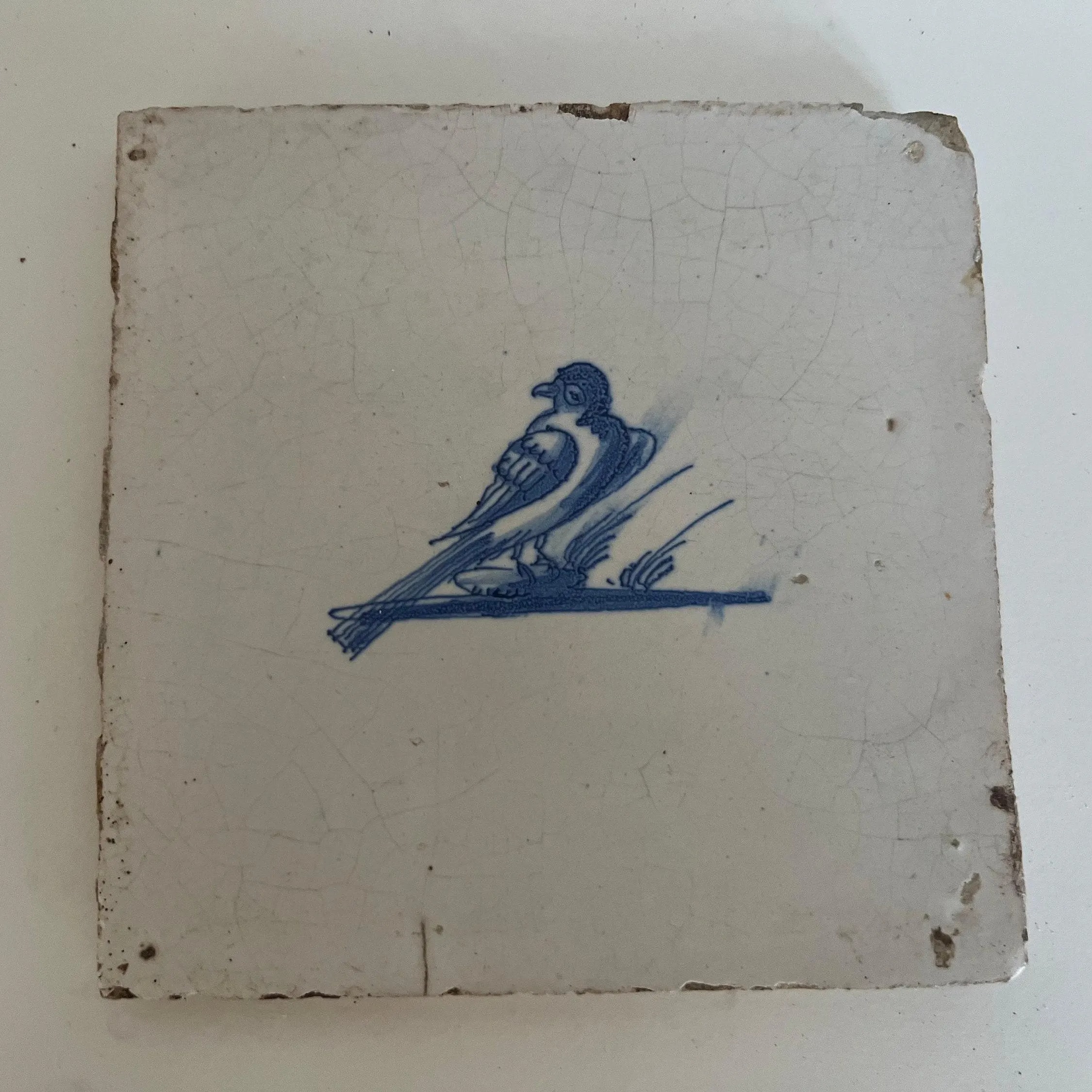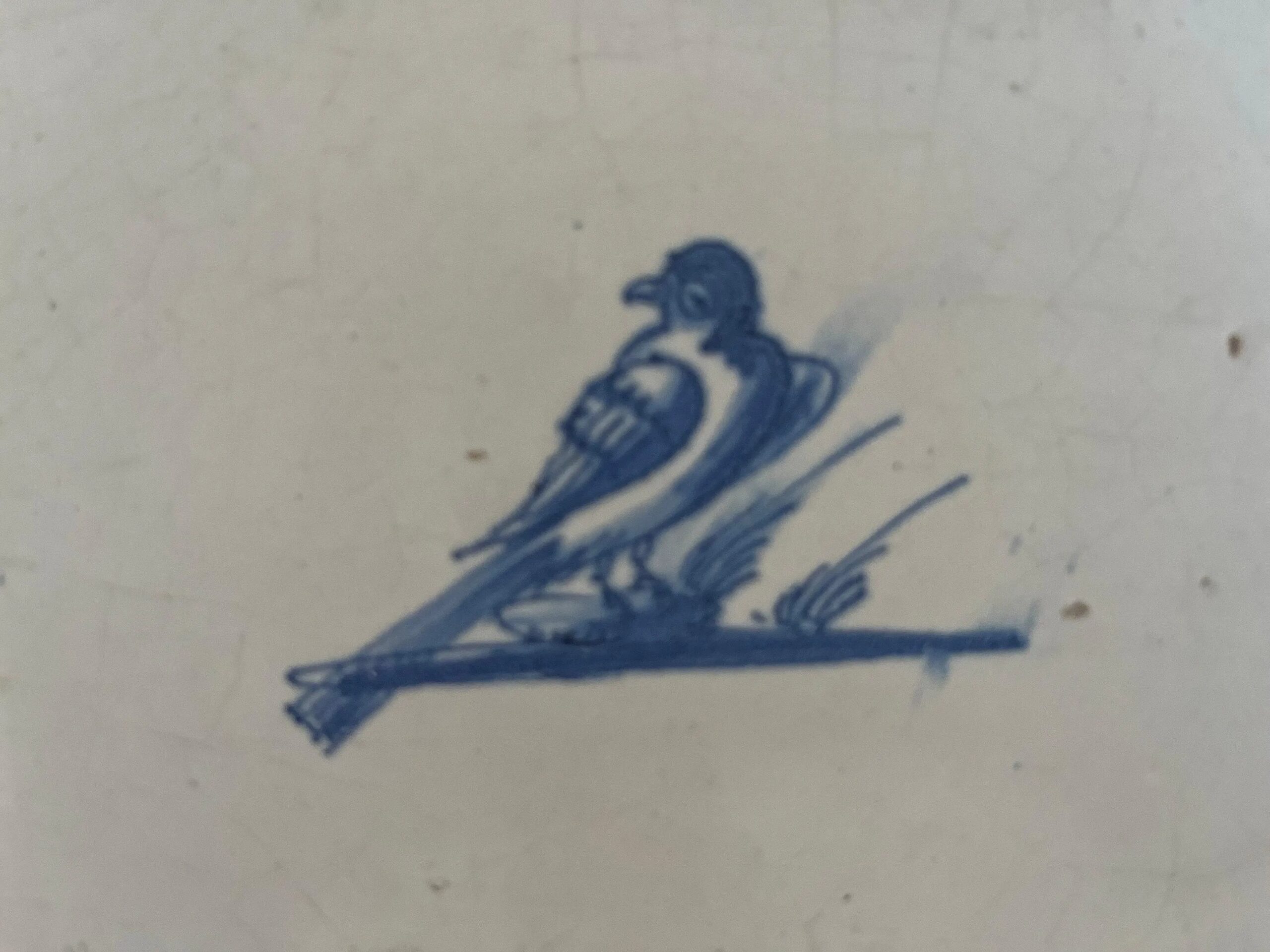 Rare early 17th century Dutch Delft tile with a lovely decoration of a bird on a rock. No corner decoration.