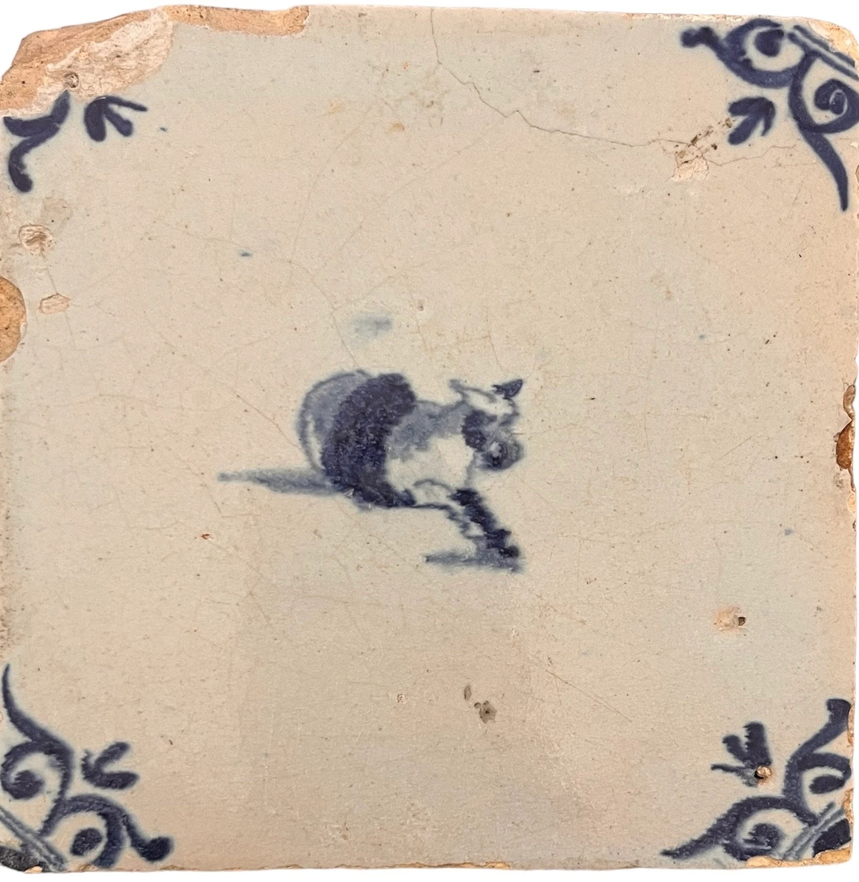 Rare 17th century Dutch Delft tile with a lovely decoration of some sort of sea creature. The front of the animal is like a cow, but the body ends in a swirling tail.
