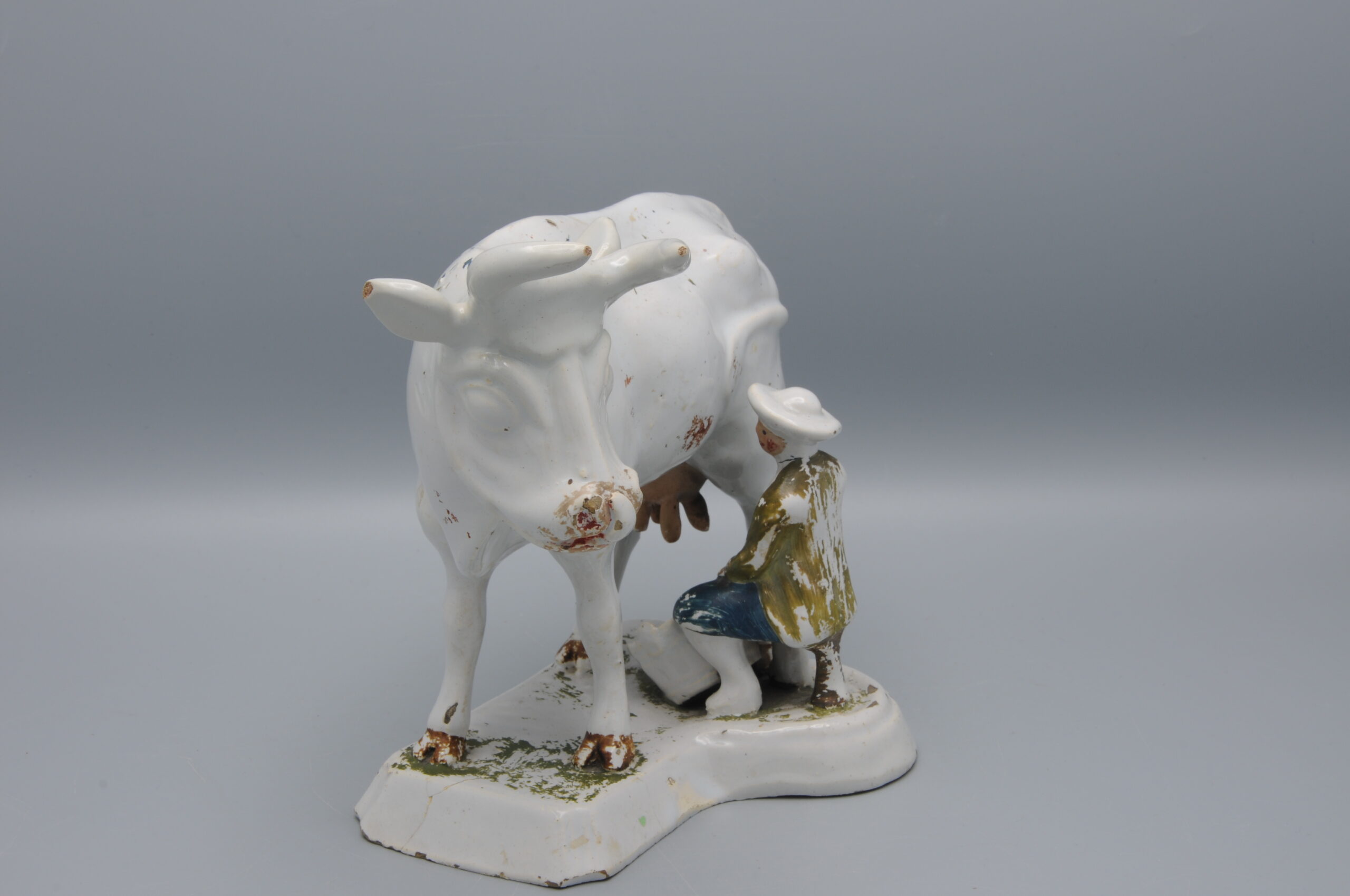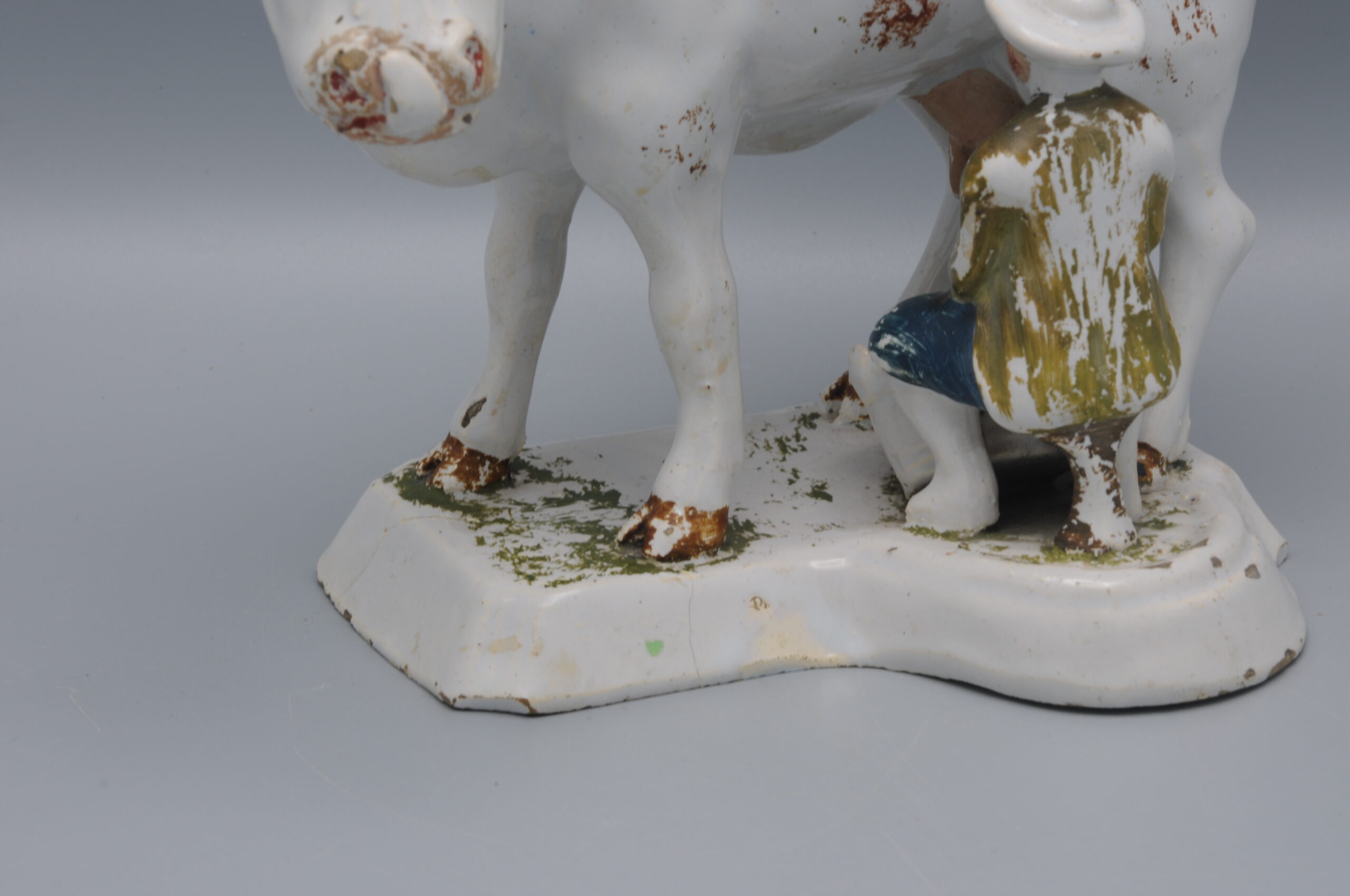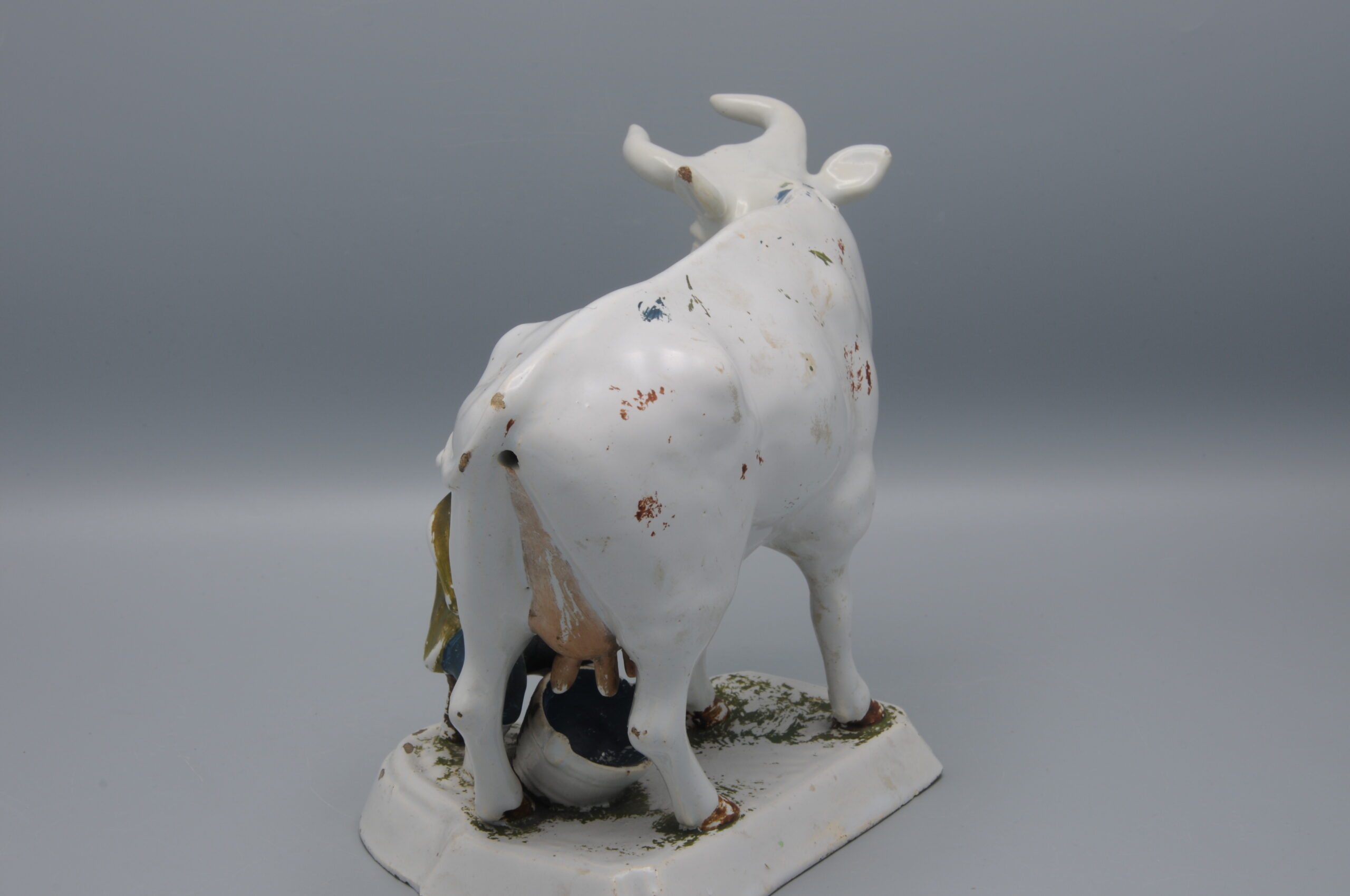 Cold-painted decoration, applied after firing, remain on the cow and the milker, with possible of original floral details or color accents. The modeling follows typical Delft characteristics with defined proportions and a compact stance.