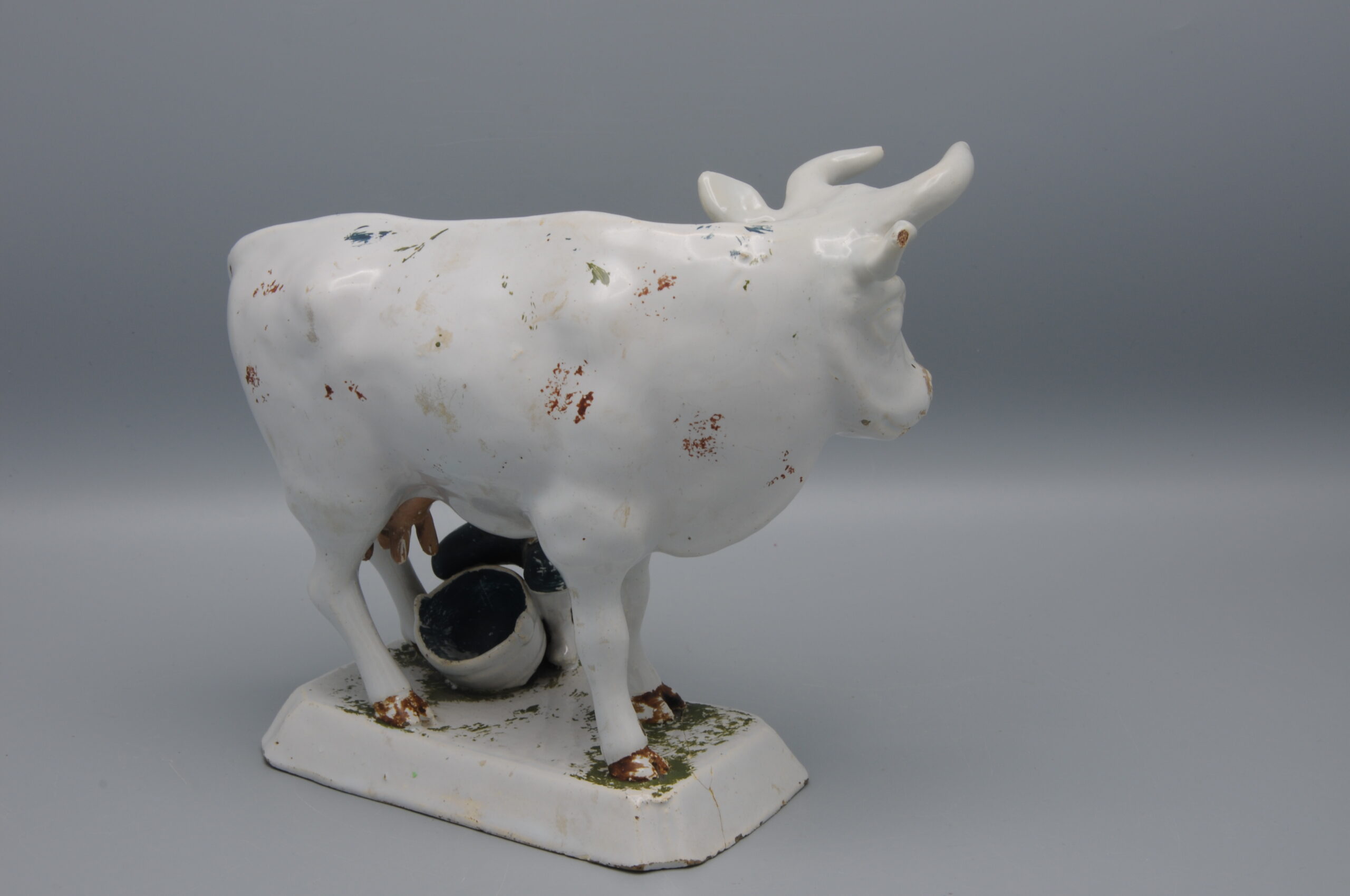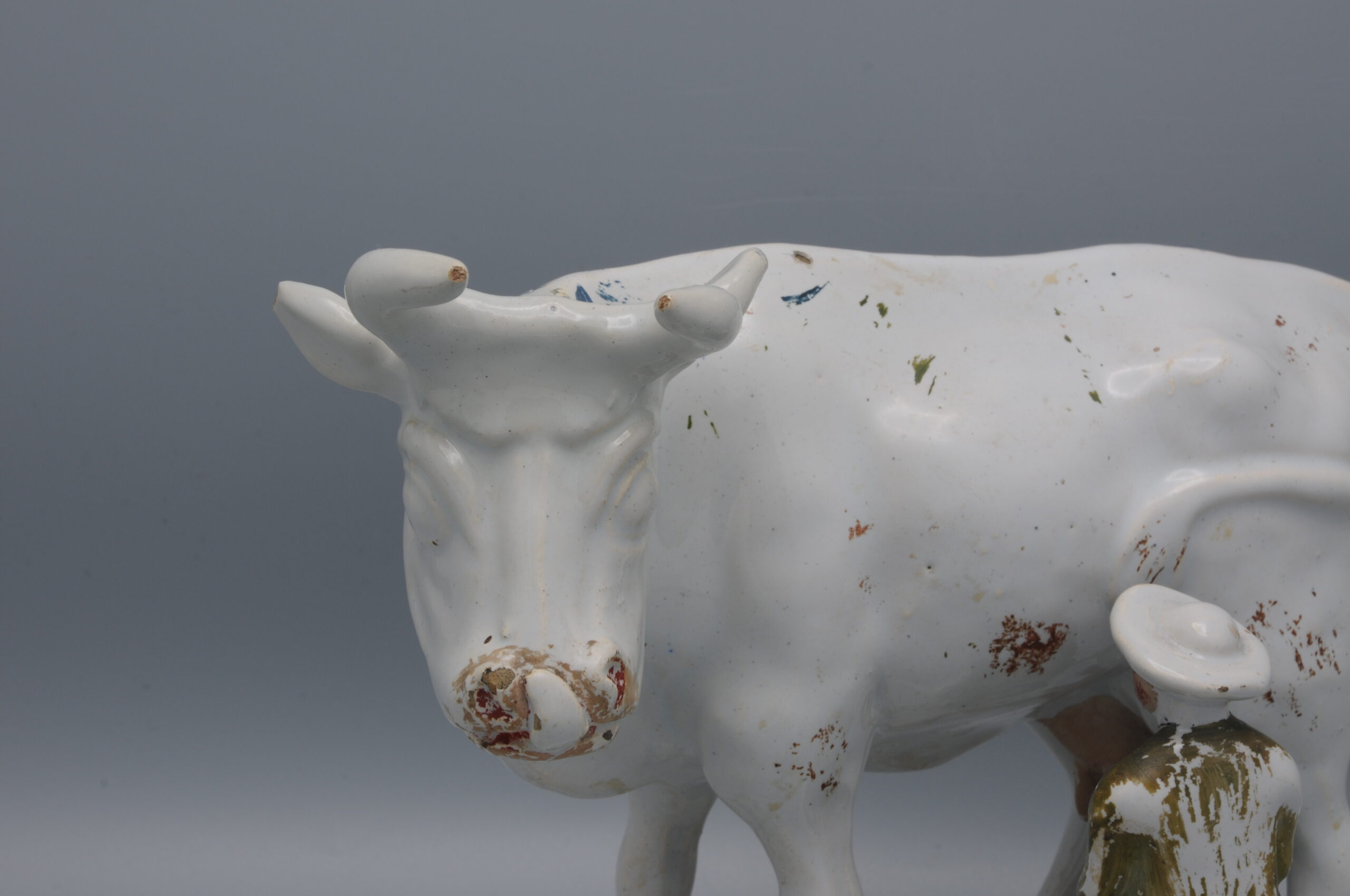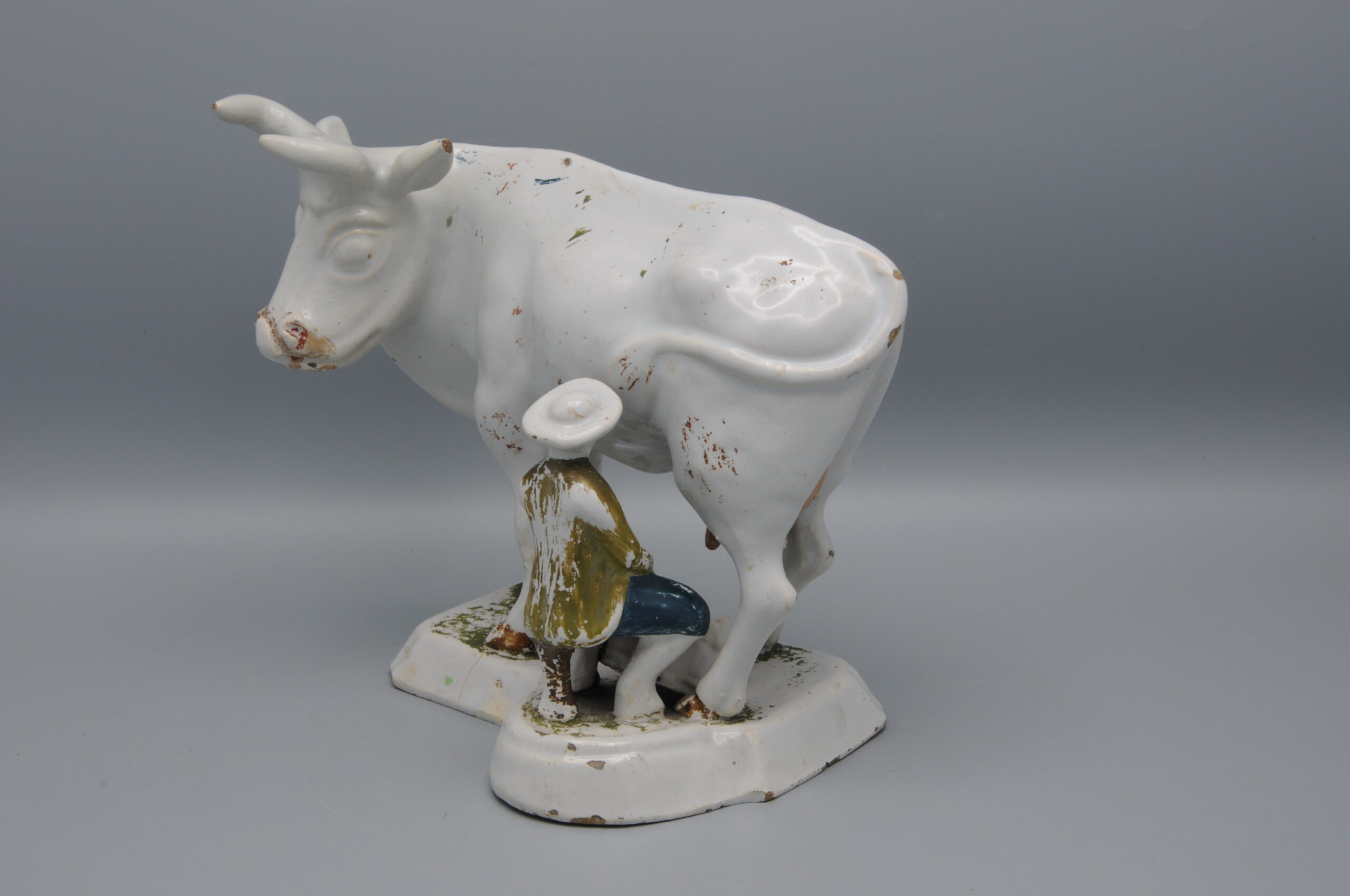 Cold-painted decoration, applied after firing, remain on the cow and the milker, with possible of original floral details or color accents. The modeling follows typical Delft characteristics with defined proportions and a compact stance.