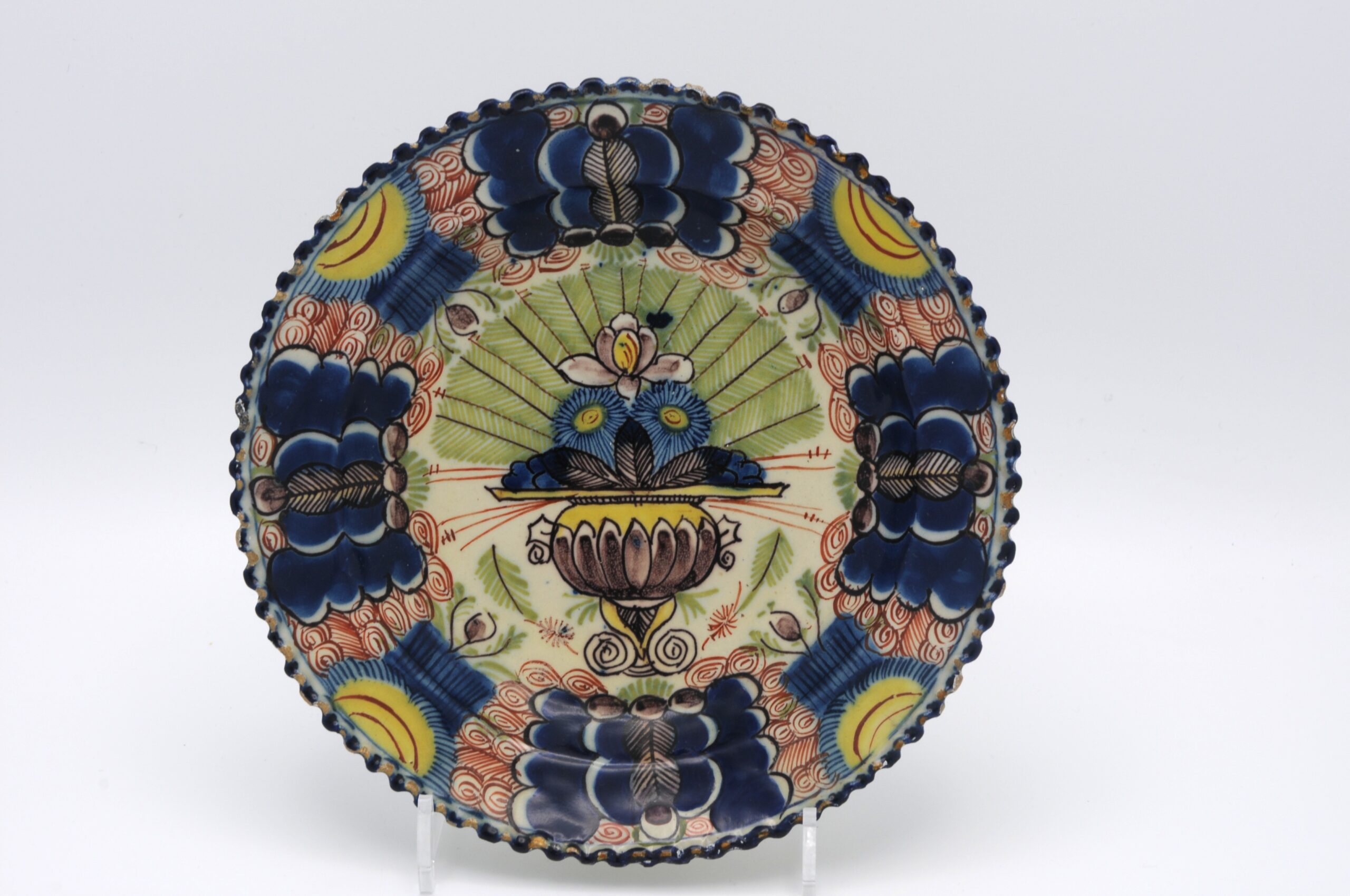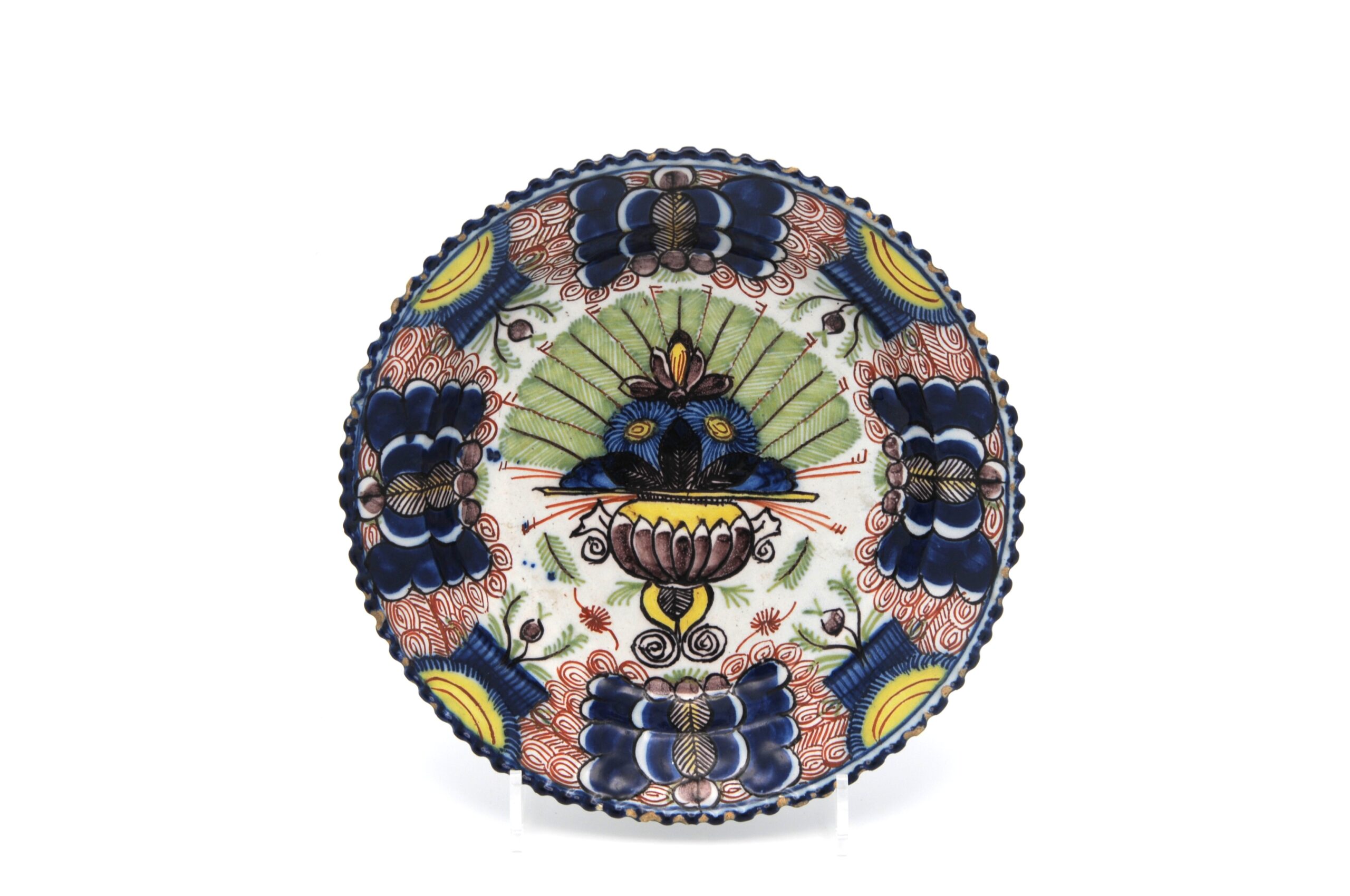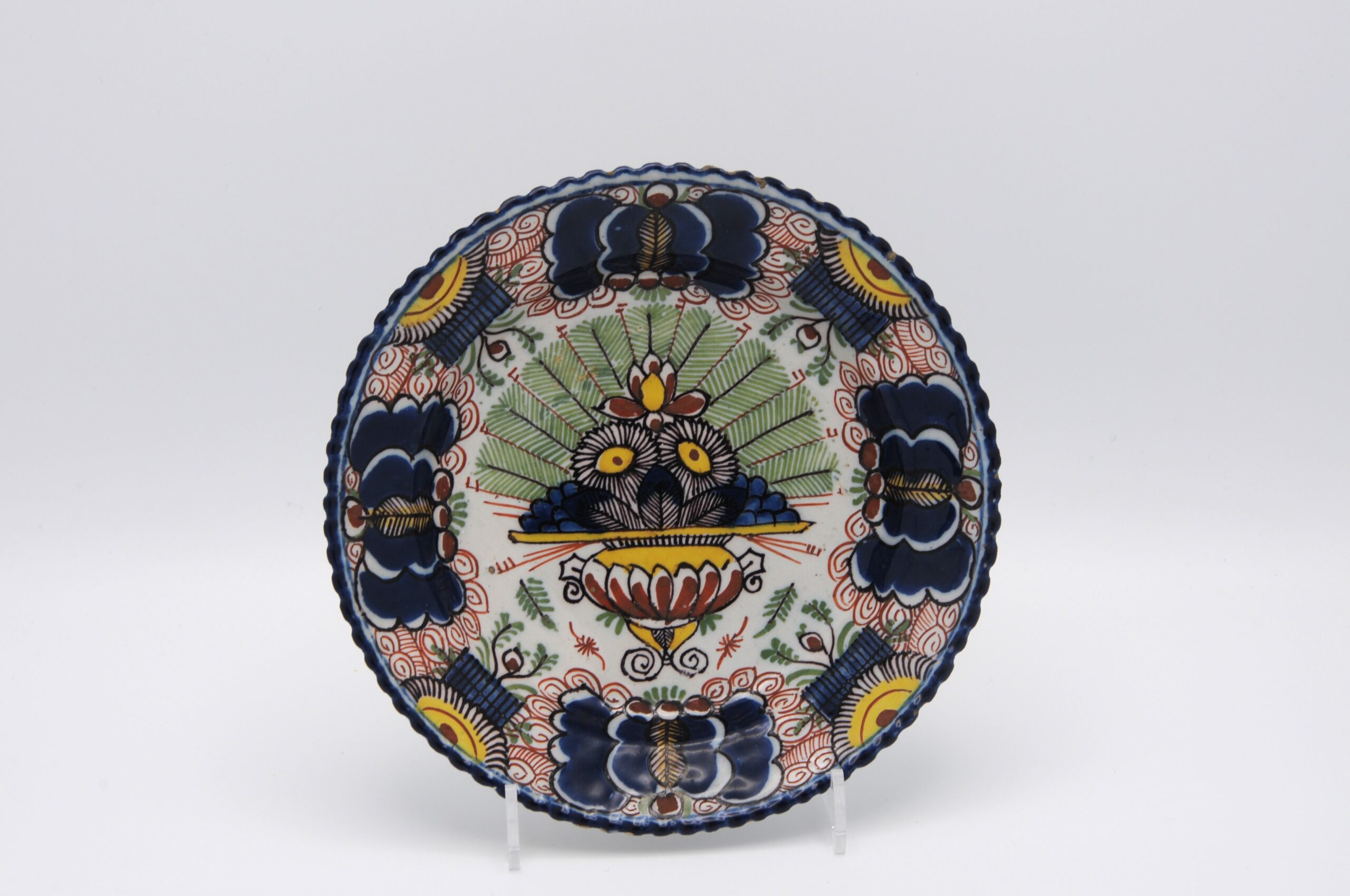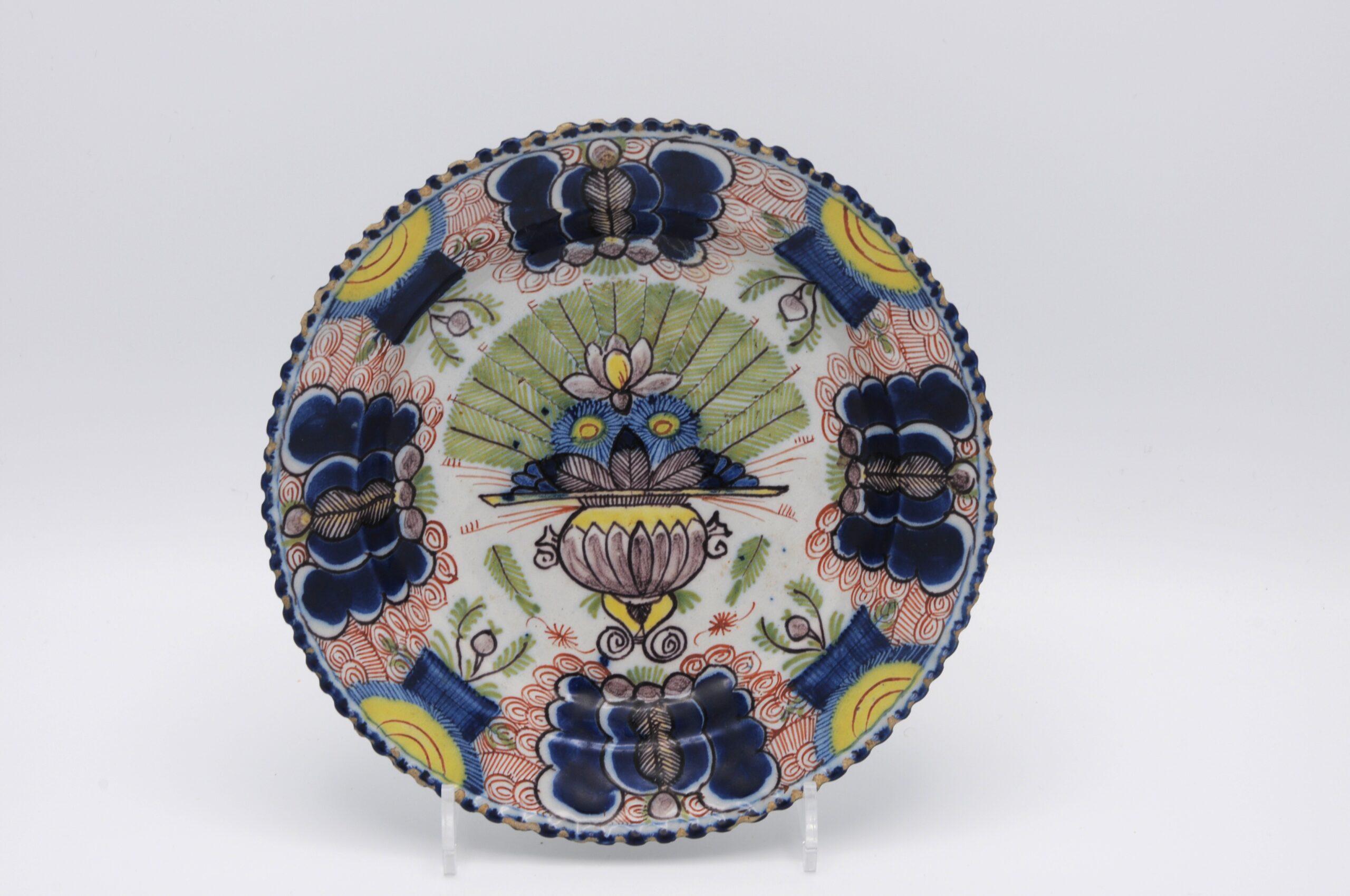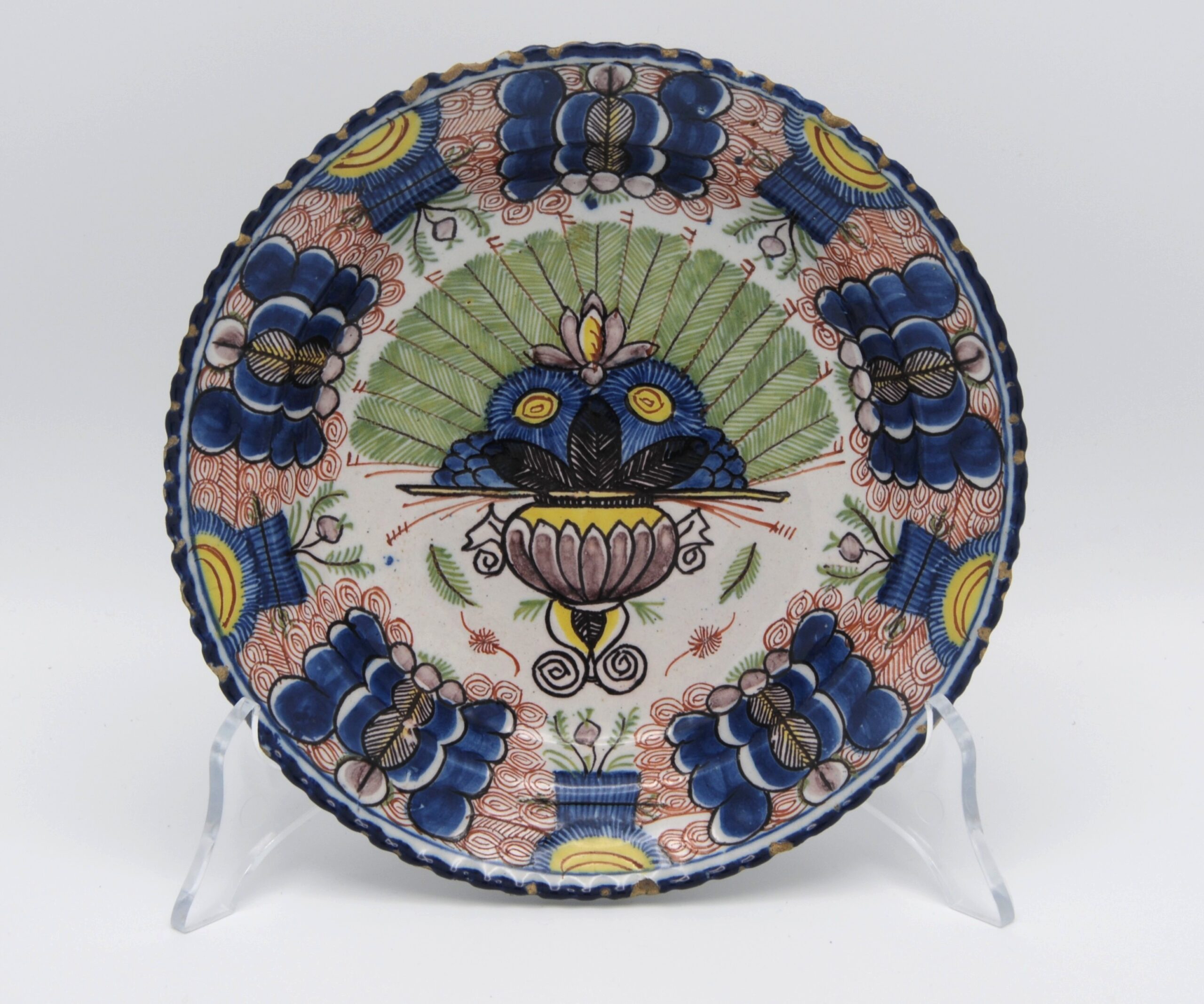 These polychrome Delft plates, are fine examples of 18th-century Delftware, featuring a central urn containing a fan of peacock feathers with stylized floral elements, painted in cobalt blue on a white tin-glazed earthenware surface. The rim has scrolling patterns with small floral motifs and an ocre-colored border, typical of European decorative pottery from this period.
