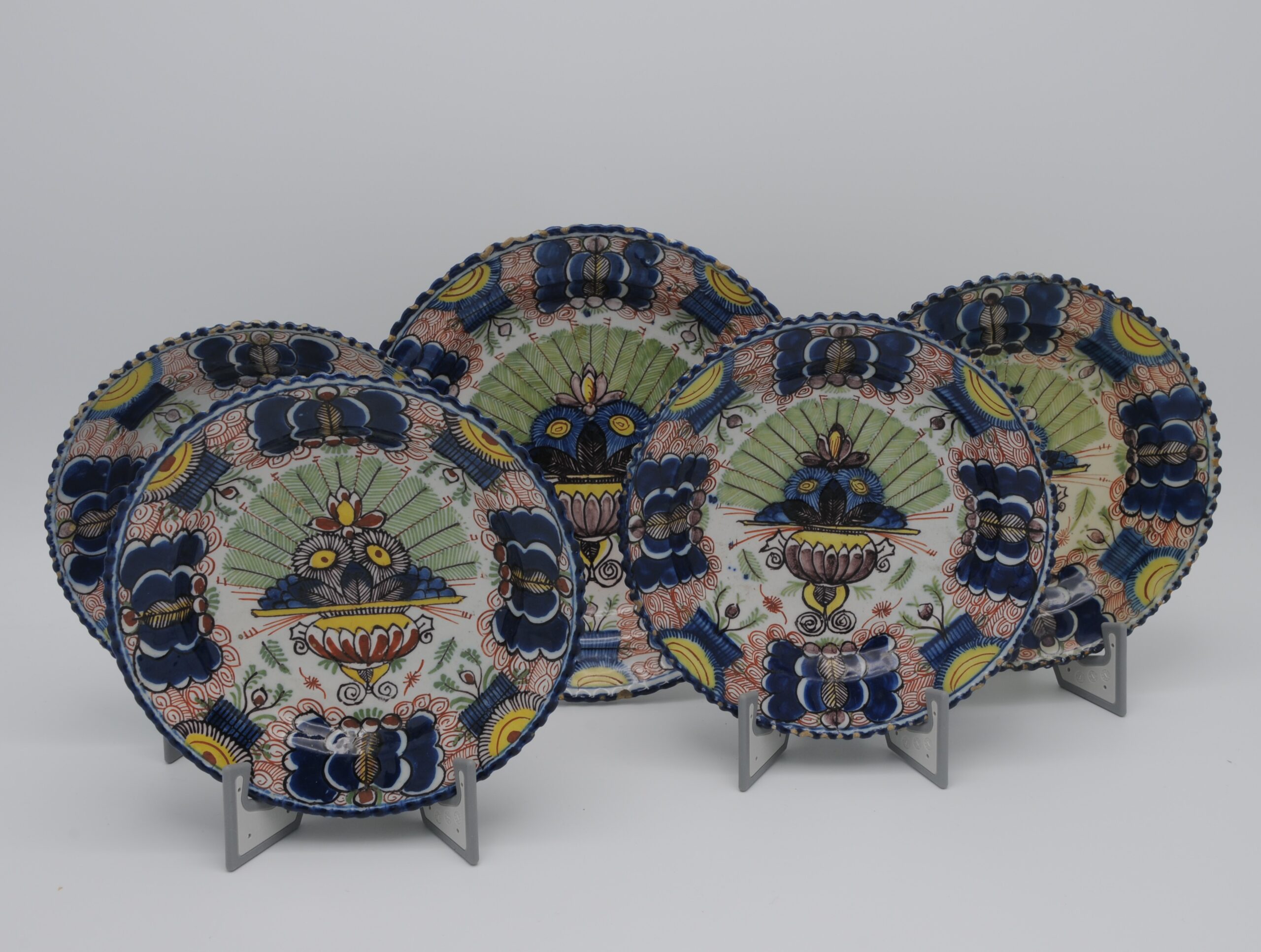 Group of 5 small Dutch Delft polychrome ‘Peacock’ plates, De Klaauw factory, second half 18th century.