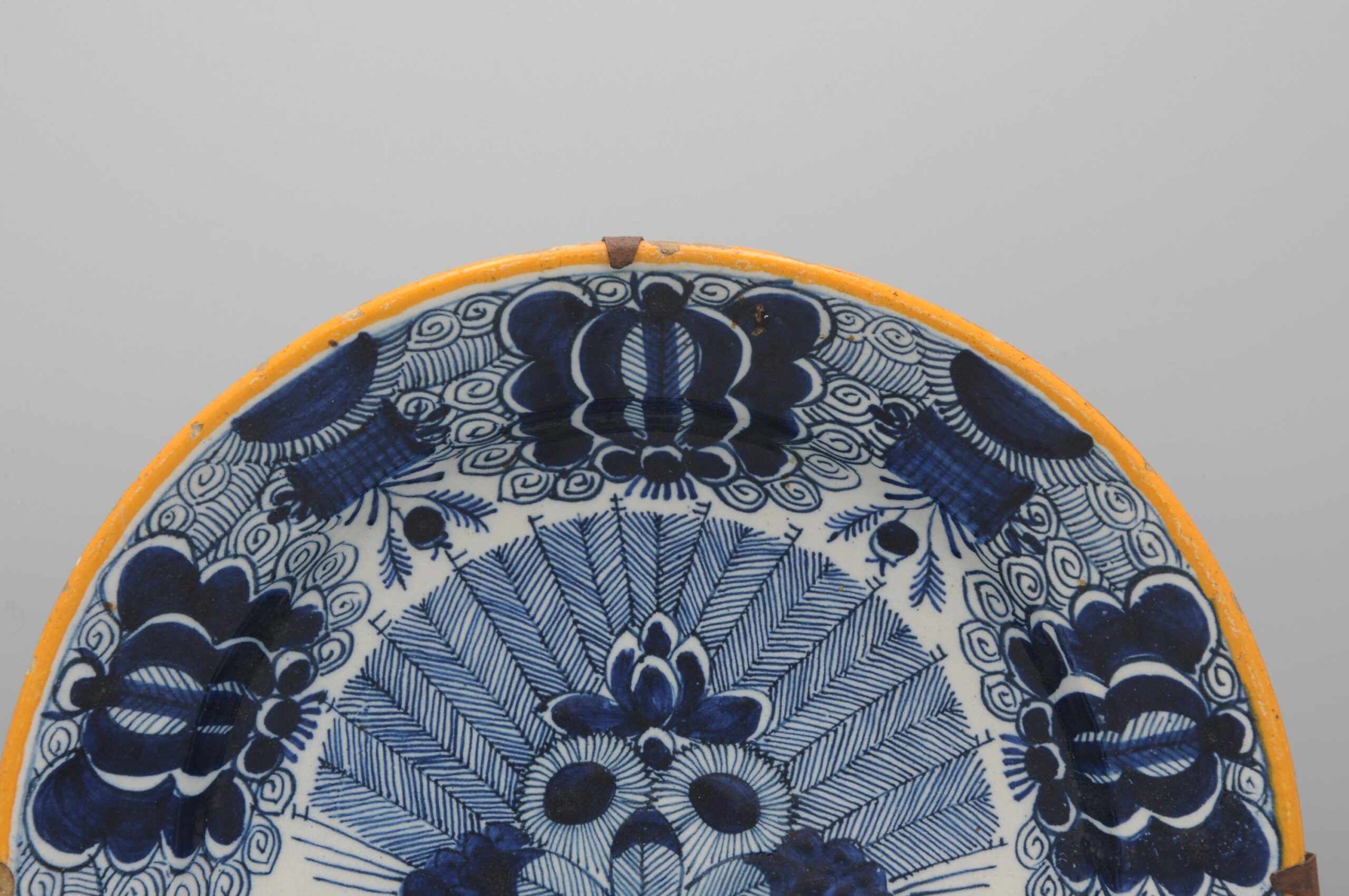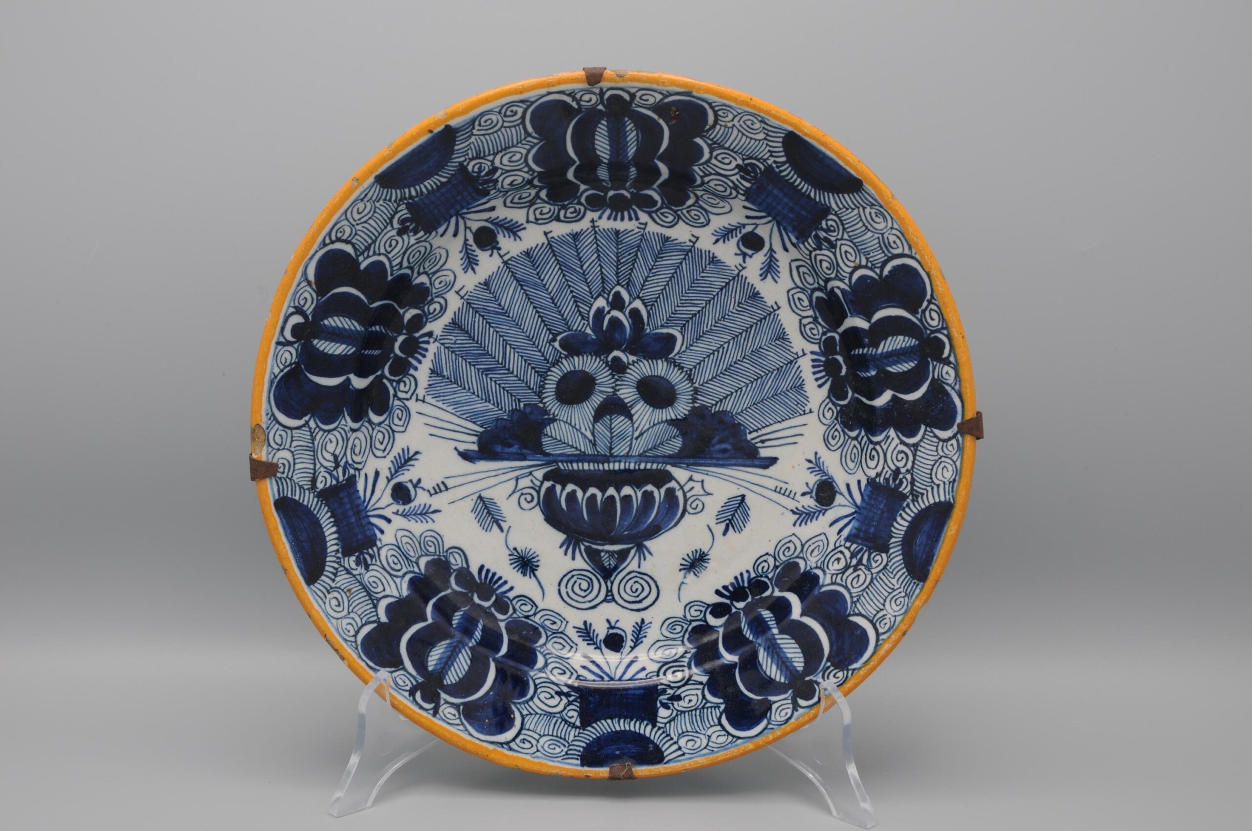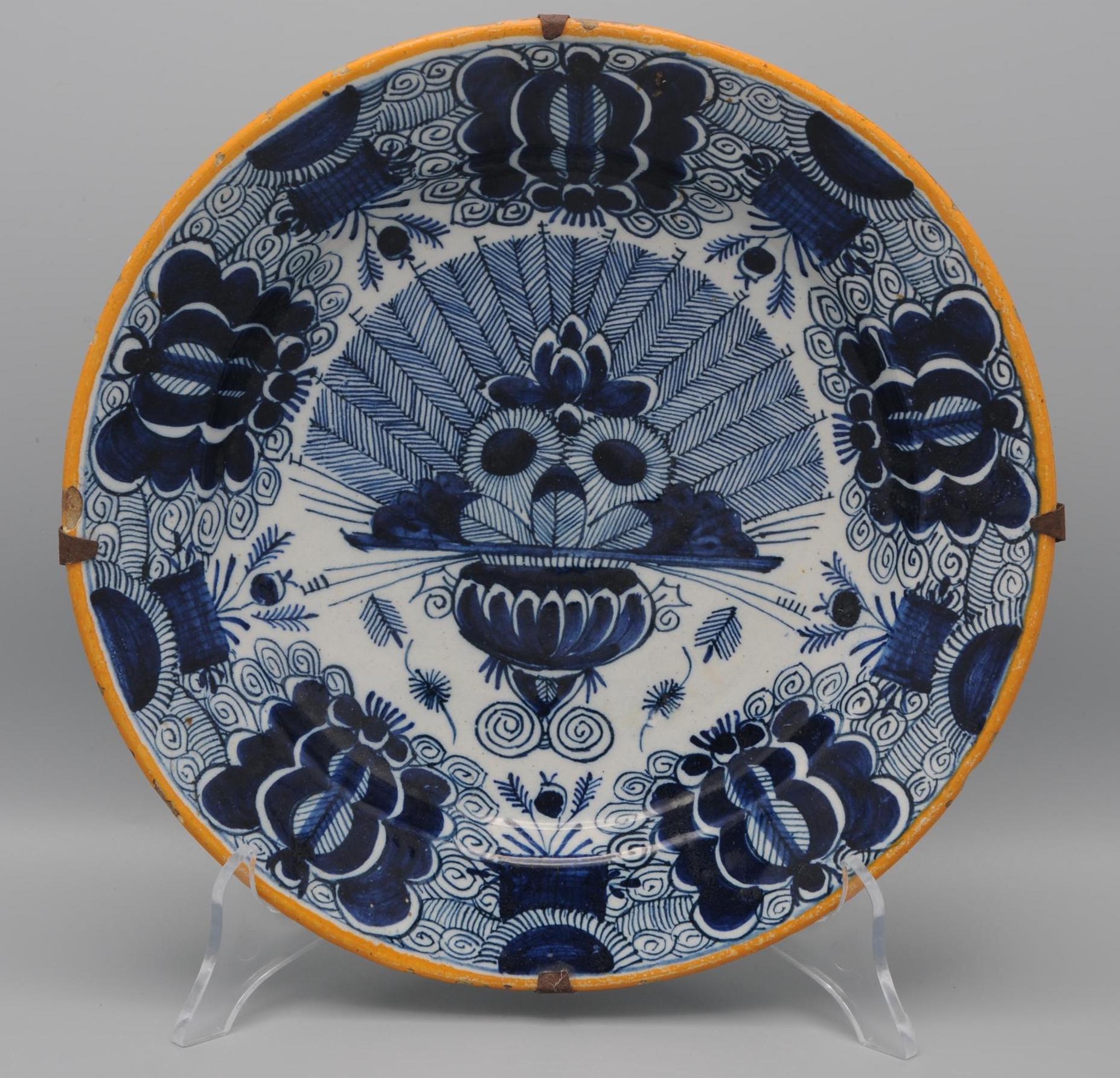 Dutch Delft blue and white ‘Peacock’ plate, 18th century, with ochre rim, the center decorated in cobalt with a vase containing an arrangement of peacock feathers and flowers. The rim decorated with stylized flower heads against a scrolling ground.