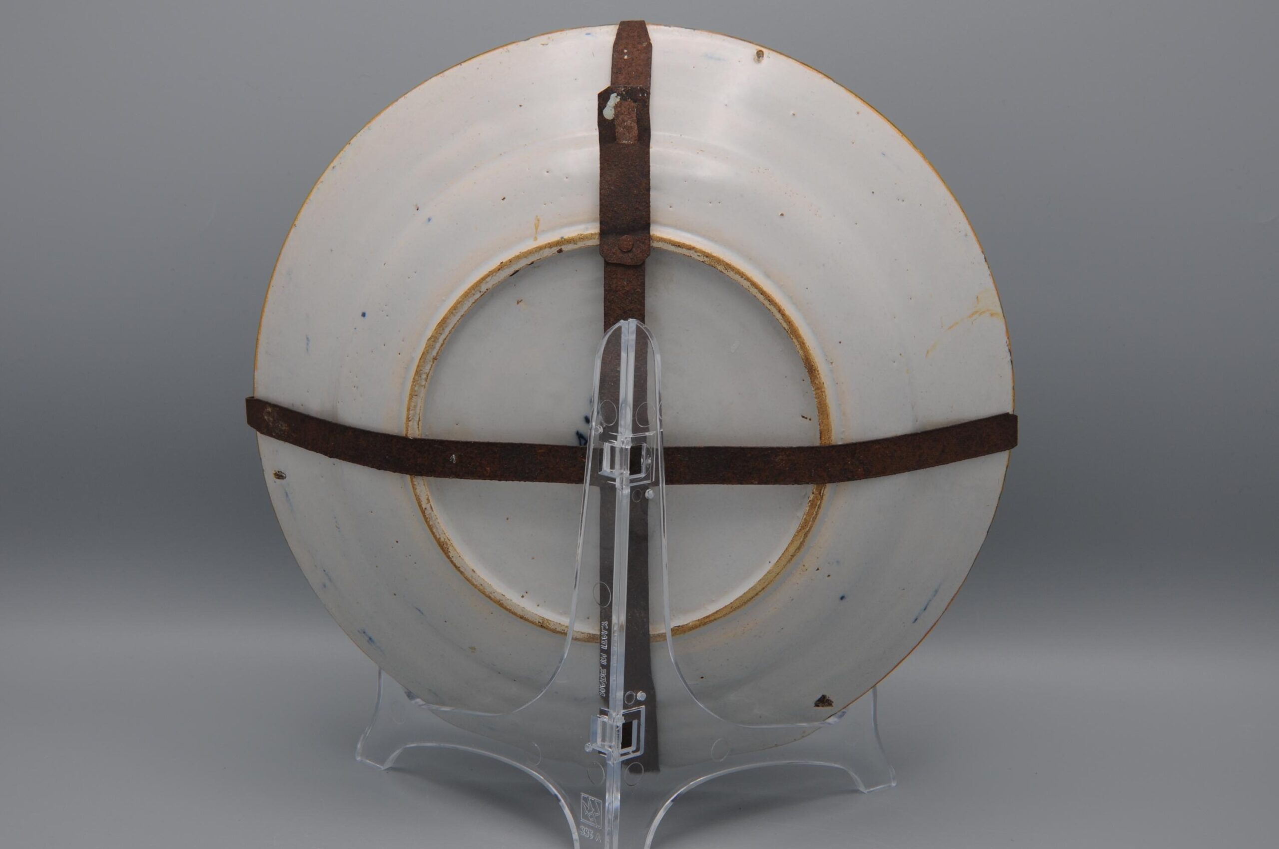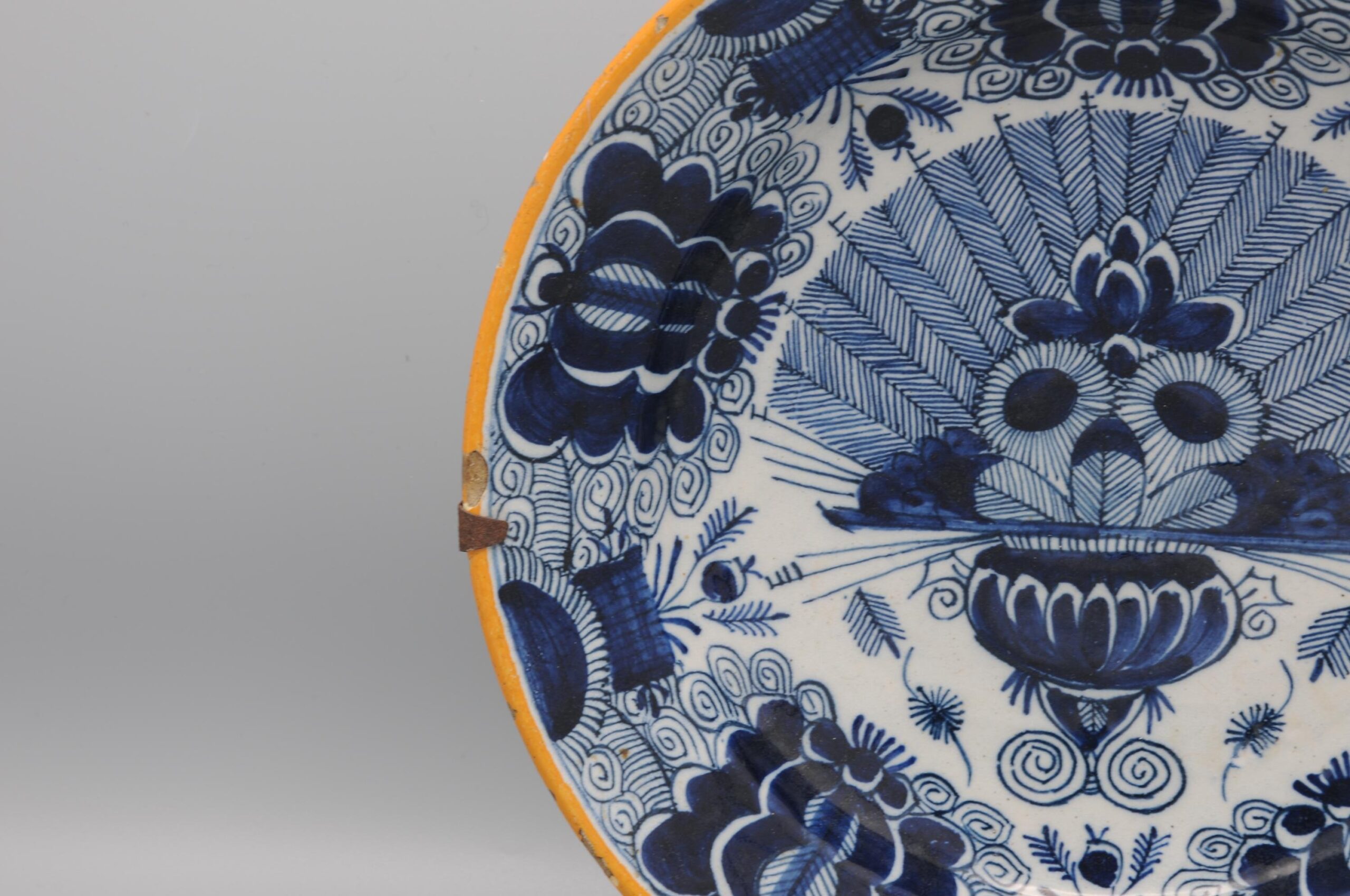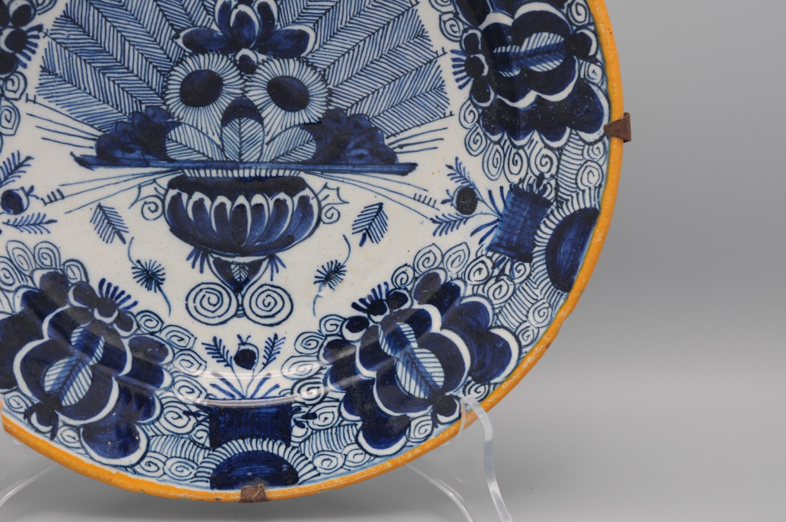 Dutch Delft blue and white ‘Peacock’ plate, 18th century, with ochre rim, the center decorated in cobalt with a vase containing an arrangement of peacock feathers and flowers. The rim decorated with stylized flower heads against a scrolling ground.