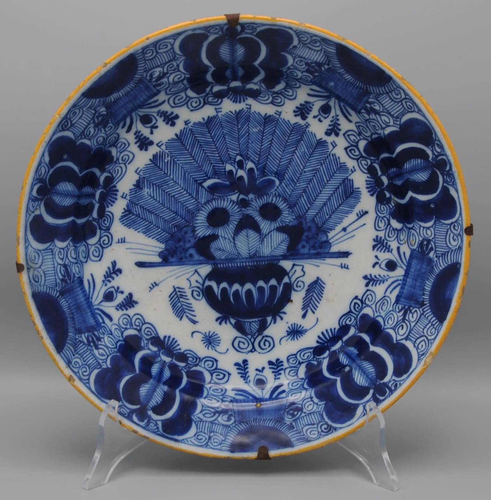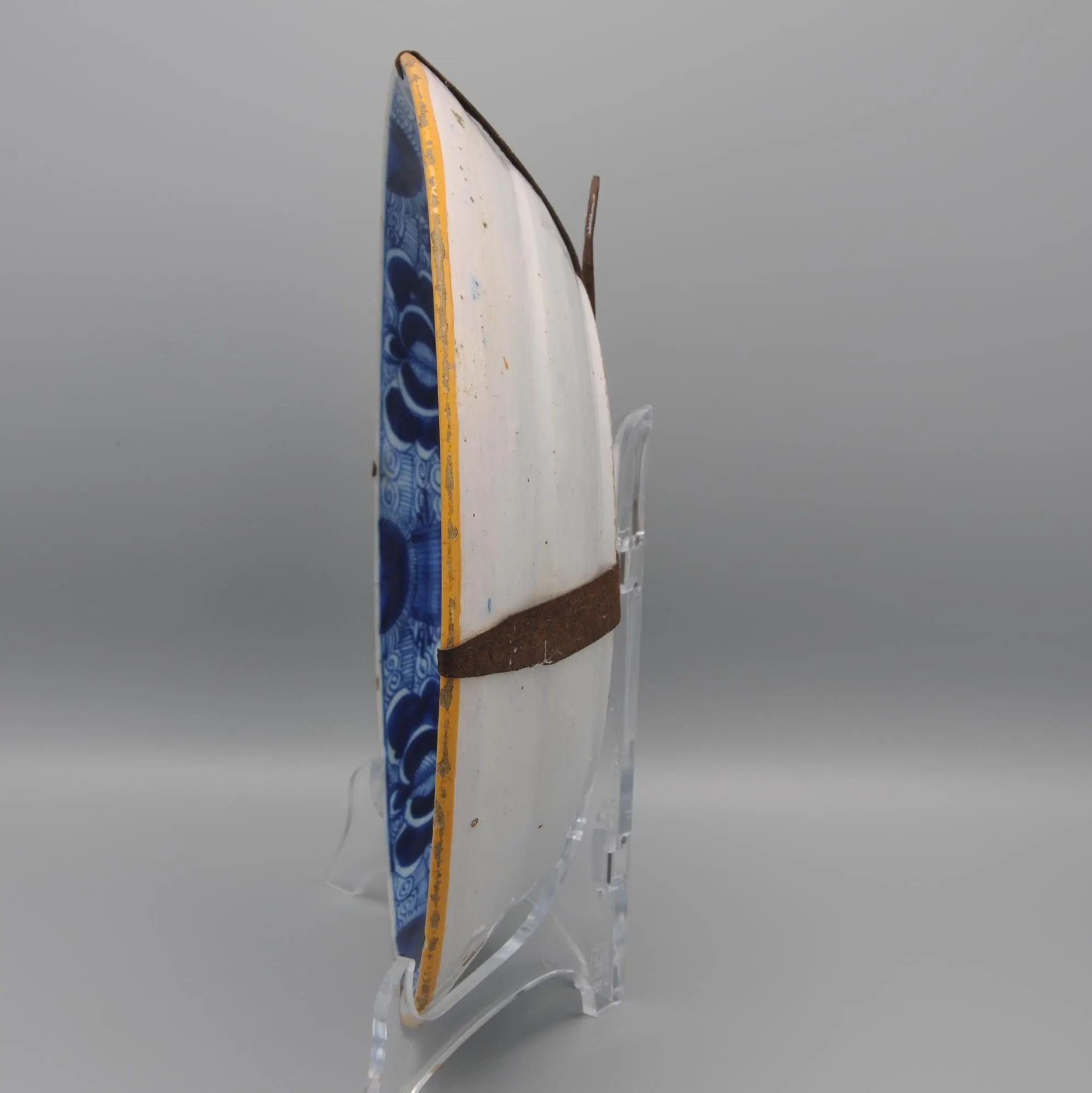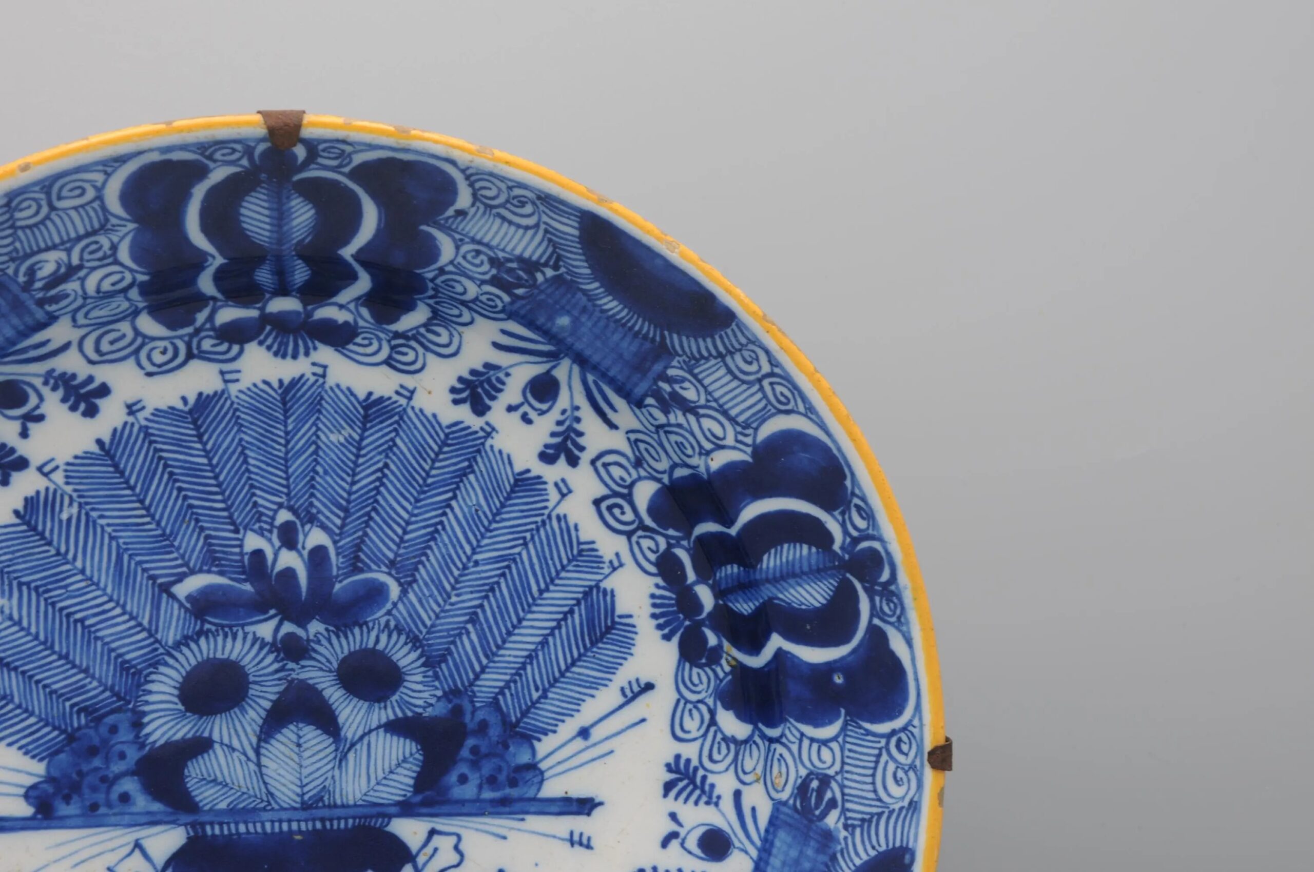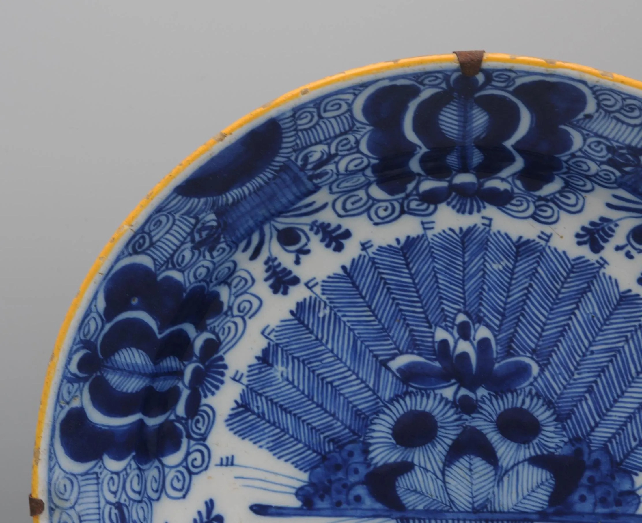 The plate is marked with the claw symbol (De Klaauw), one of the principal Delft factories active between 1661 and 1840. De Klaauw was renowned for its refined blue-and-white decoration, particularly the ‘Peacock’ (Pauwstaart) pattern, which became a hallmark of 18th-century Delft production and was widely collected both in the Netherlands and abroad.