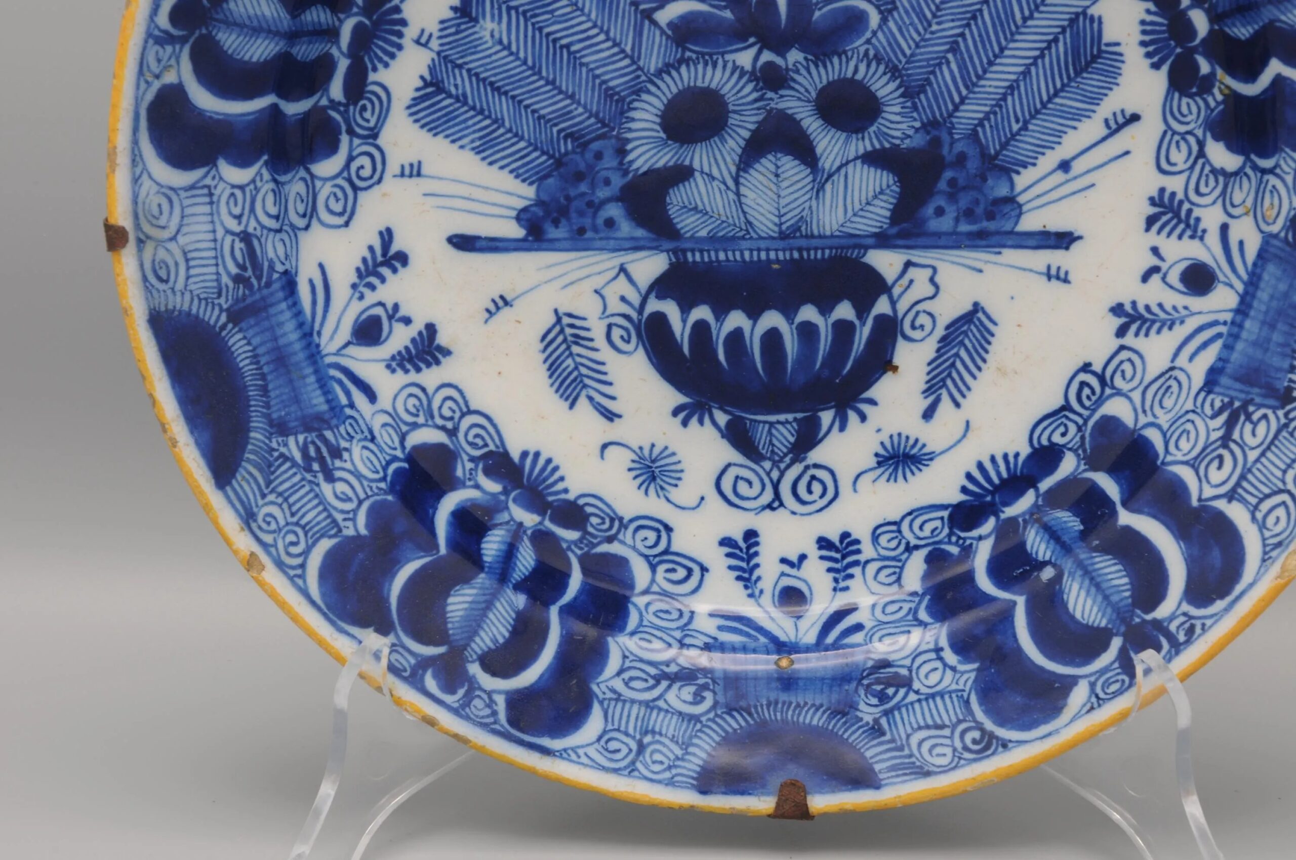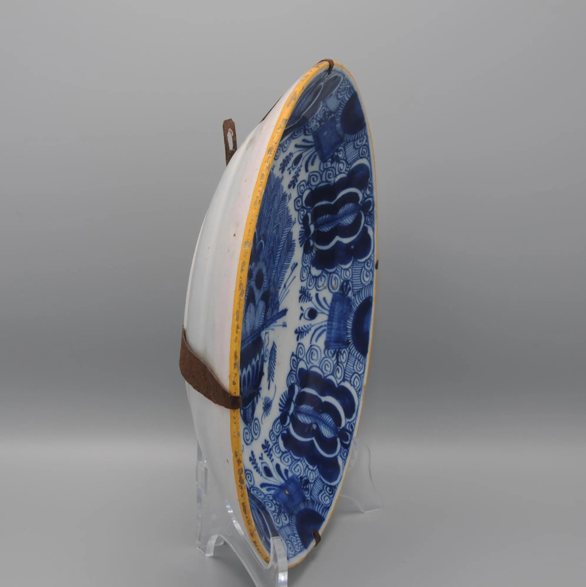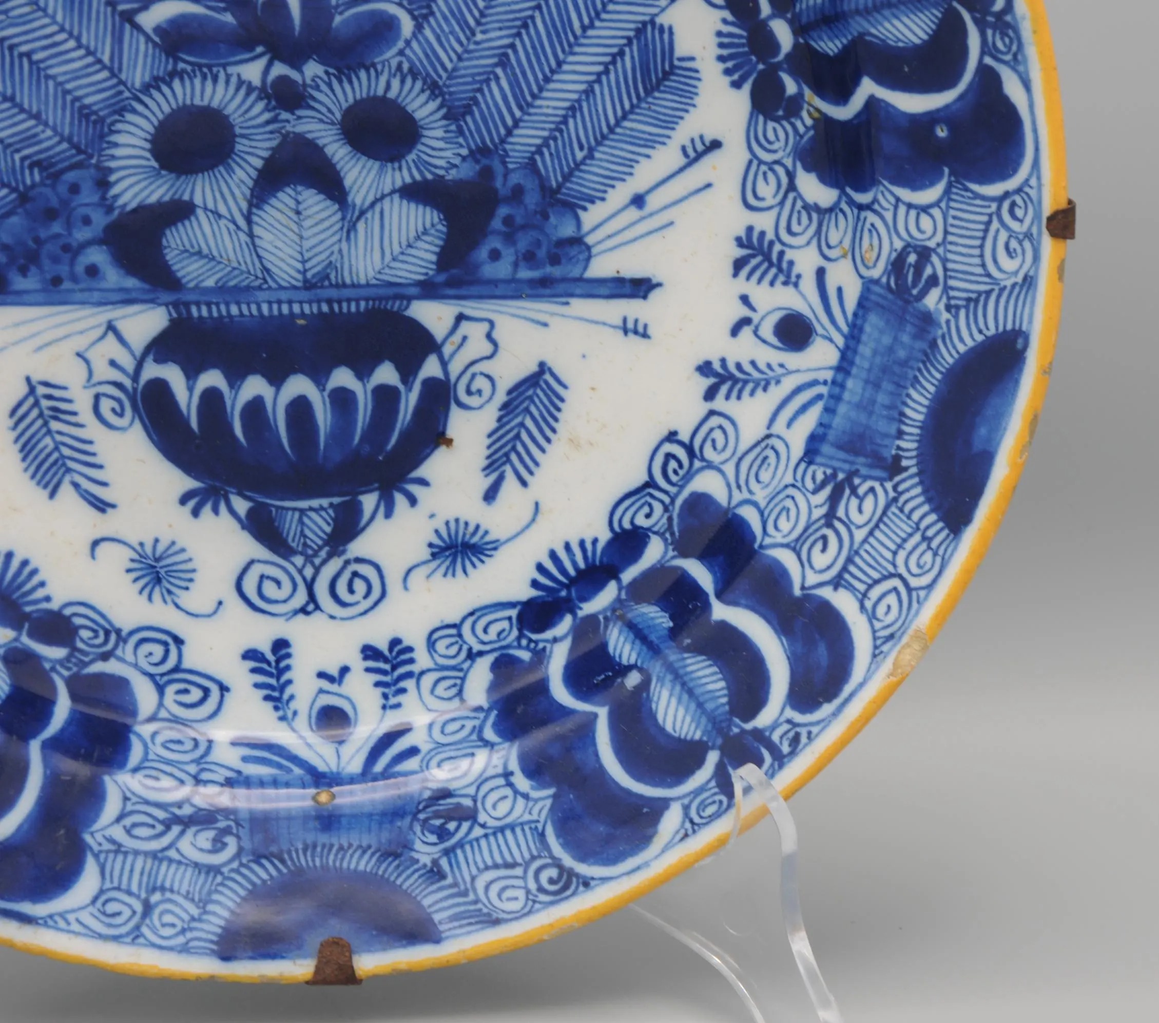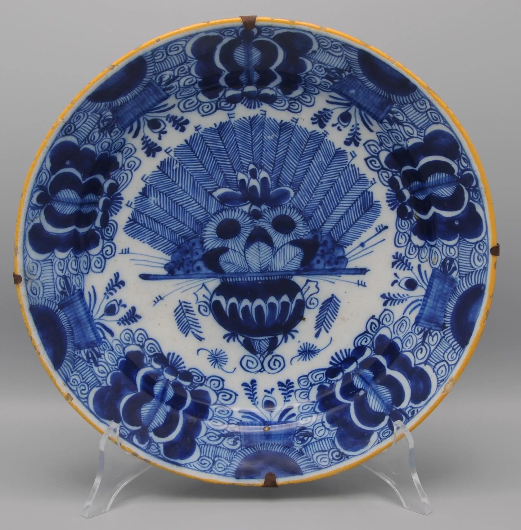 The plate is marked with the claw symbol (De Klaauw), one of the principal Delft factories active between 1661 and 1840. De Klaauw was renowned for its refined blue-and-white decoration, particularly the ‘Peacock’ (Pauwstaart) pattern, which became a hallmark of 18th-century Delft production and was widely collected both in the Netherlands and abroad.