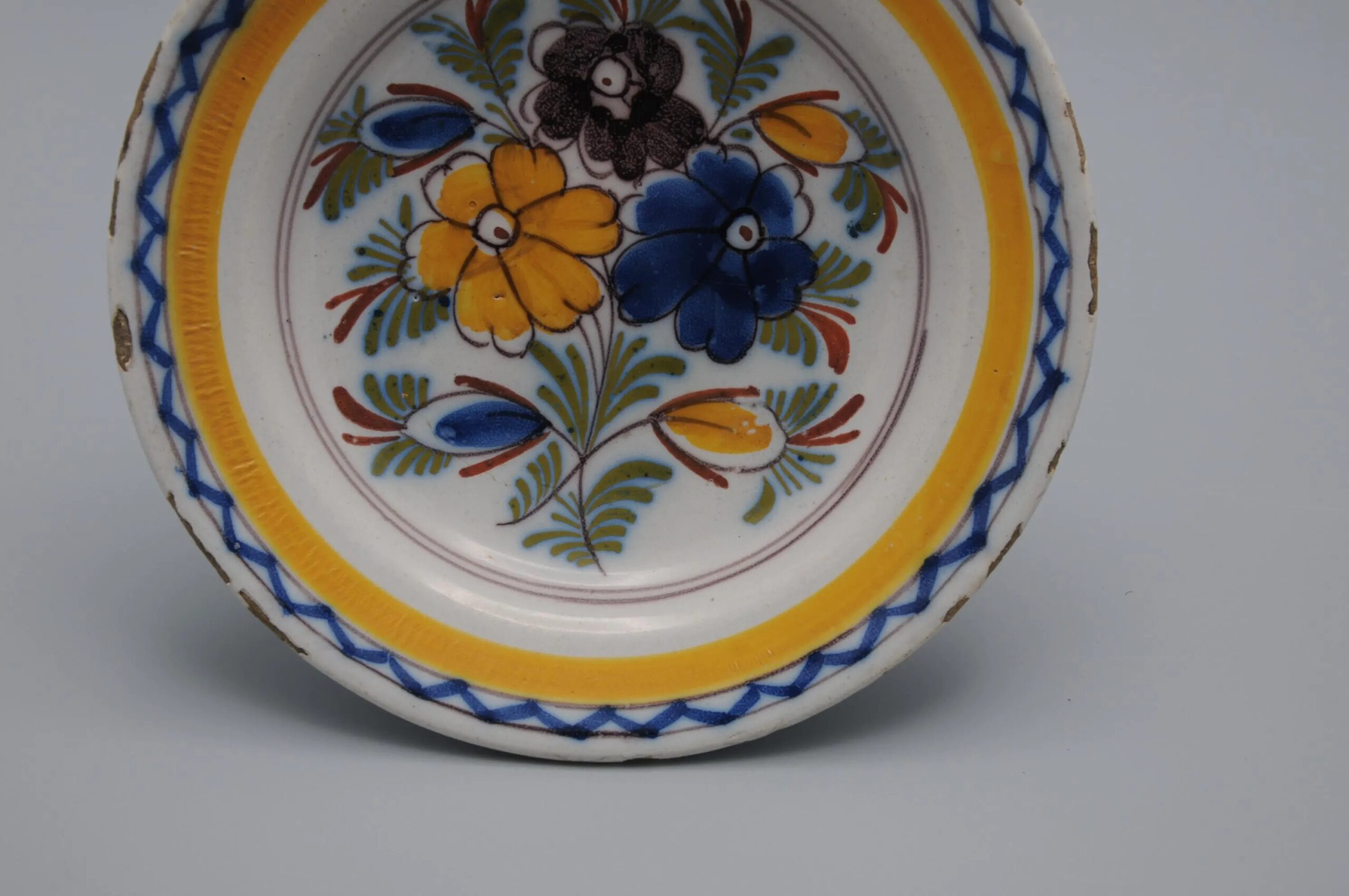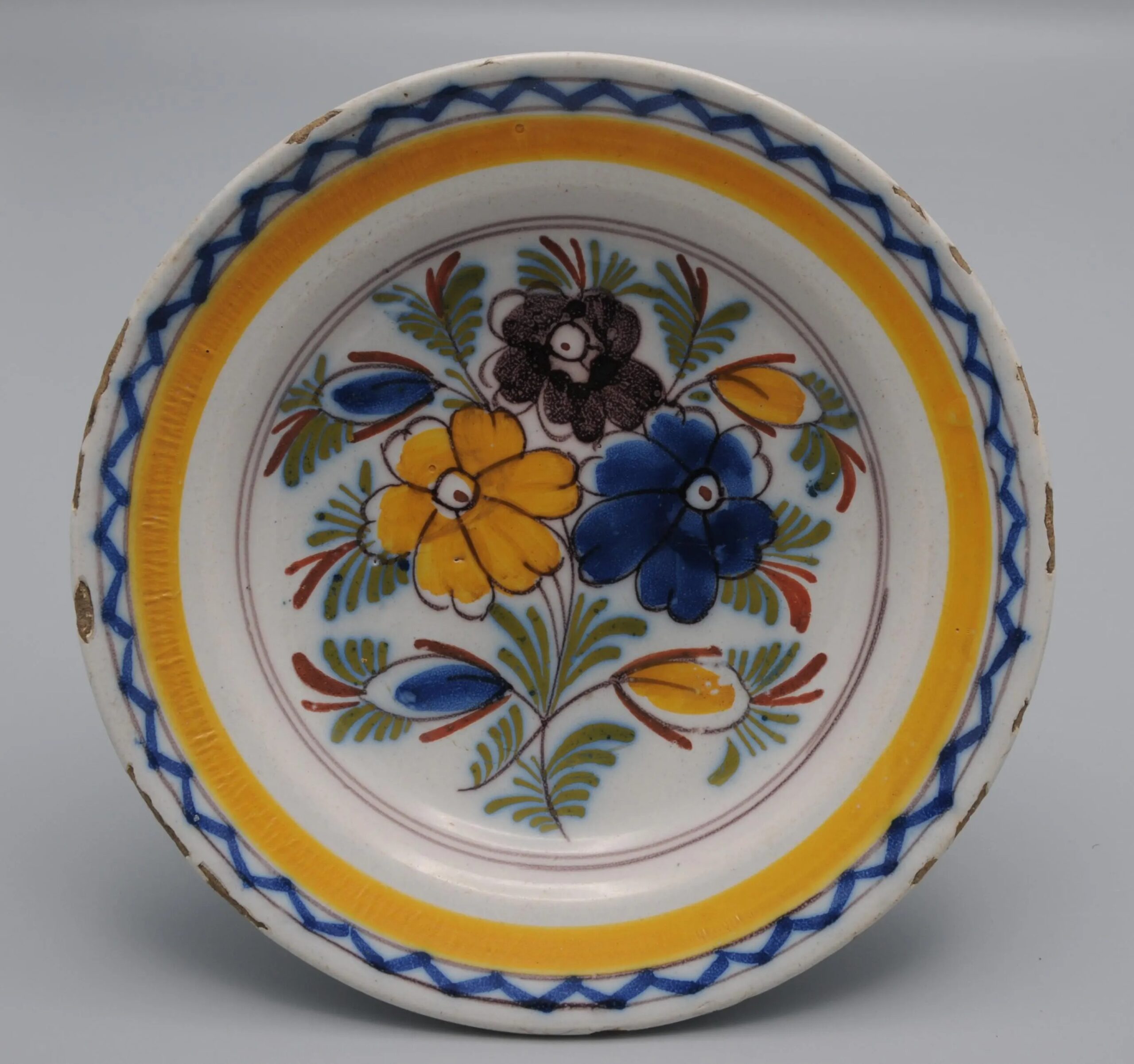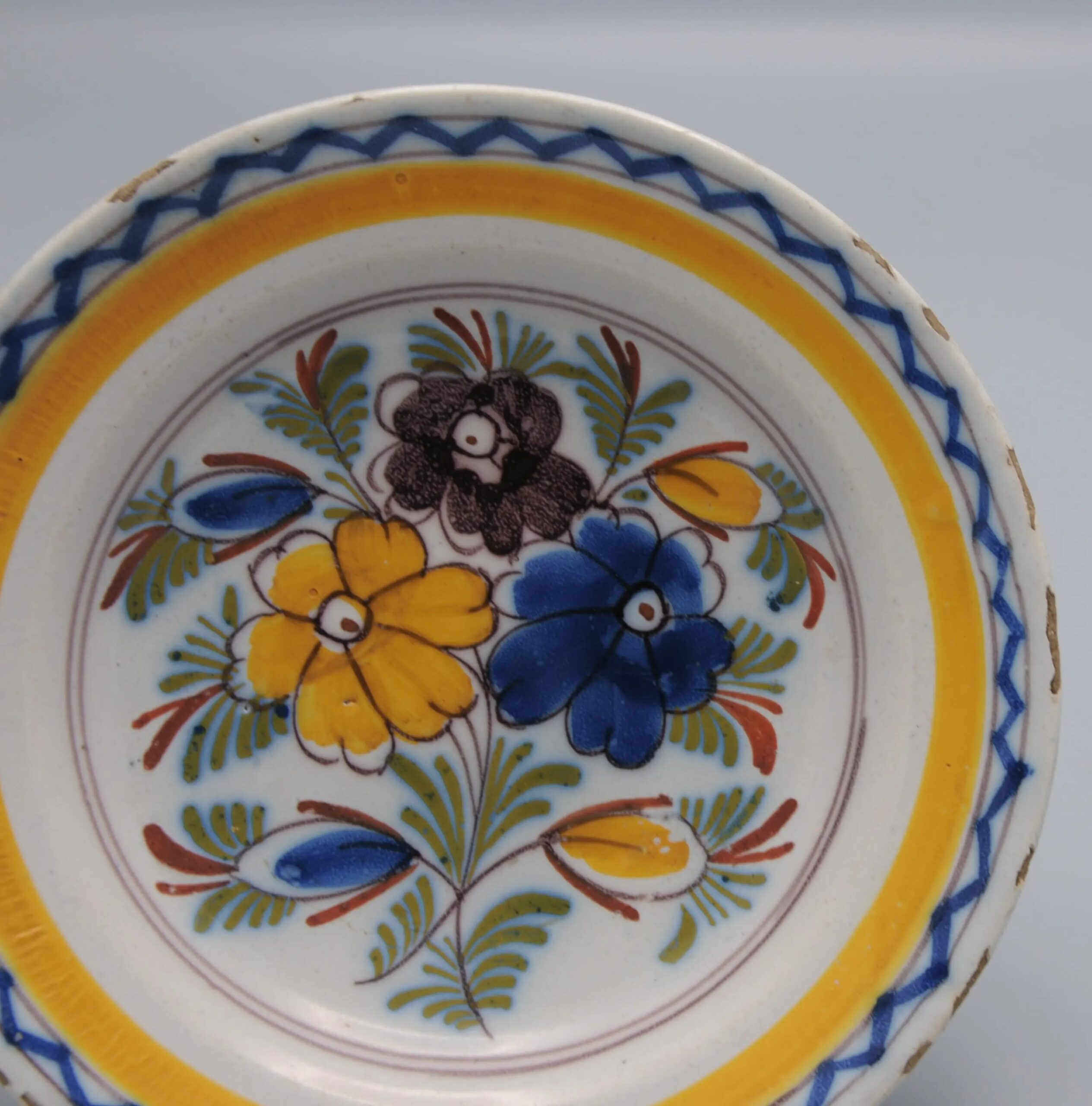 Although unmarked, the plate belongs to the characteristic group known as Boerendelft (“Farmer’s Delft”), which preserved the visual language of 18th-century Delft faience through more spontaneous and colorful floral designs.