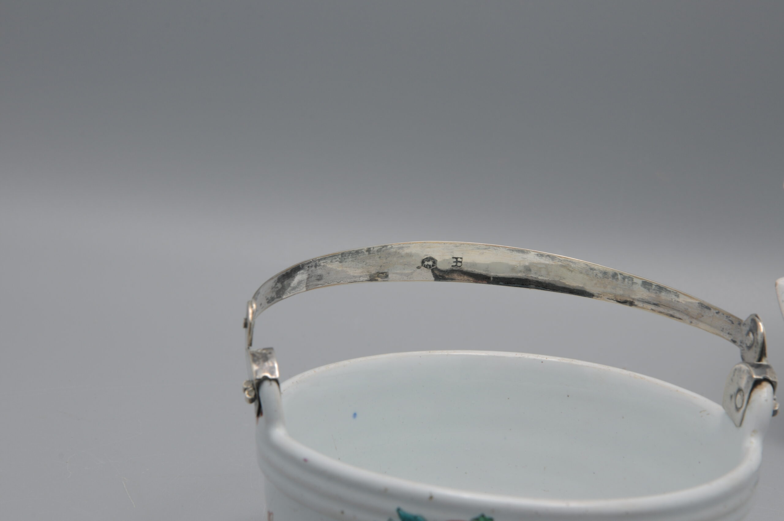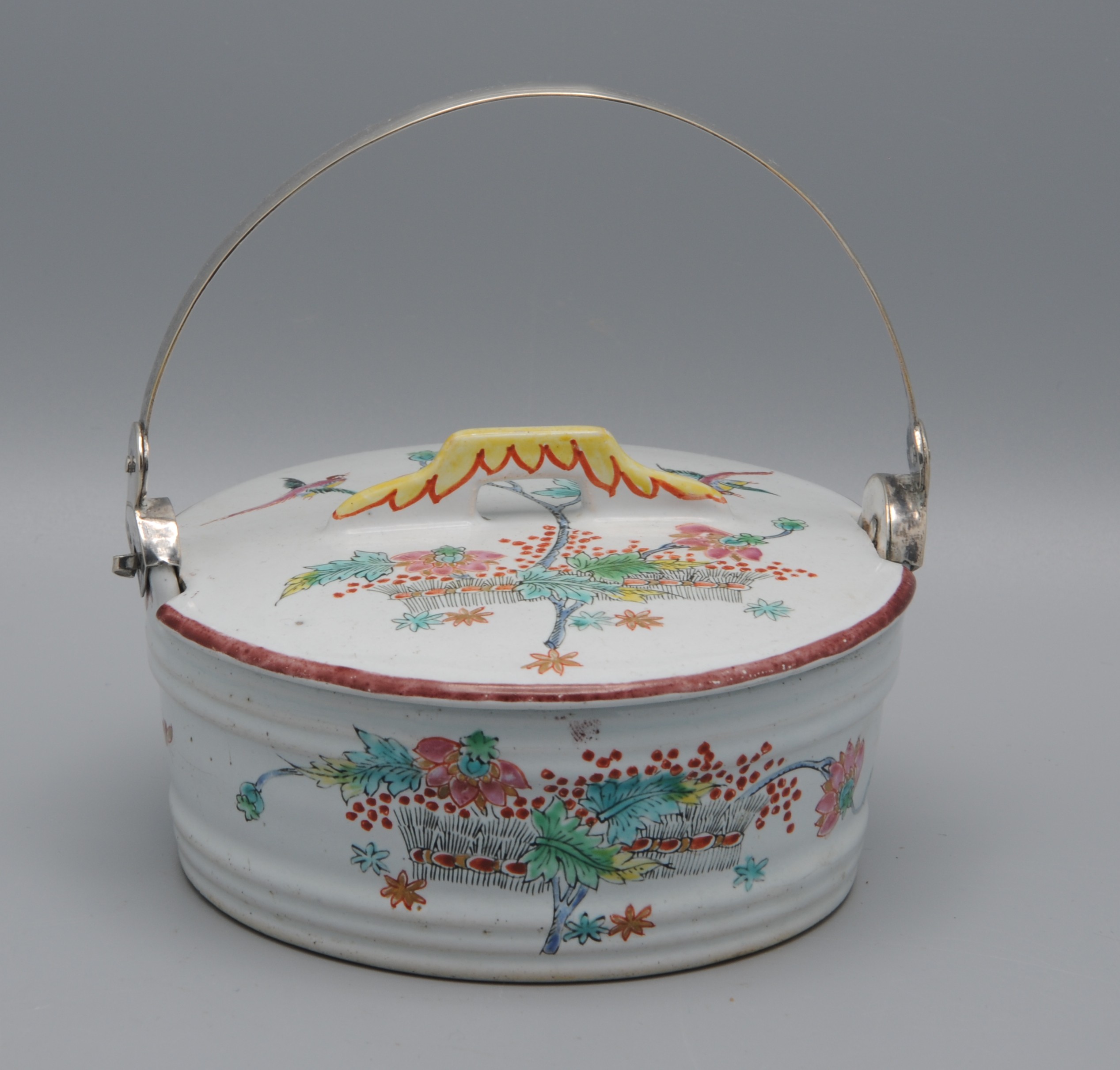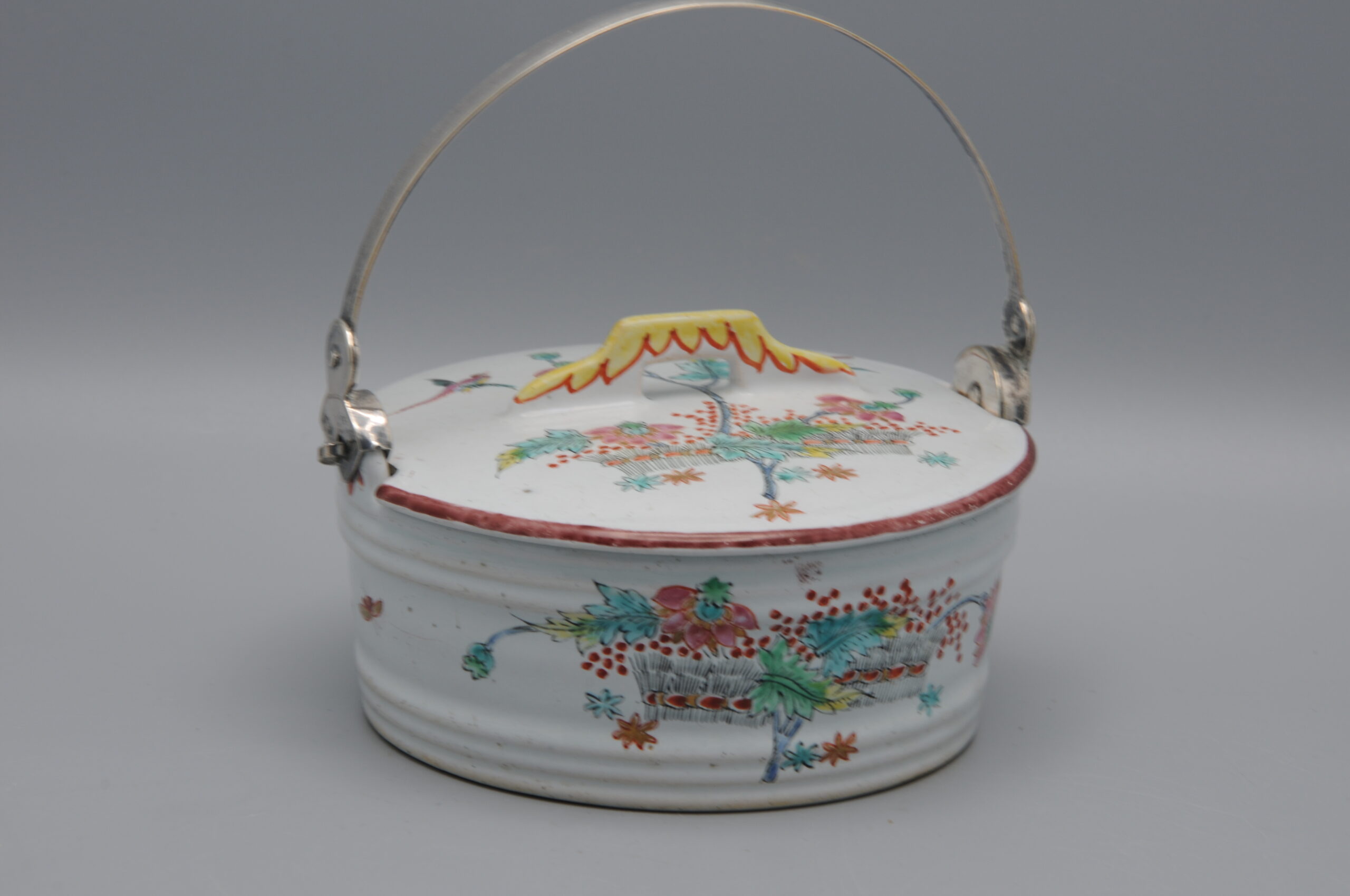 Fitted with a later silver swing handle, hallmarked for Dutch 2nd standard silver (833/1000), dated 1882, most likely Jan Bouwknegt. Butter dishes of this type were originally not outfitted with handles, but this 19th century addition enhances it nicely.