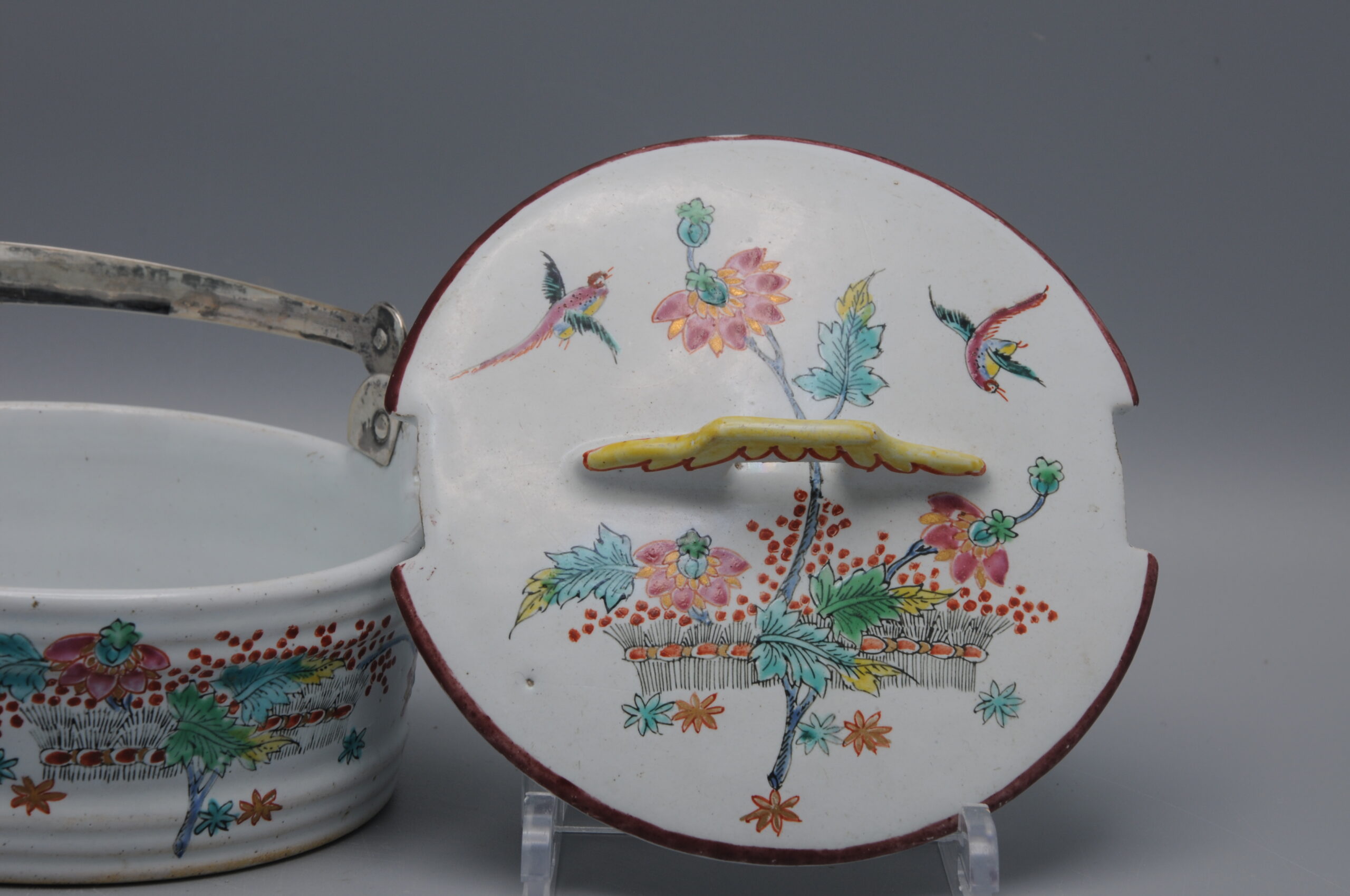 The decoration was achieved using the petit feu (low-fire) technique, in which enamel colours were applied over the white tin glaze and fixed in a second, lower-temperature firing. This innovation allowed Delft potters to expand their palette beyond cobalt blue and achieve the distinctive brilliance of iron-red and emerald green, emulating the refinement of Japanese porcelain.