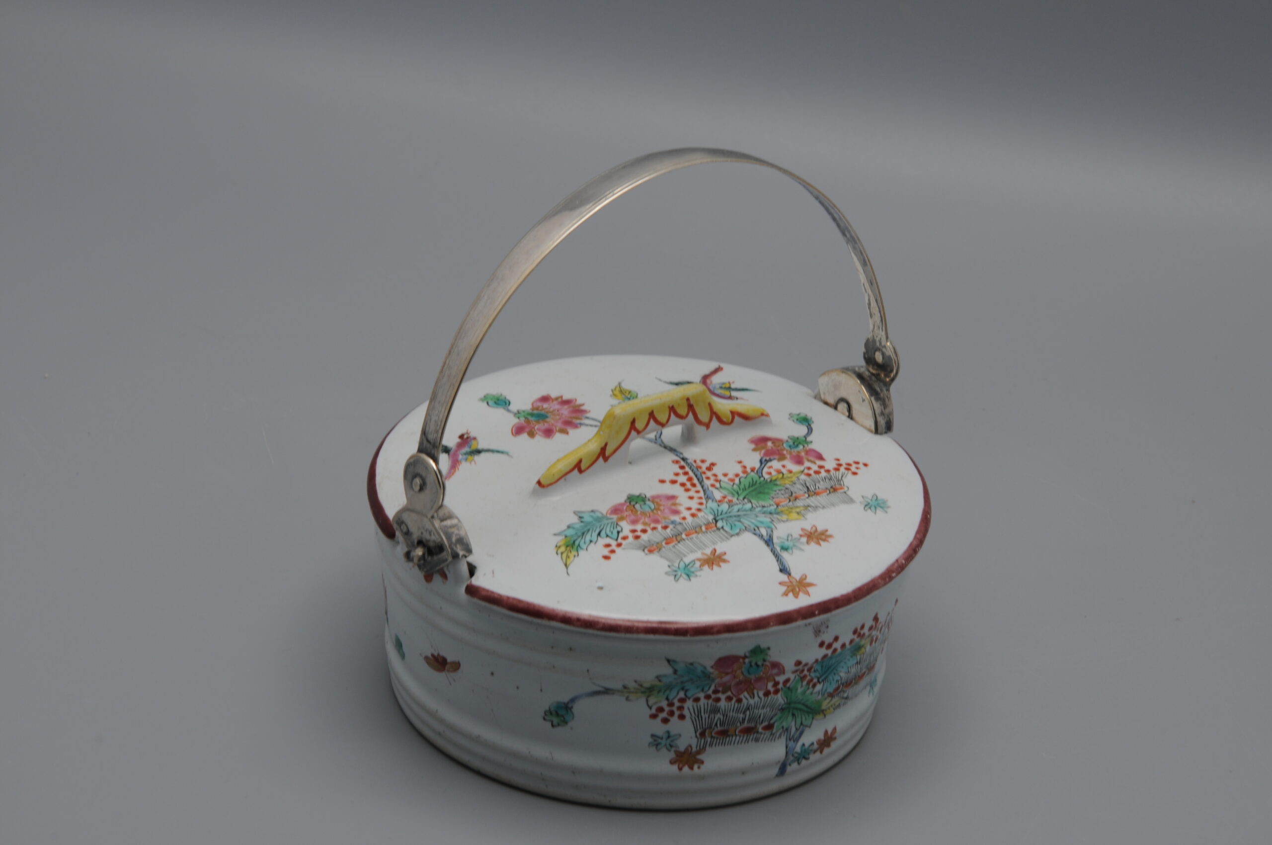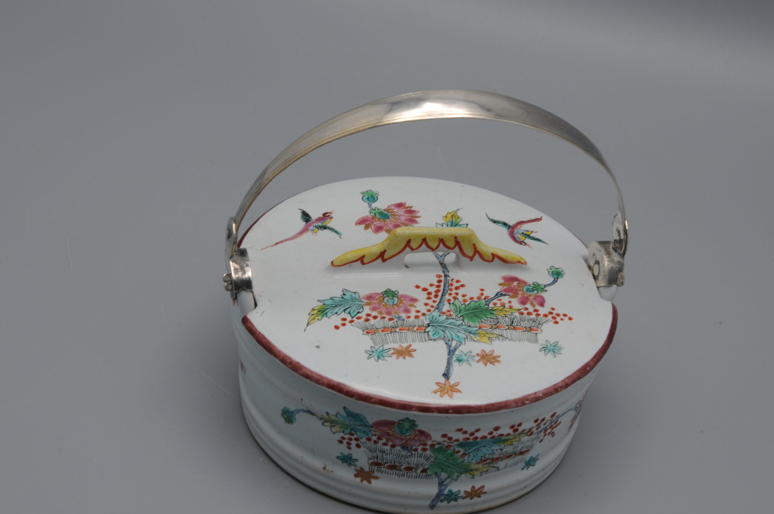 A fine Dutch Delft polychrome earthenware butter dish with domed cover, decorated in the Japanese Kakiemon style. The round form is painted with birds among flowering branches, executed in a vivid palette of red, green, blue, and yellow enamels.