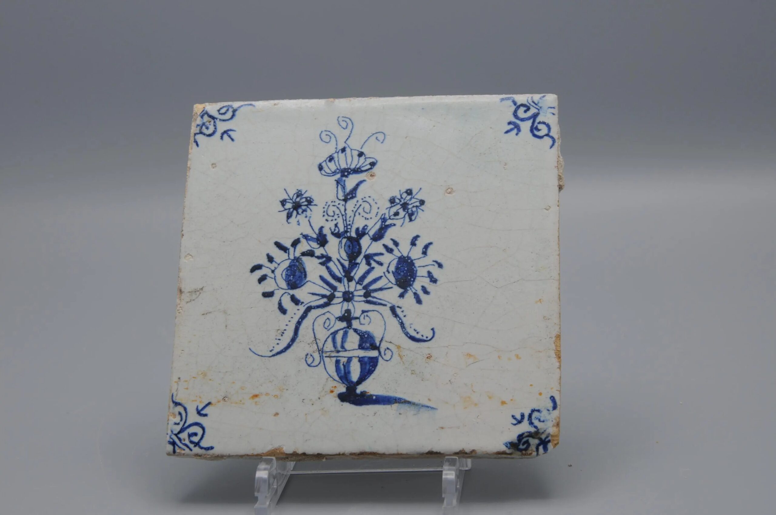 Dutch Delft tile from the late 17th century depicting a vase filled with flowers.
