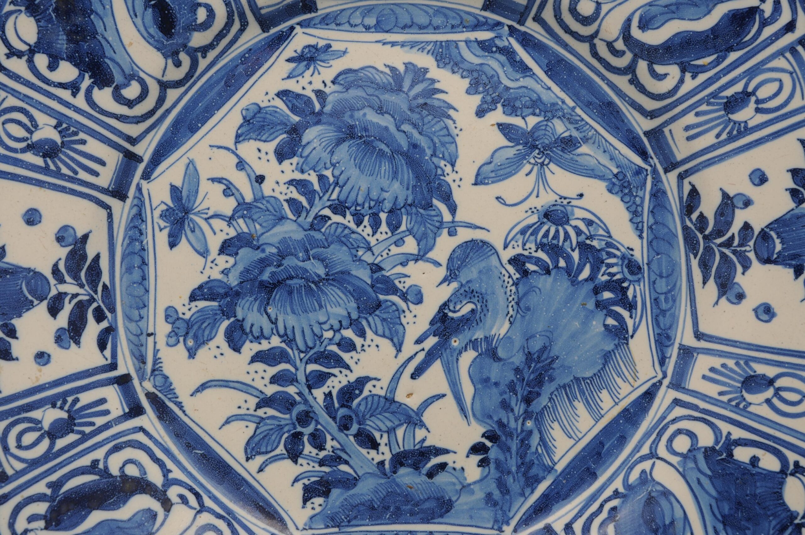 Very good late 17th century Blue Delftware dish with a Wanli Style “Kraak” decoration of a bird on a blossoming branch amidst blossoming peonies and insects.