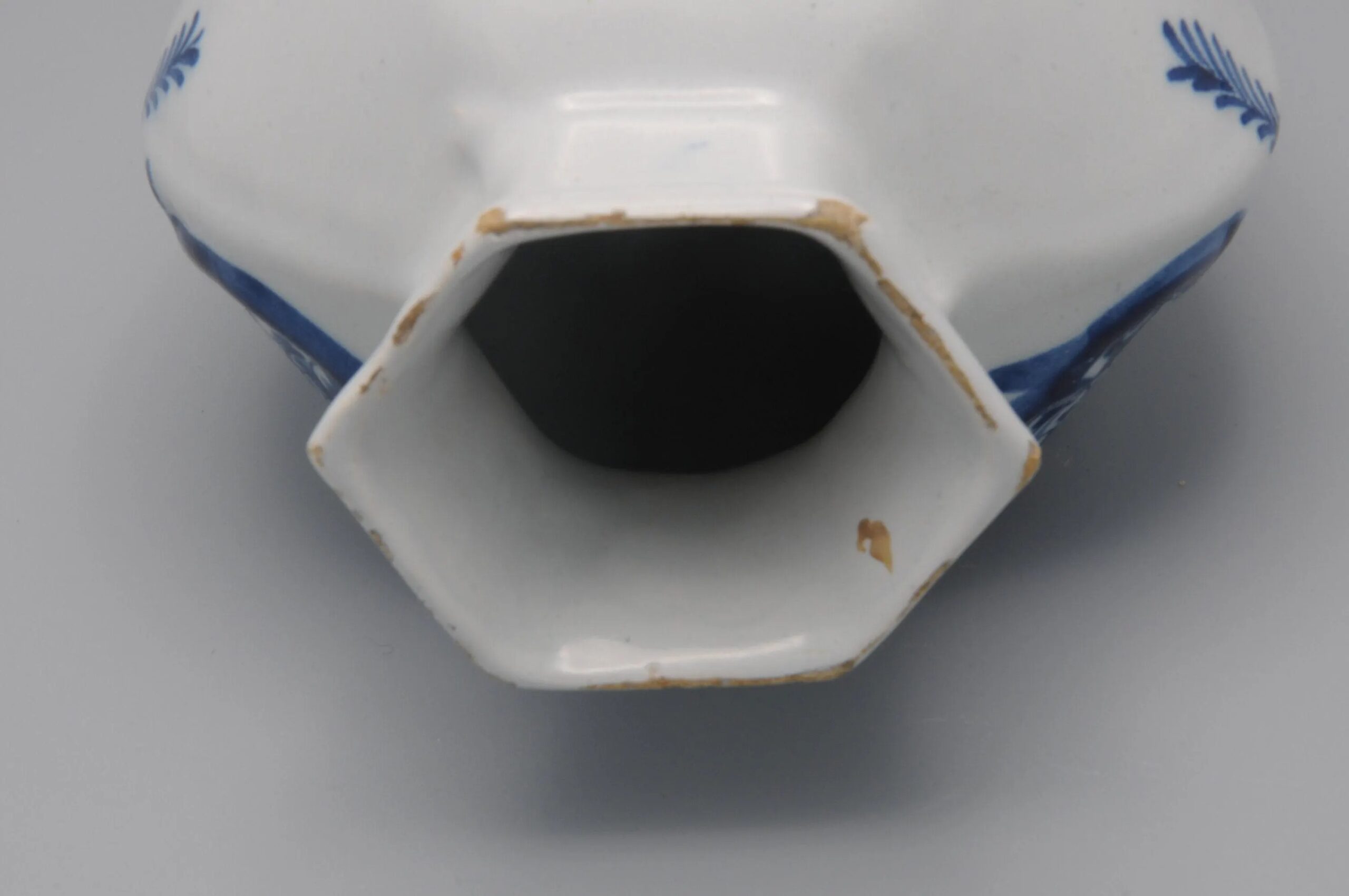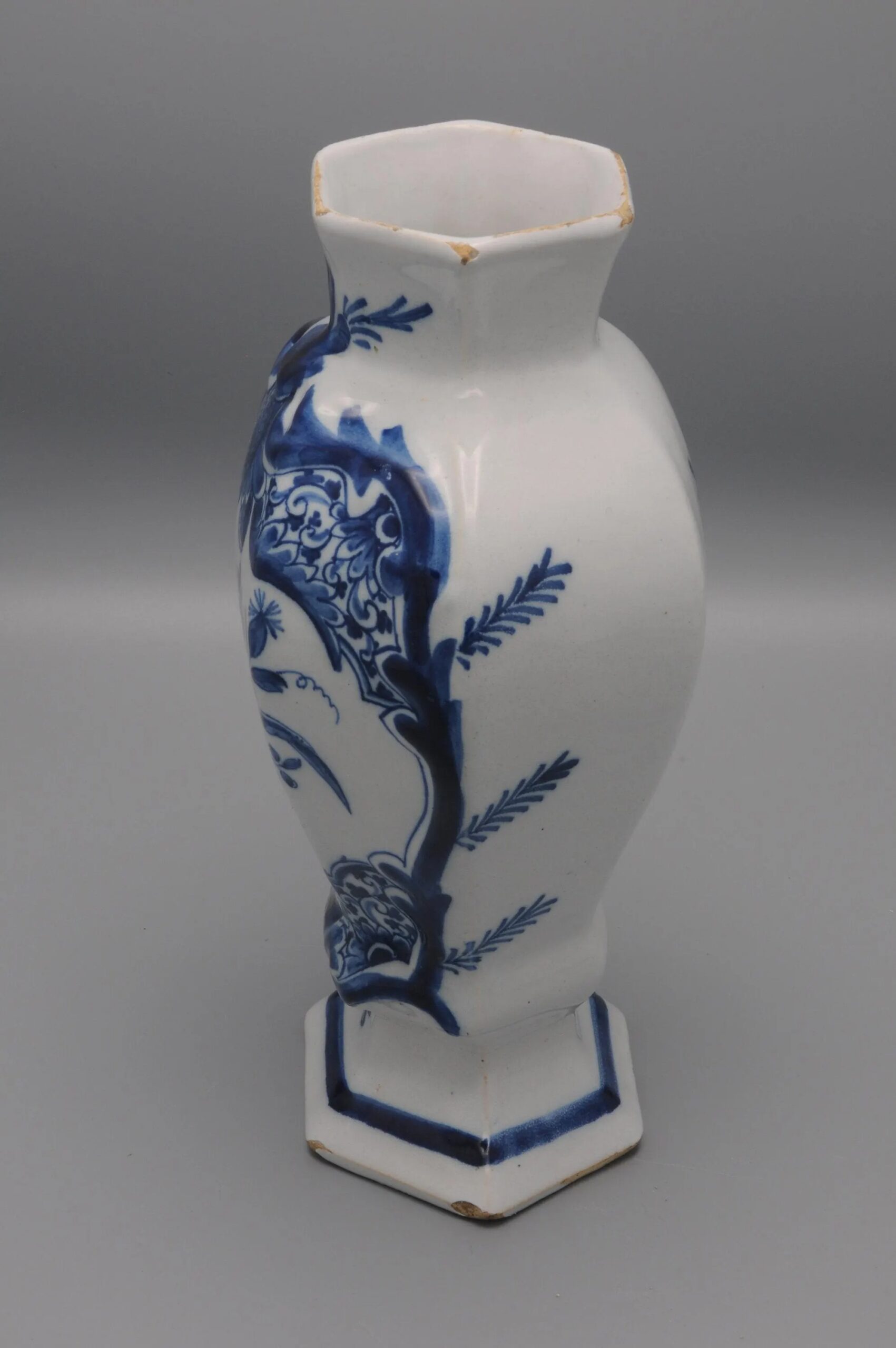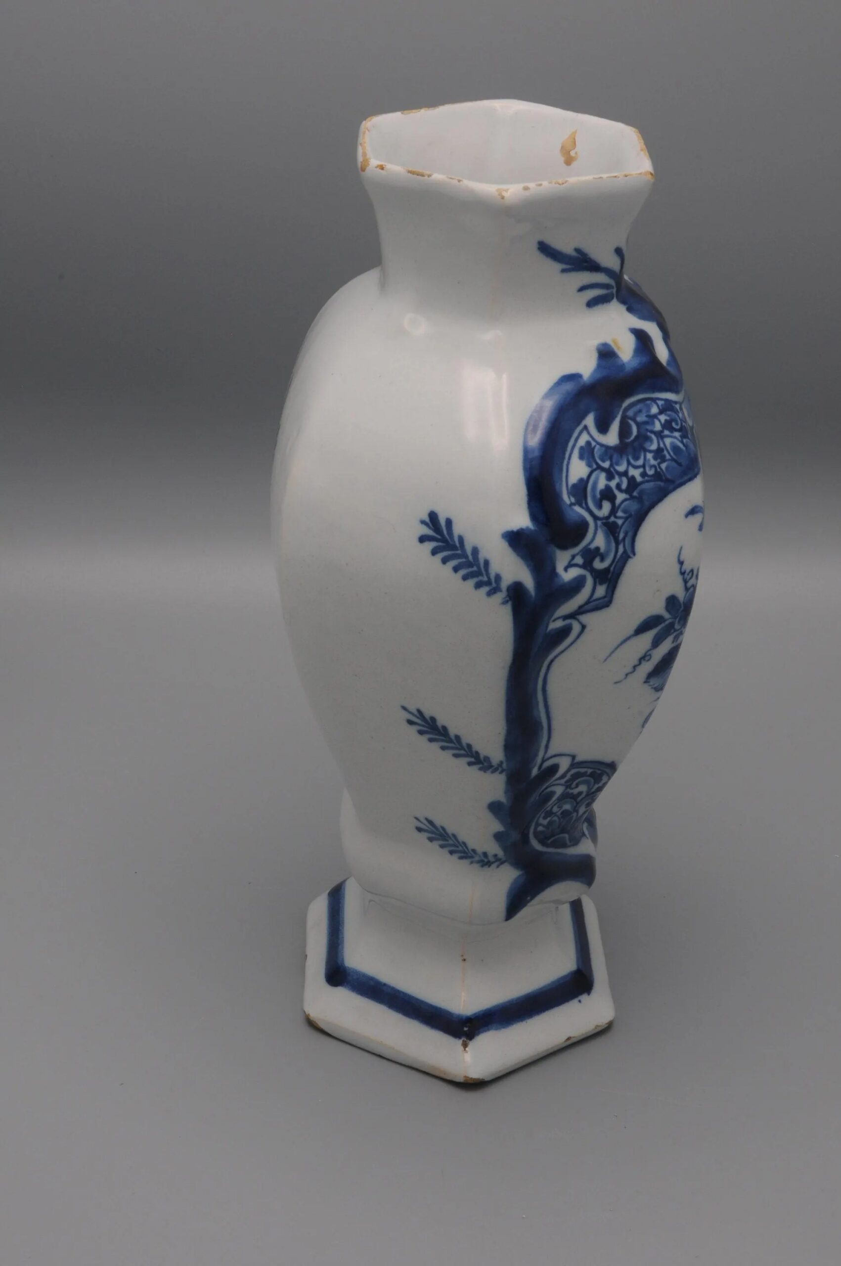 Marked with a claw for De Claauw, or De Klaauw, one of Delft’s most renowned pottery factories. Established in 1661, De Klaauw operated until 1840. The factory was noted for its high-quality blue-and-white Delftware, often featuring floral motifs and cartouche designs. Over its long history, the factory adapted to changing tastes and a diverse clientele. Under the management of Lambertus Sanderus from 1763 to 1806, De Klaauw continued to produce fine ceramics, contributing significantly to the legacy of Dutch Delftware. This vase dates from that period.