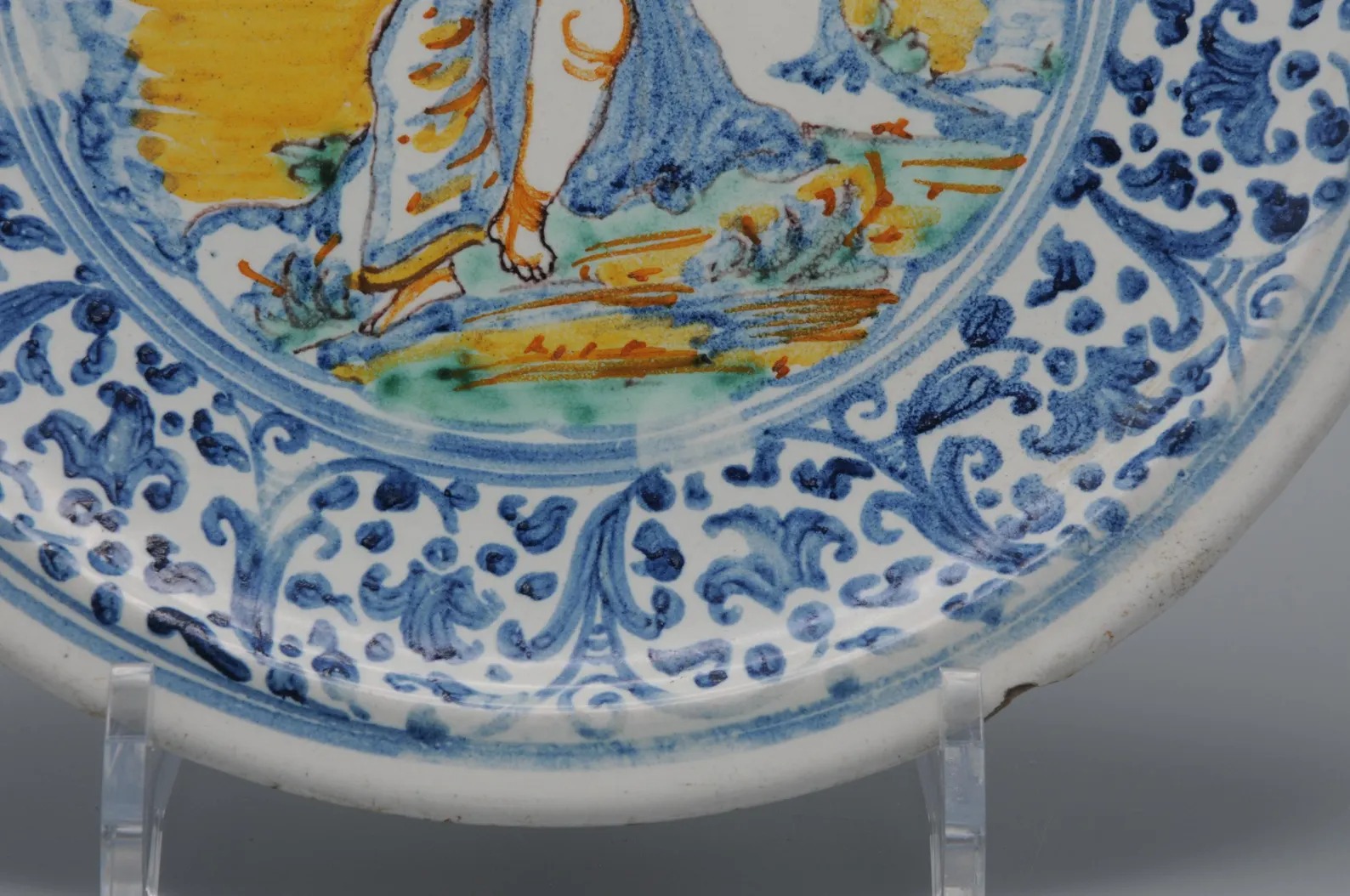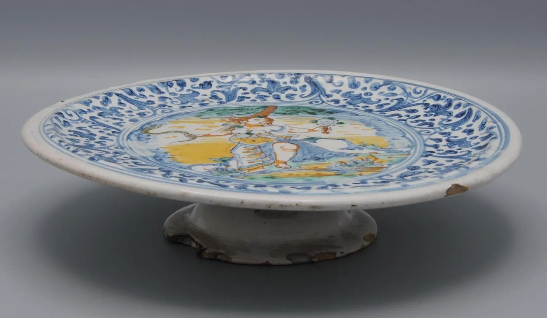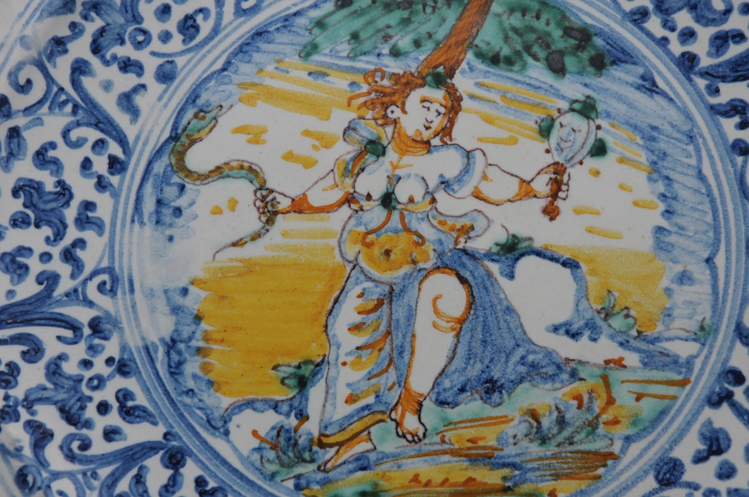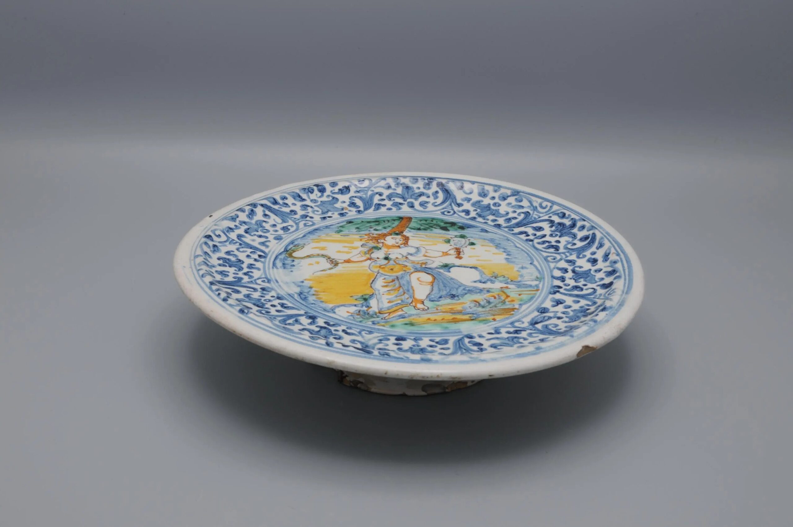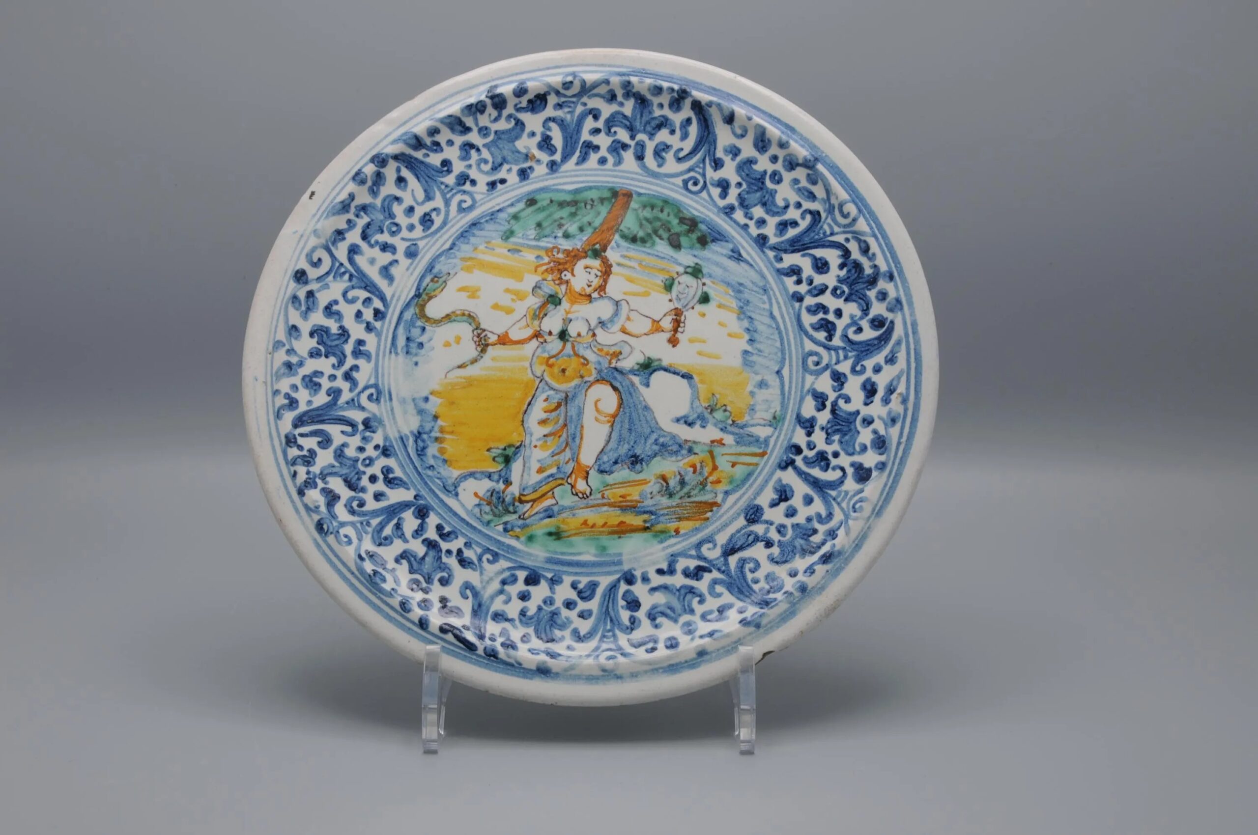 This piece belongs to the tradition of Italian maiolica that continued to flourish in the 18th century, particularly in regional centers such as Faenza, Deruta, and Pesaro. The use of allegorical and moralizing imagery reflects the persistence of Renaissance humanist themes in later decorative ceramics.