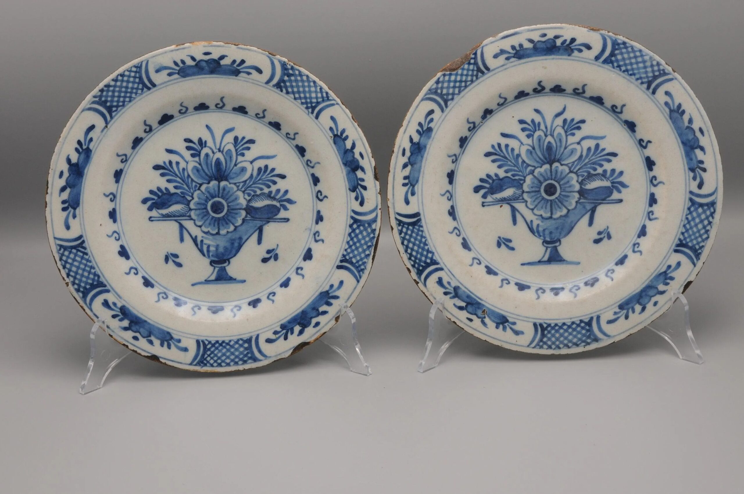 Pair of antique Dutch Delft plates dating from around 1800. Each plate is hand-painted in cobalt blue on a white tin-glazed surface, showing a central urn with surrounding floral decoration in the Empire style. The design reflects the early nineteenth-century transition in Delftware toward neoclassical forms and balanced composition.