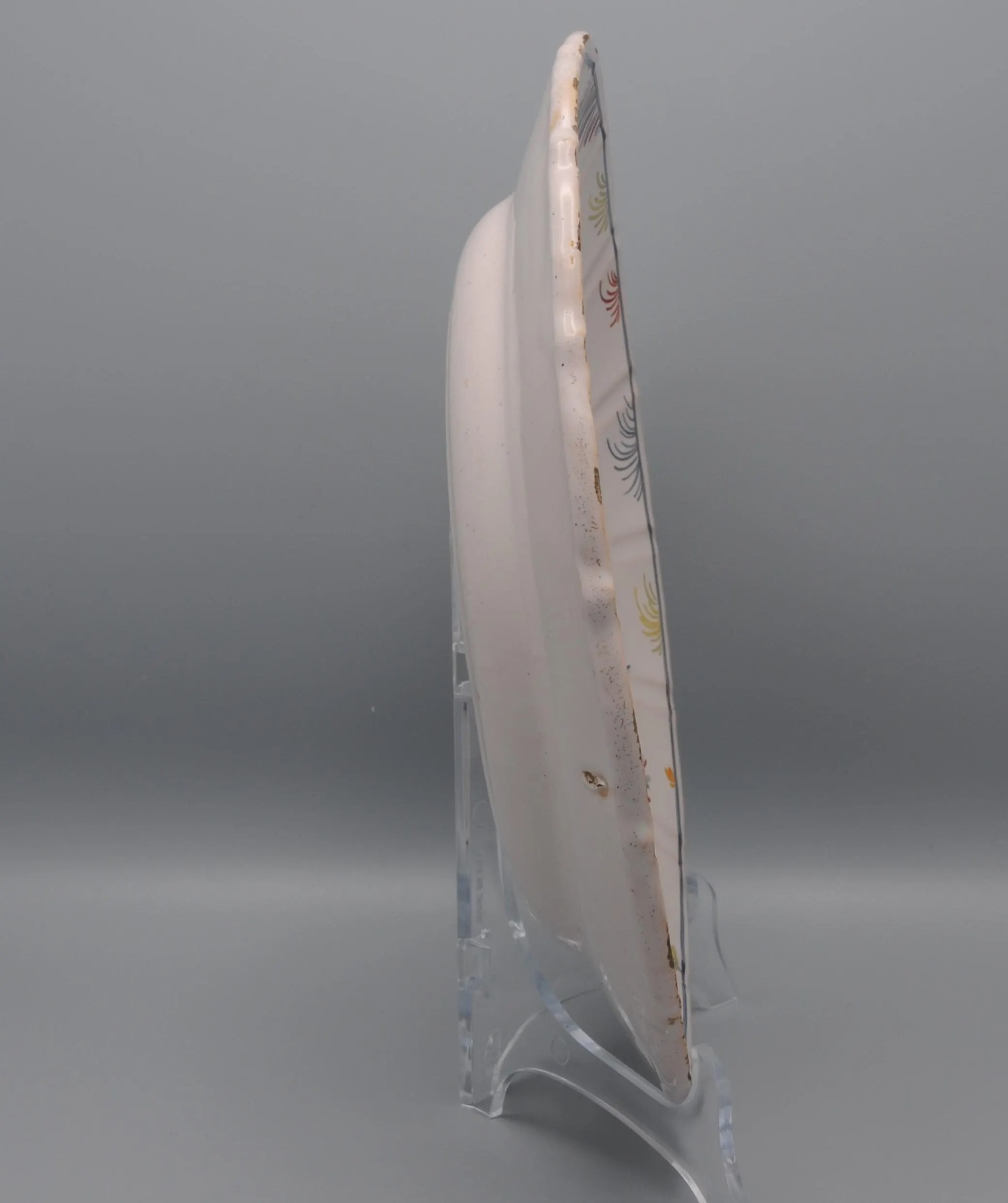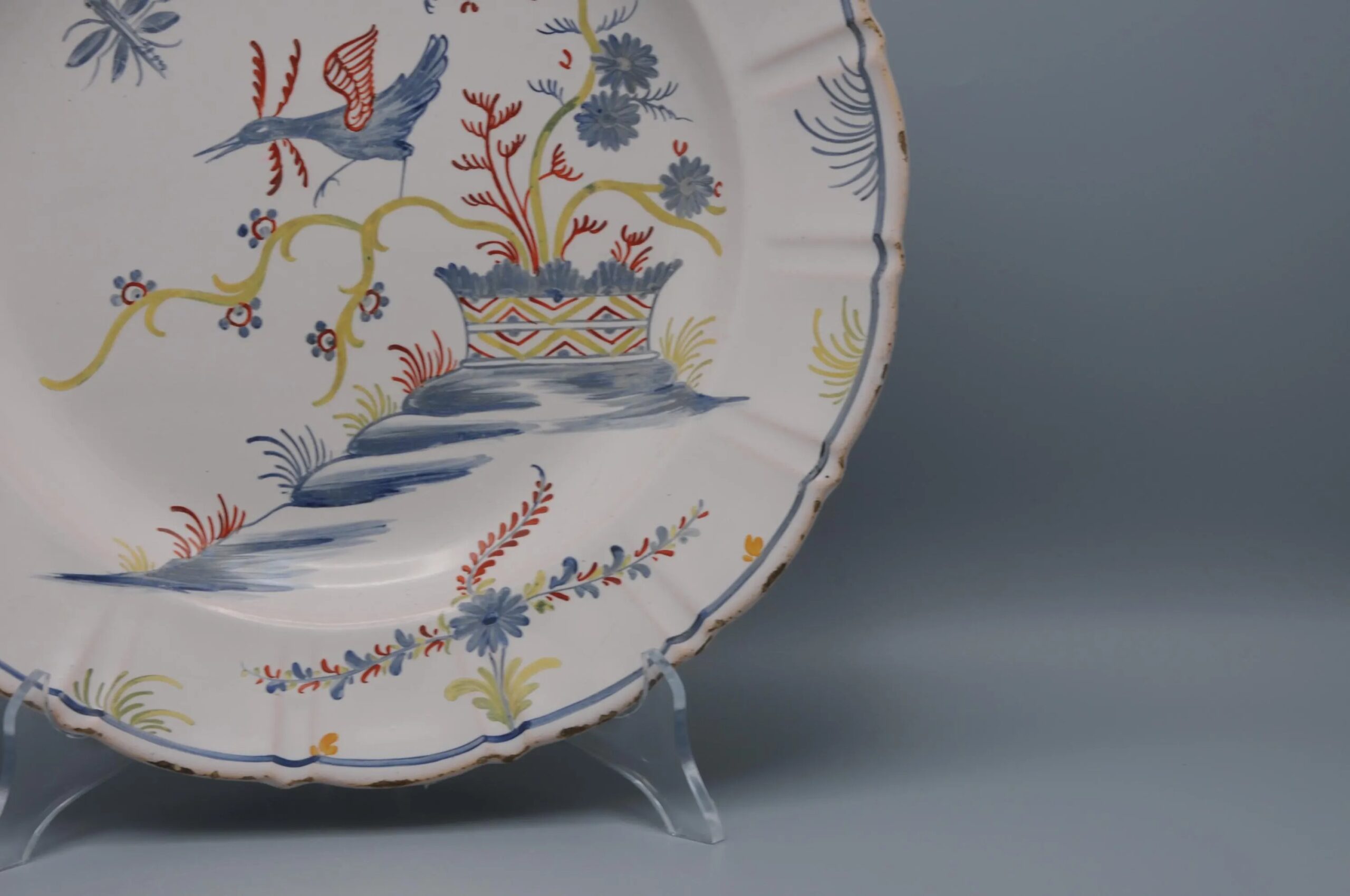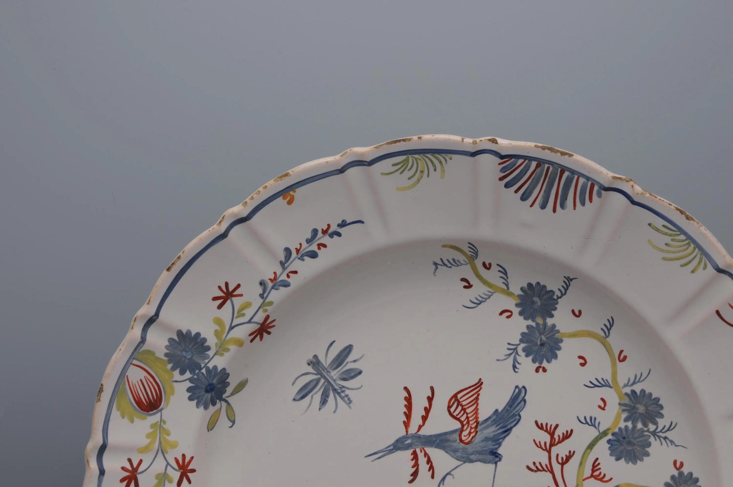 This bowl with a scalloped edge has a polychrome floral decoration in blue, orange and green, occupying the basin and overflowing onto the wing. A basket of chicory flowers welcomes an exotic blue bird with orange wings ready to fly away. The terrace supporting the decor represents a sort of flat rock where the basket is placed. A fine blue stripe follows the edge of the wing and is decorated with stylized chicory seedlings.