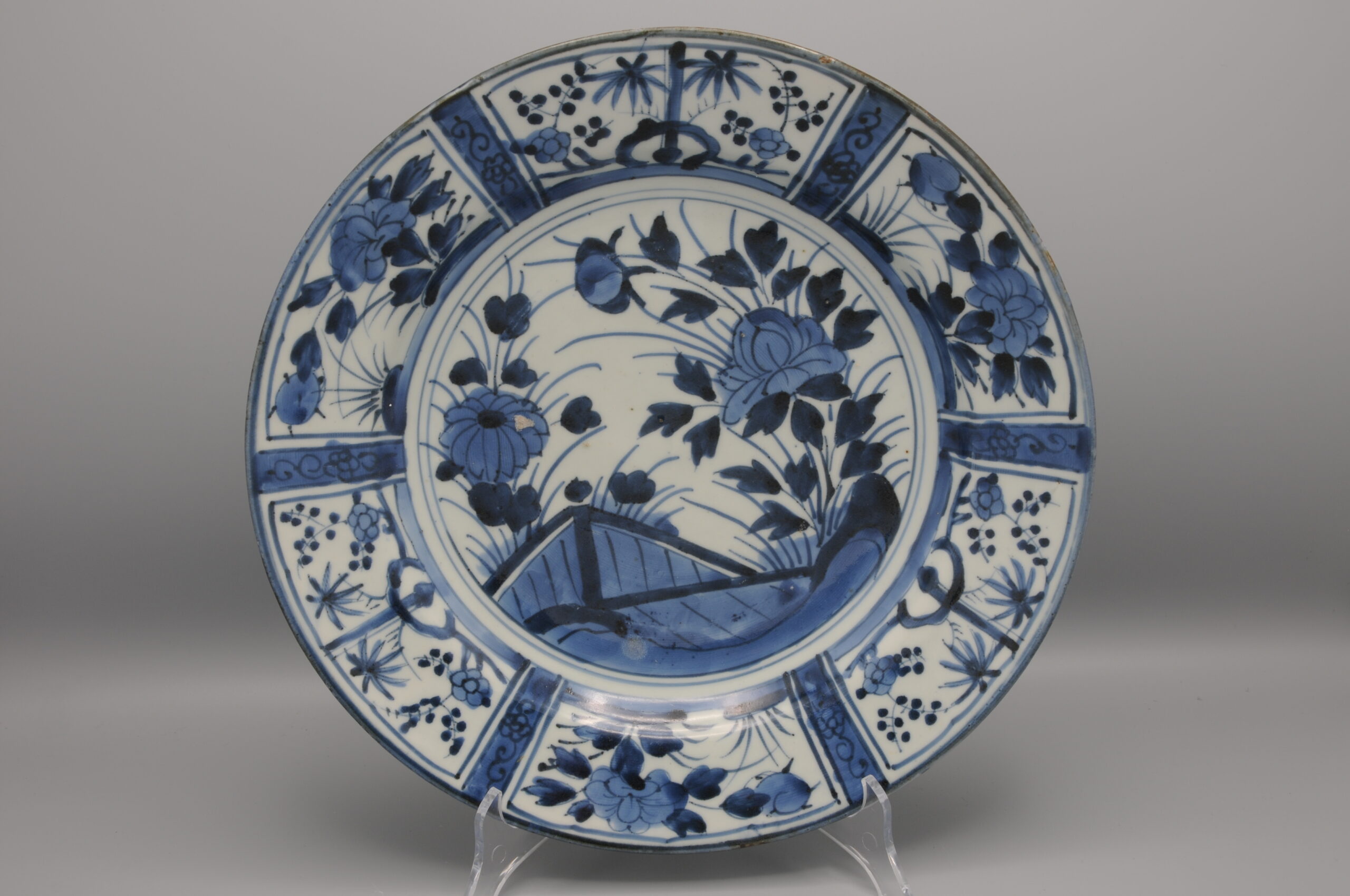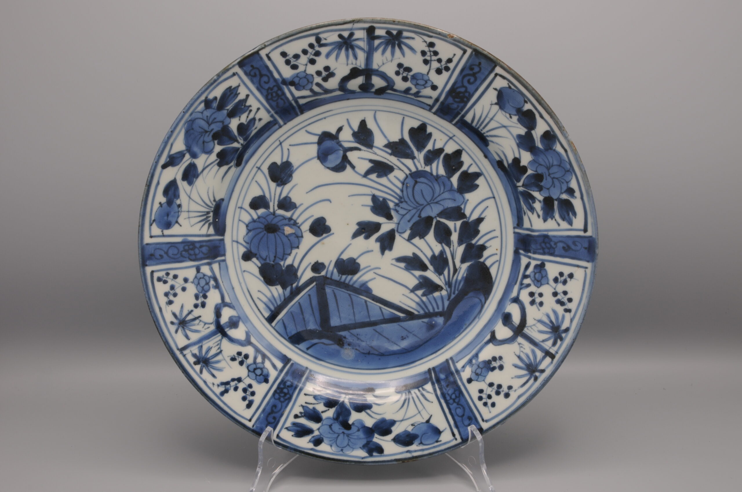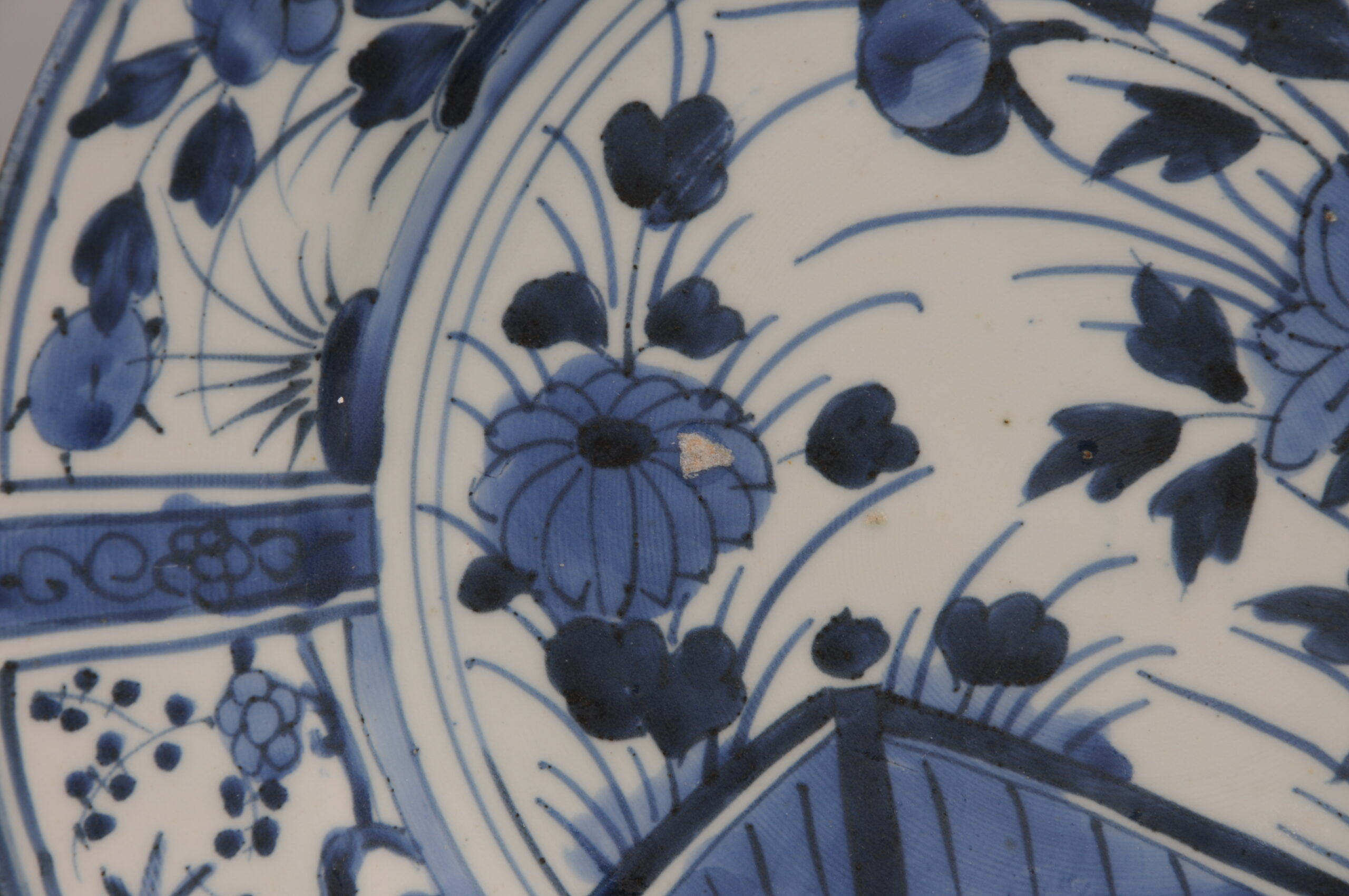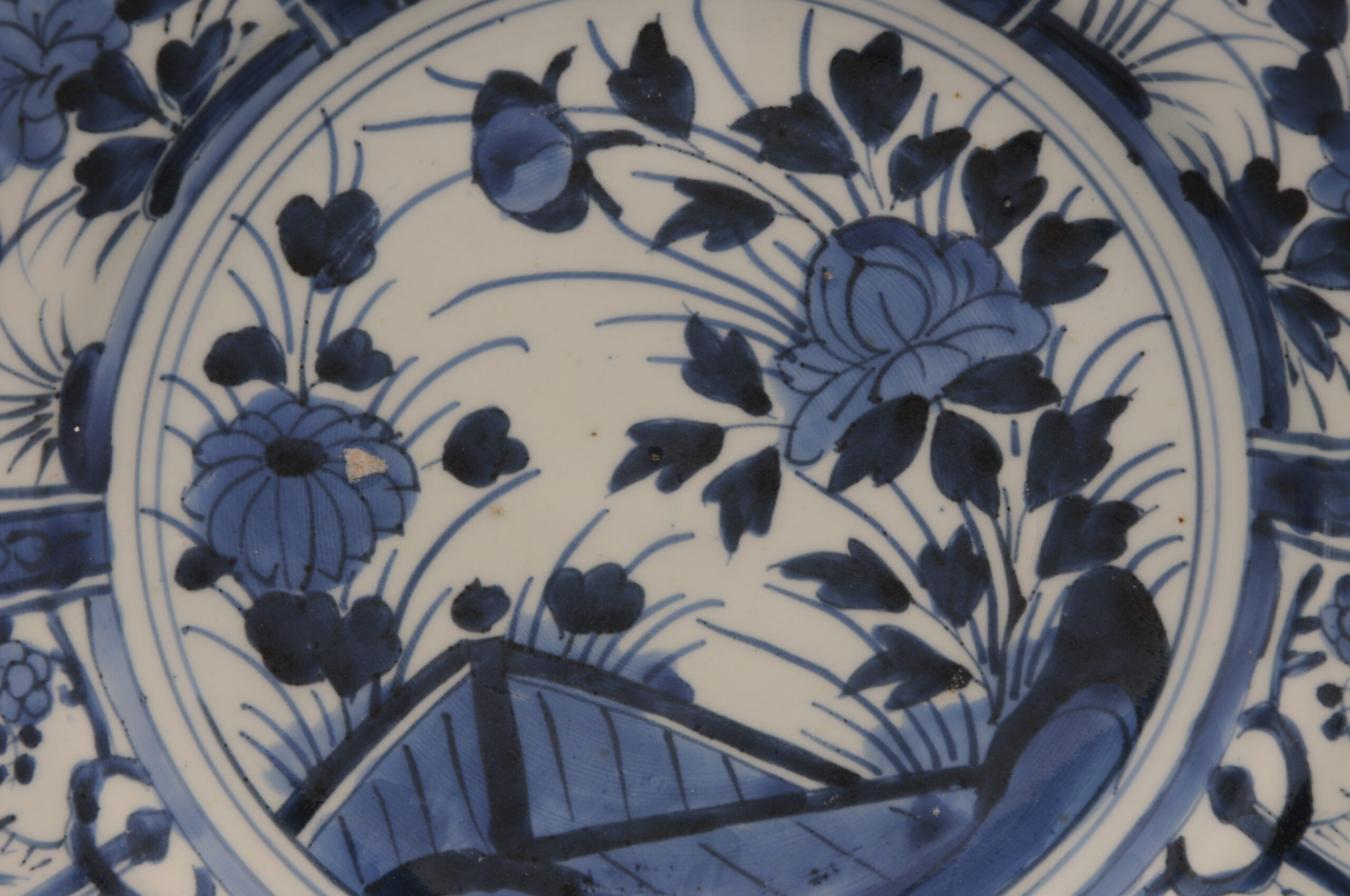 Decorated in underglaze blue with flowering chrysanthemums growing from behind a fence and flowering peonies growing from pierced rockwork enclosed by a double concentric band. The sides and rim in Chinese kraak style with six wide panels filled with bamboo, peony and prunus, separated from each other by narrow panels filled with a floret between scrolls on a blue ground. This rim decoration is rarely seen together with this specific central scene though, as it is usually combined with a flowing, typical Japanese karakusa scroll border.