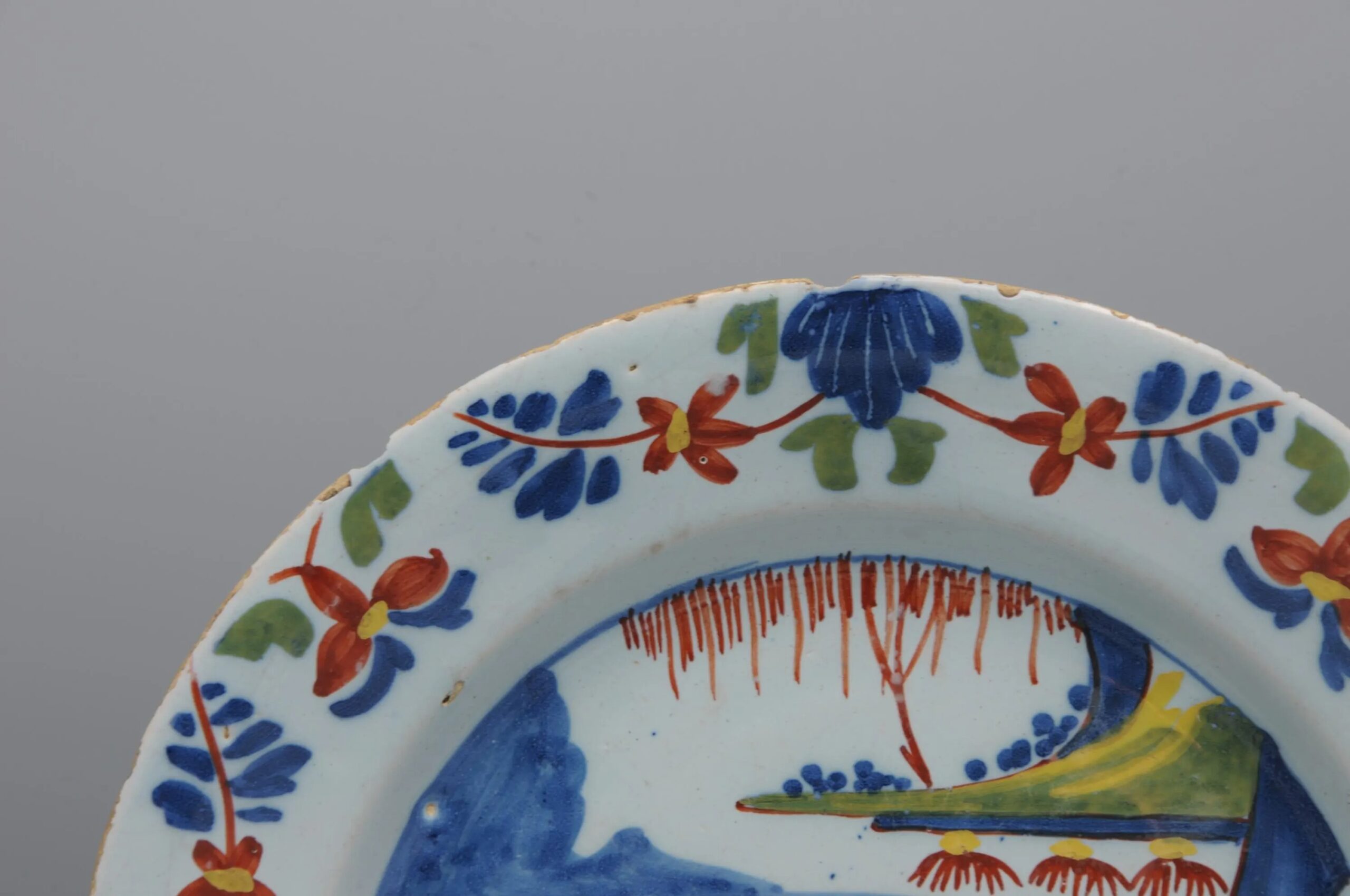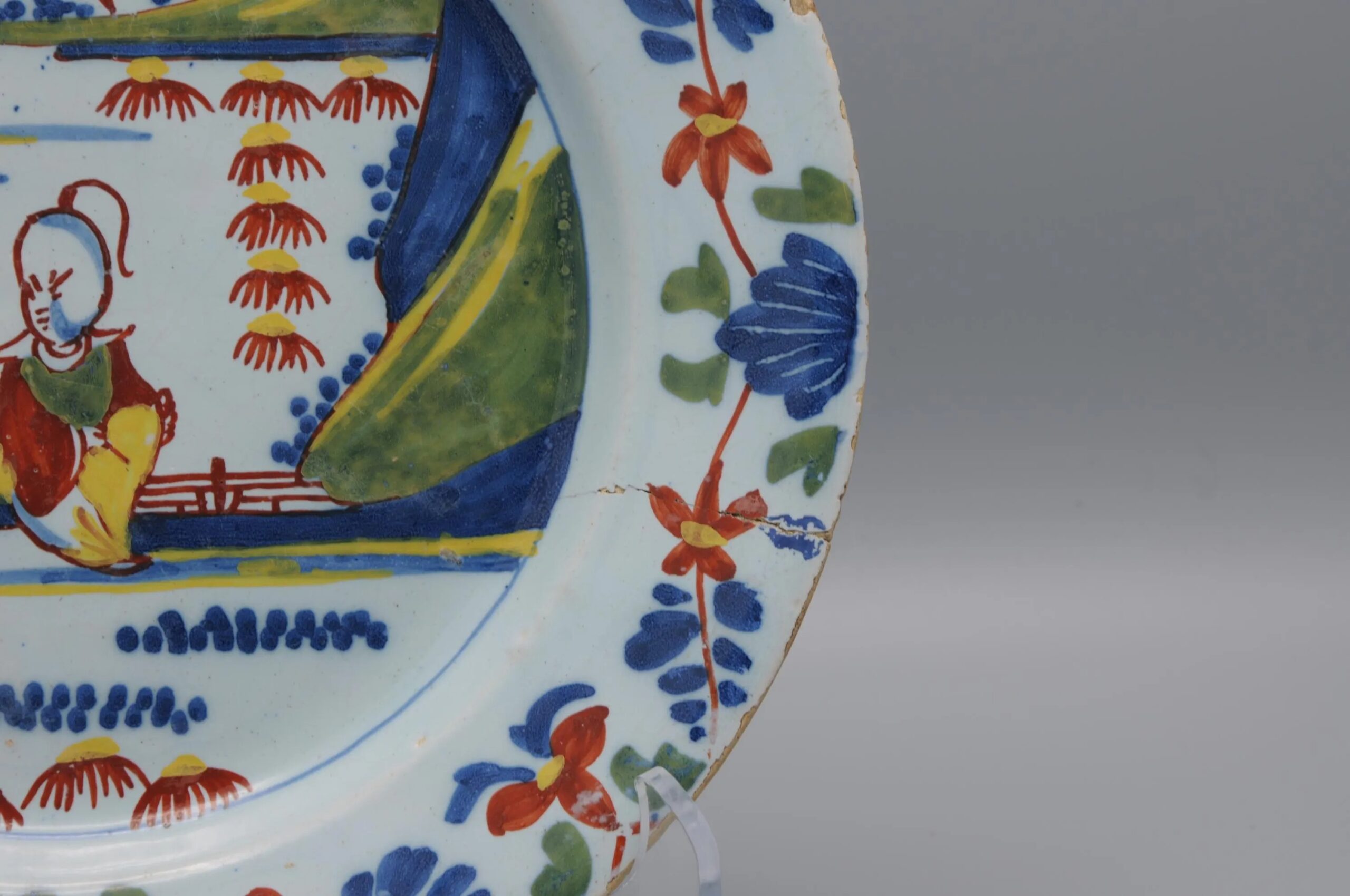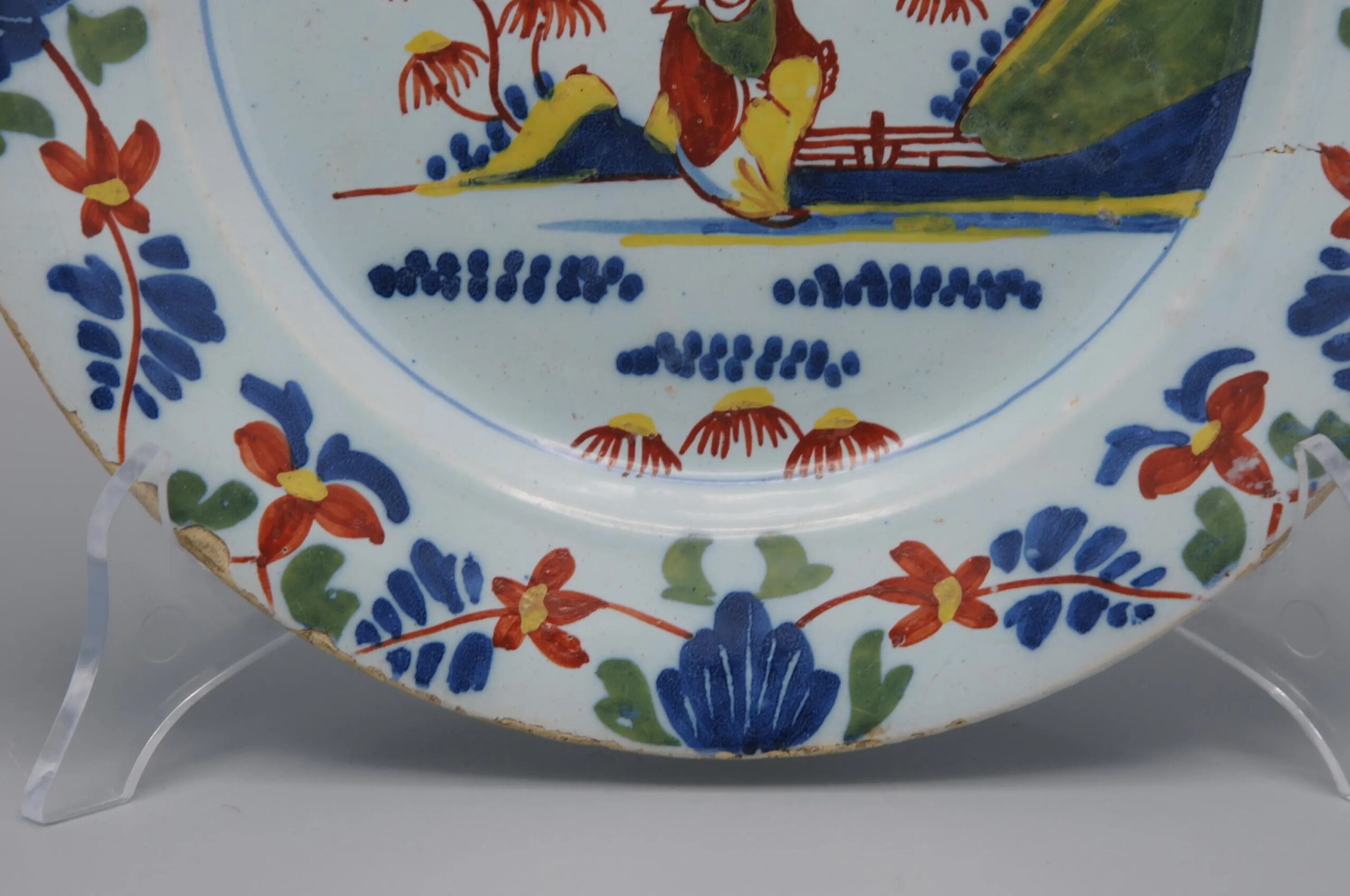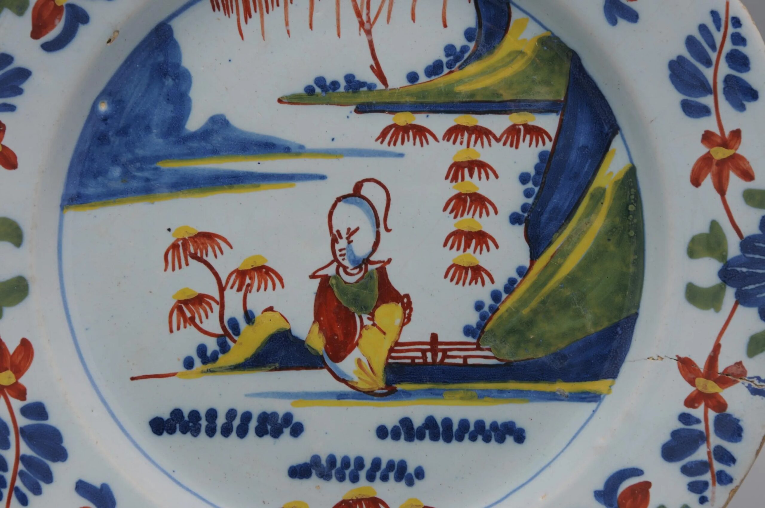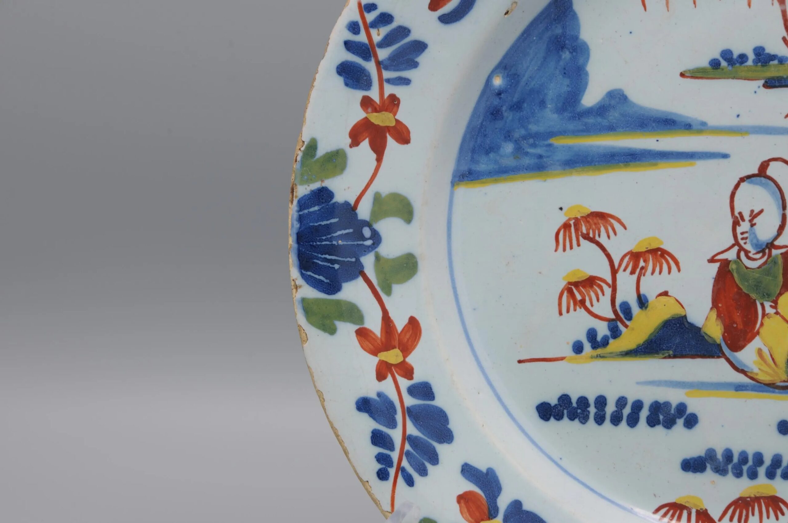 English delft polychrome charger having a Chinese figure in Oriental landscape, painted in polychrome colors of yellow, red green and blue. Attributed to the Lambeth High Street pottery of Abigail Griffith. circa 1765-75.