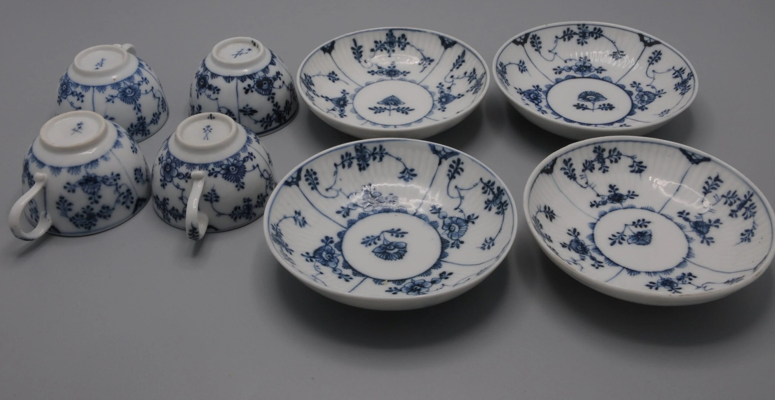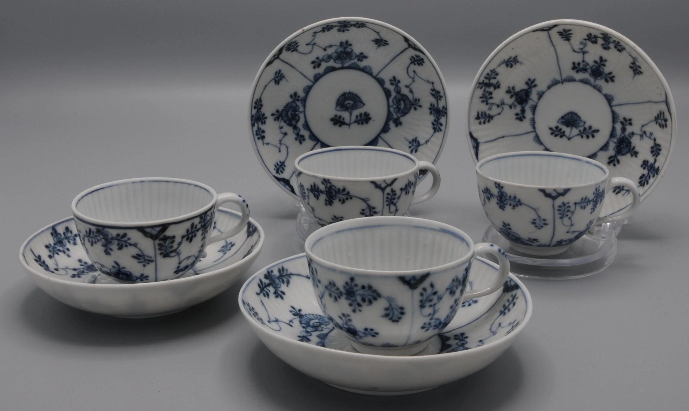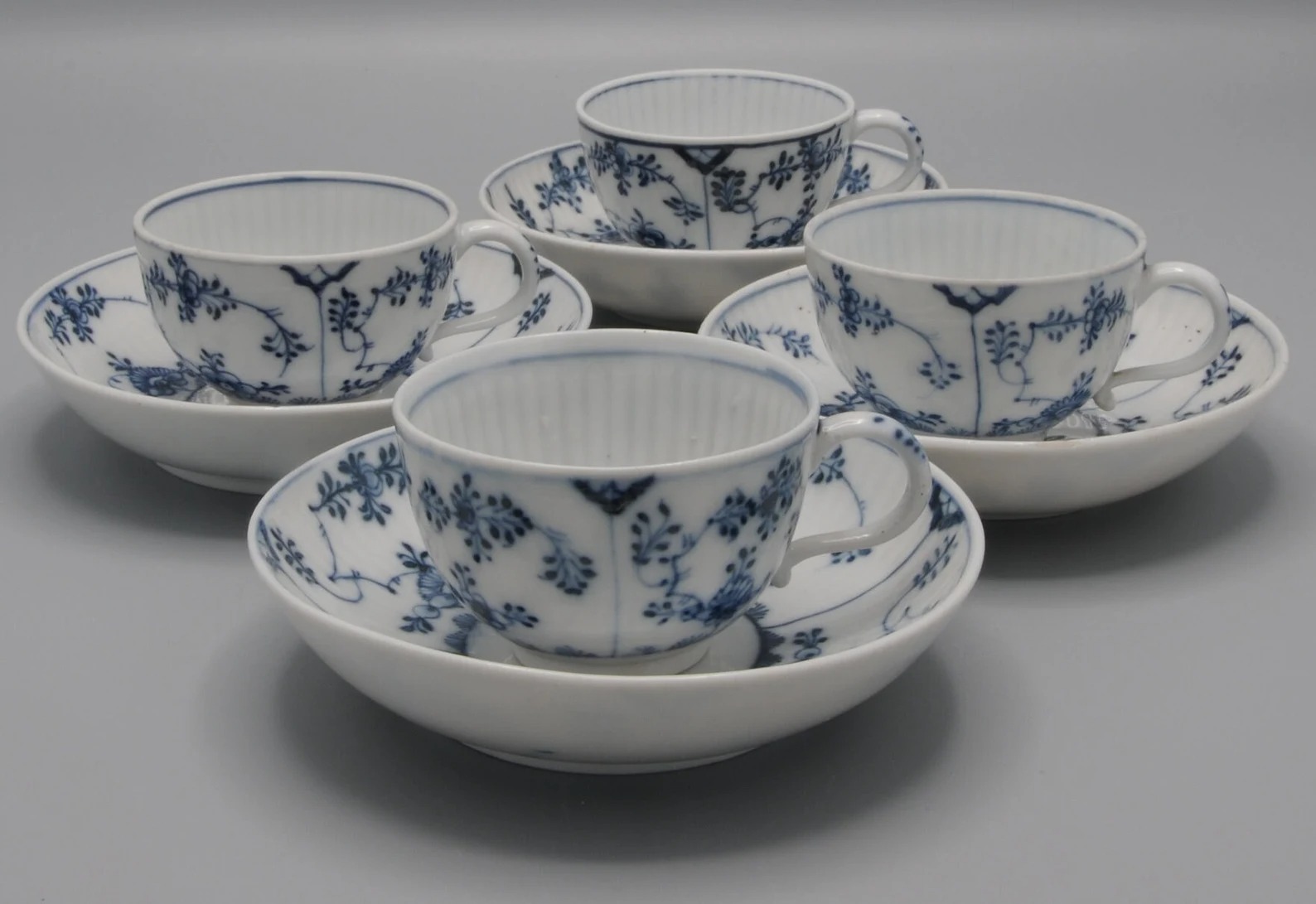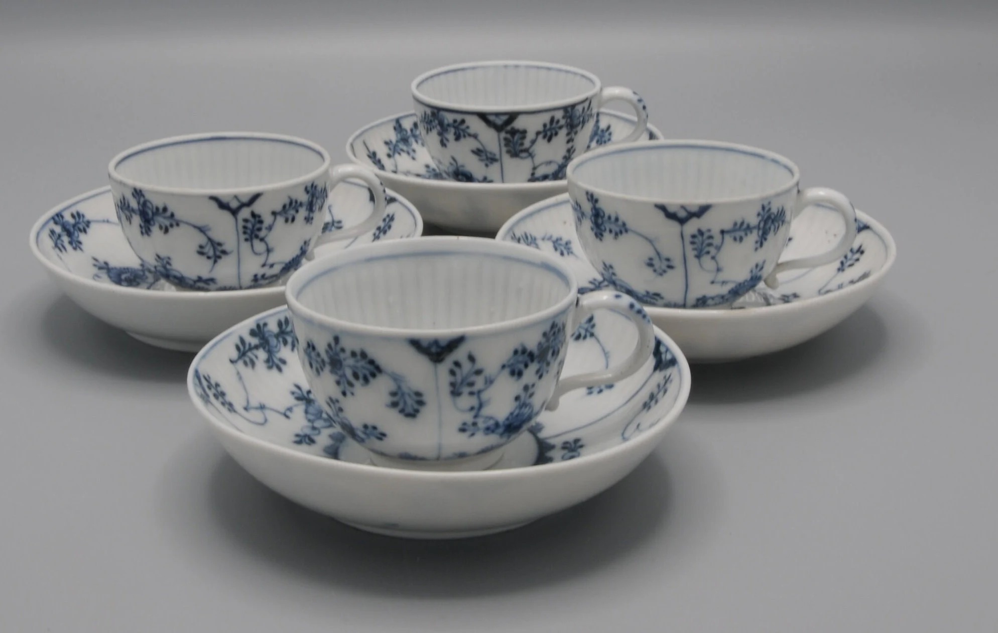 Relief decor “Gebrochener Stab” hemispherical cup with stand ring, handle and fine cobalt blue underglaze painting, matching saucer in bowl shape.