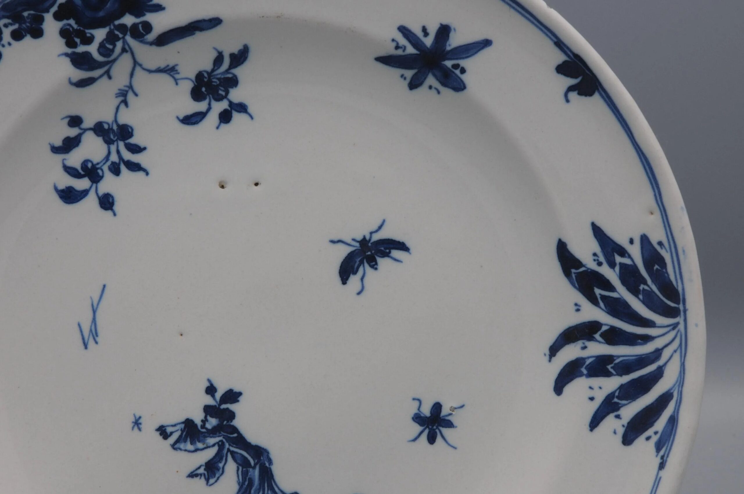 Moustiers plate in “camaïeu blue” depicting a Chinese man, amidst insects, flowers and leaves.
