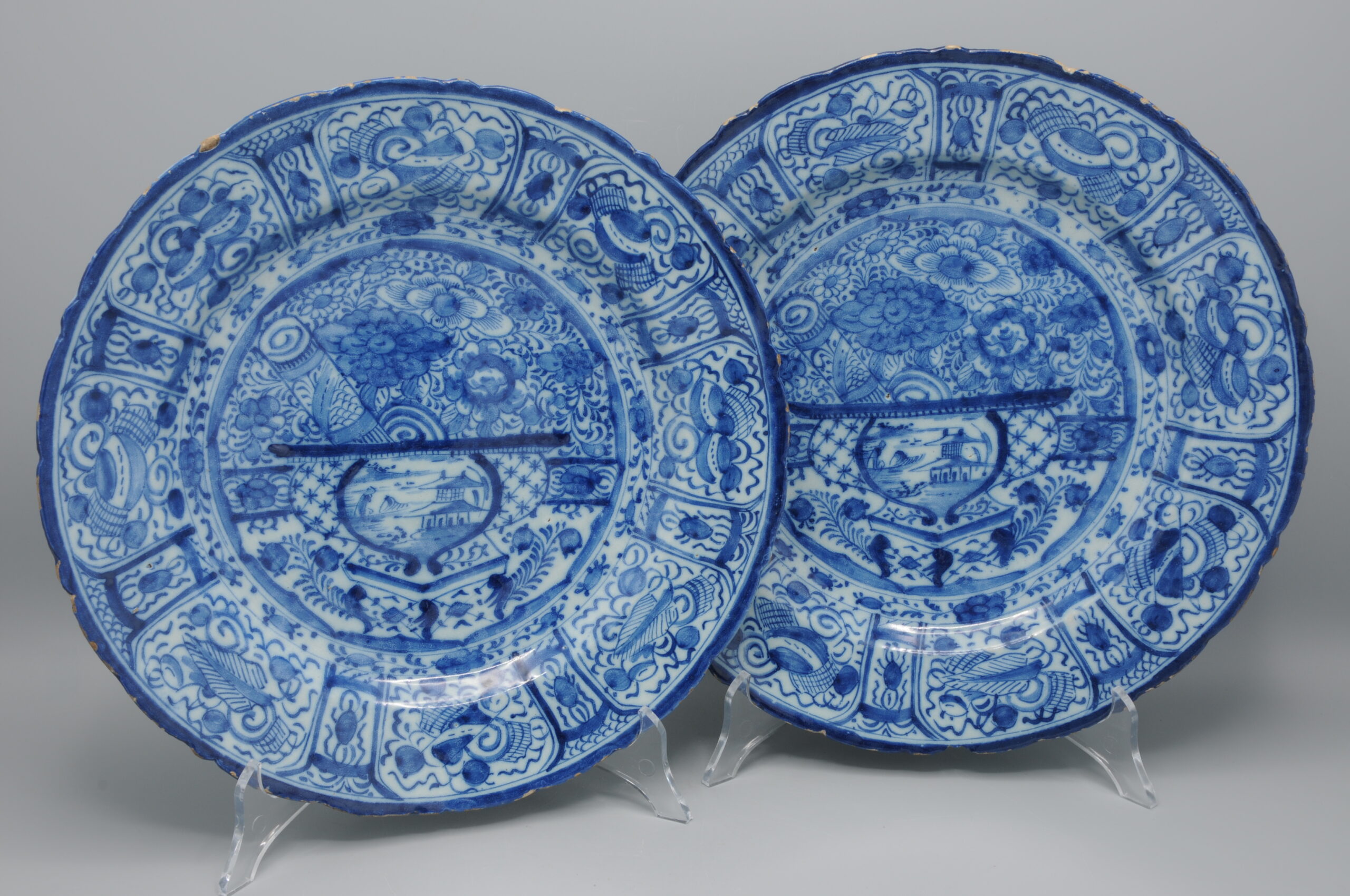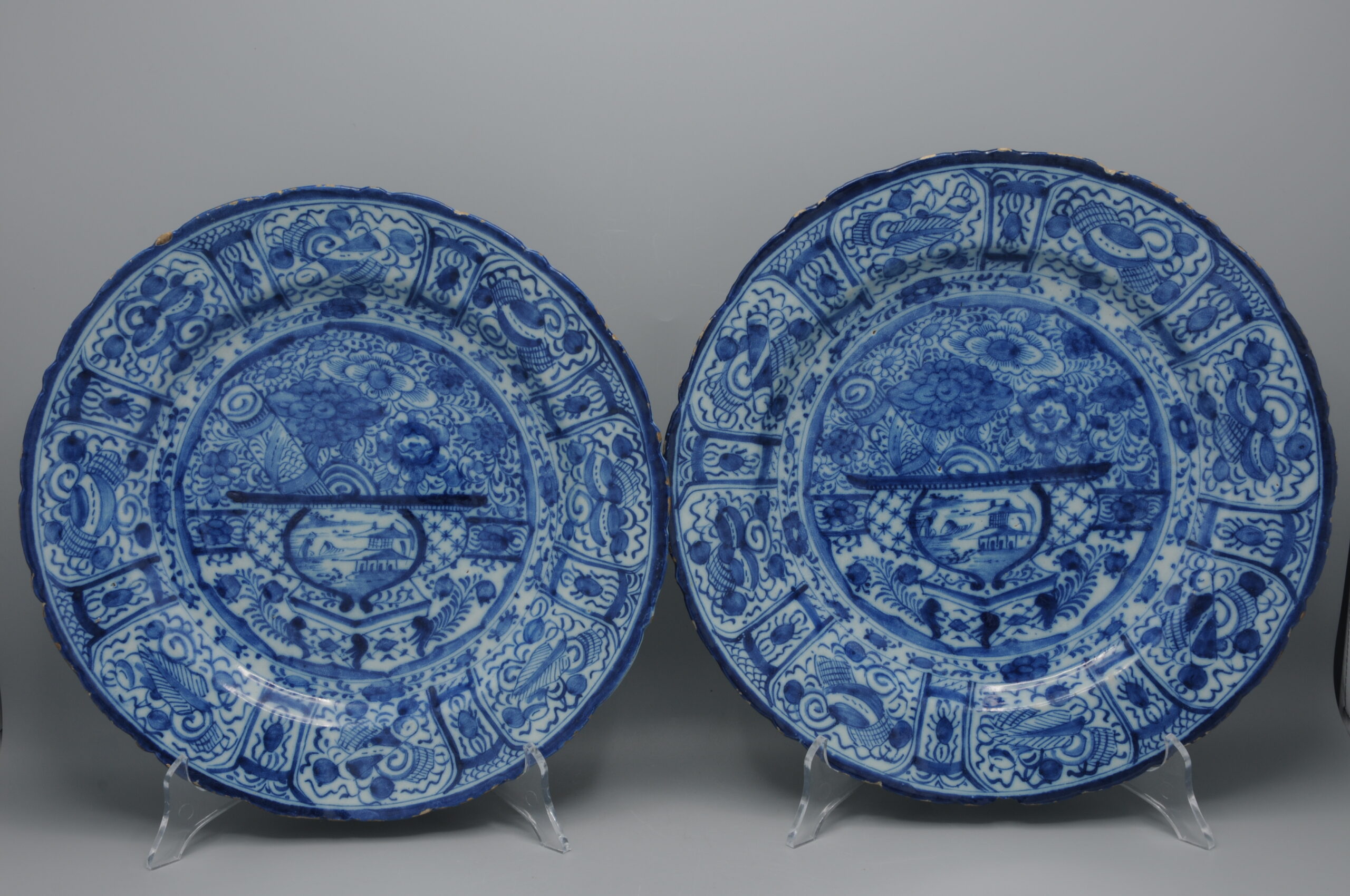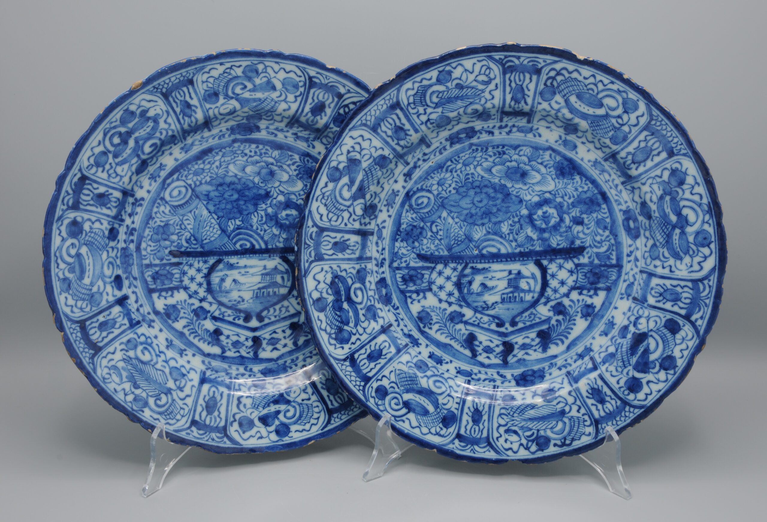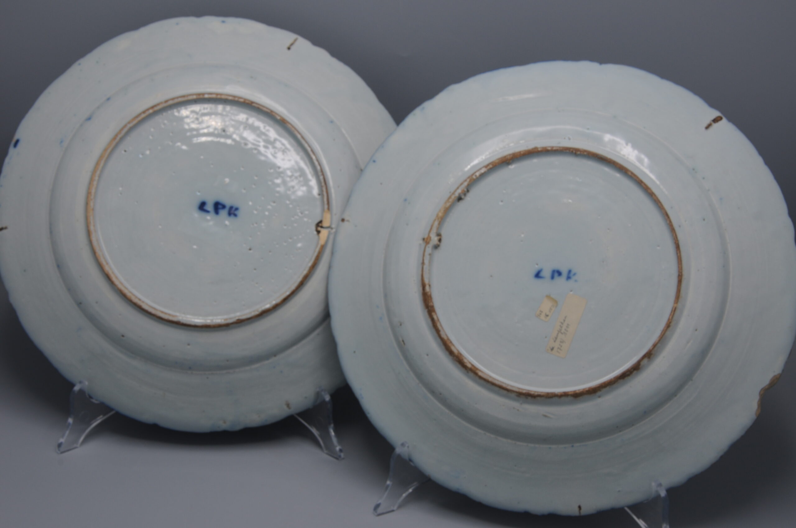 These plates exemplify the European adaptation of Chinese decorative symbolism in mid-18th century Delftware.