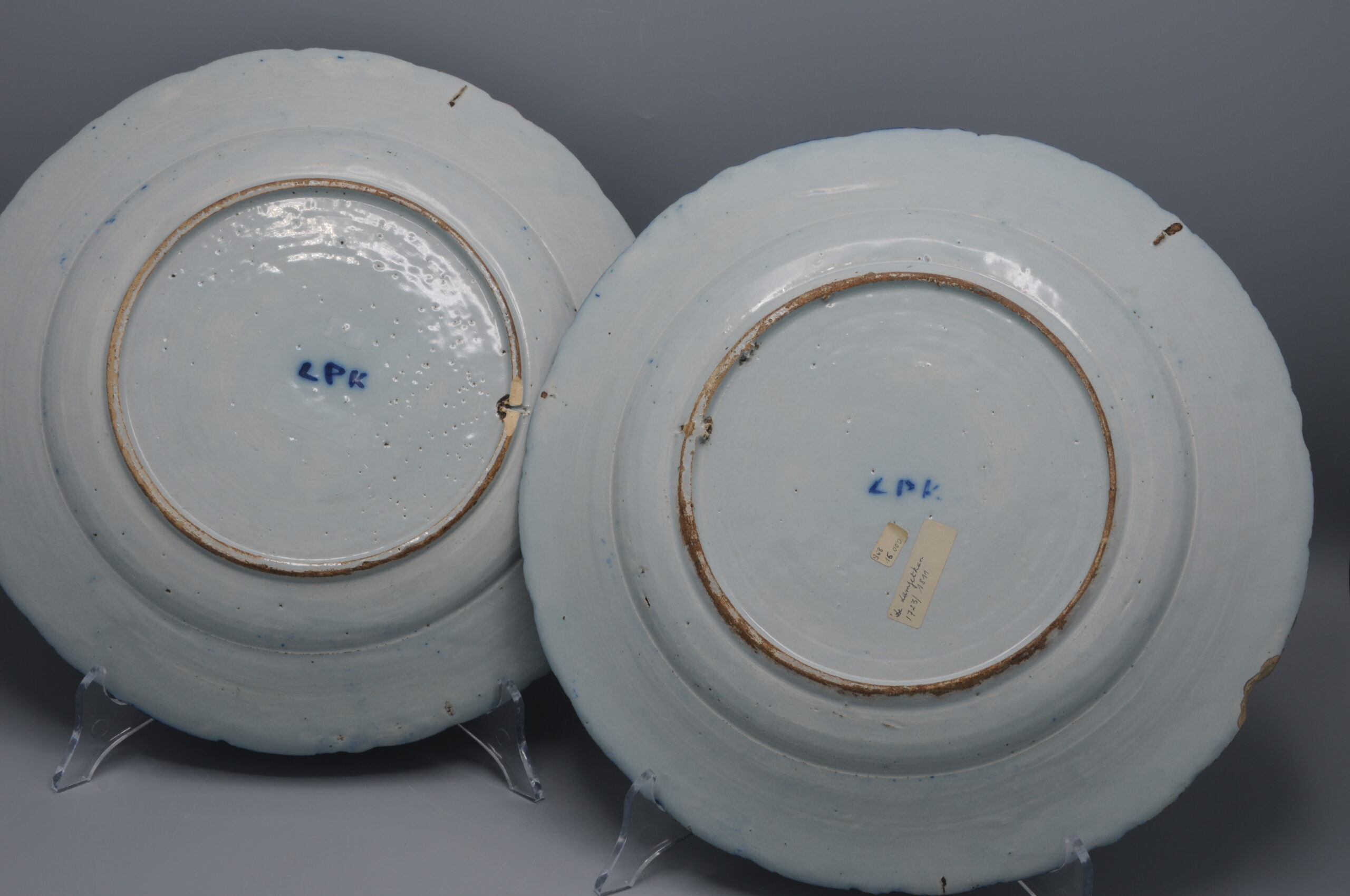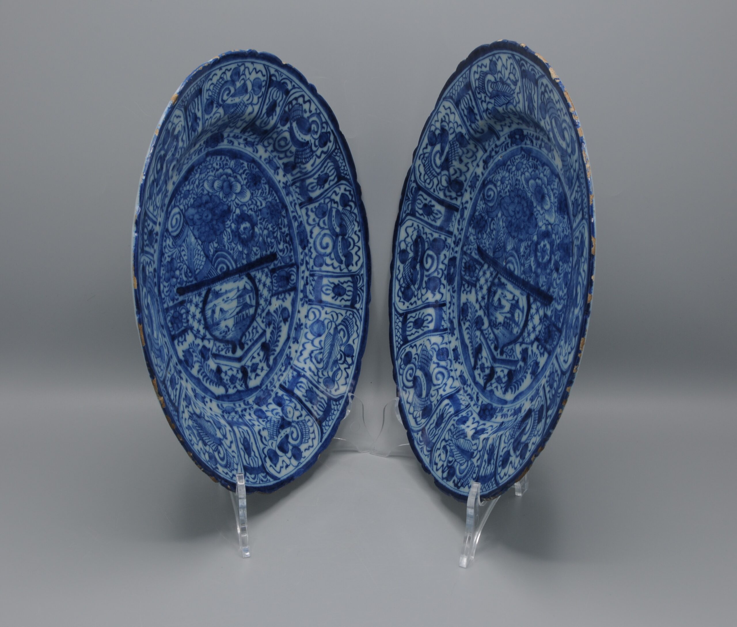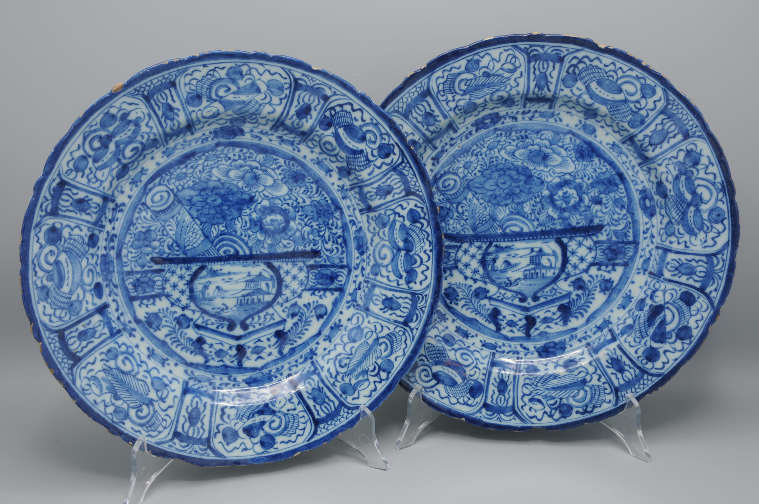 These plates exemplify the European adaptation of Chinese decorative symbolism in mid-18th century Delftware.