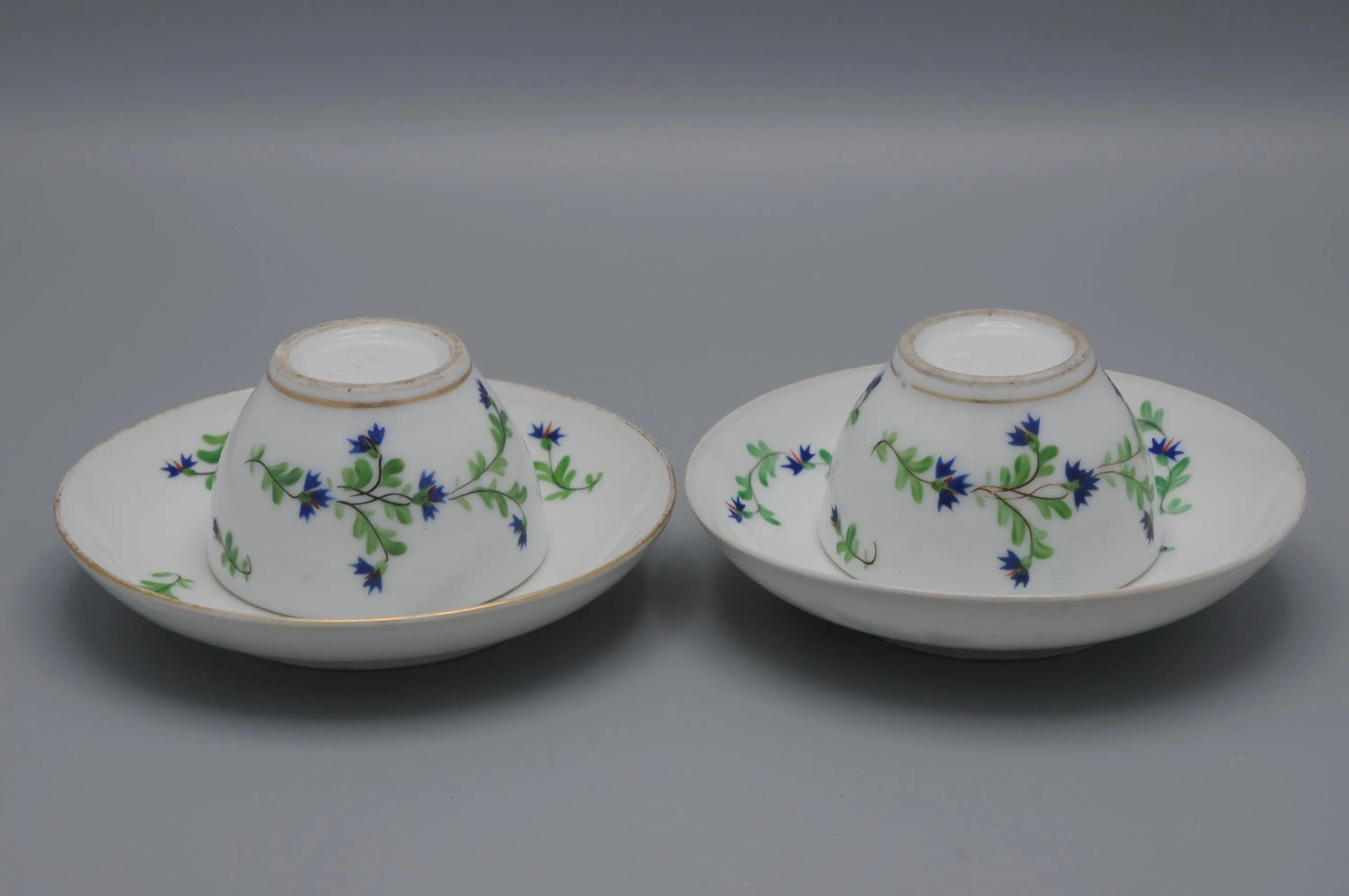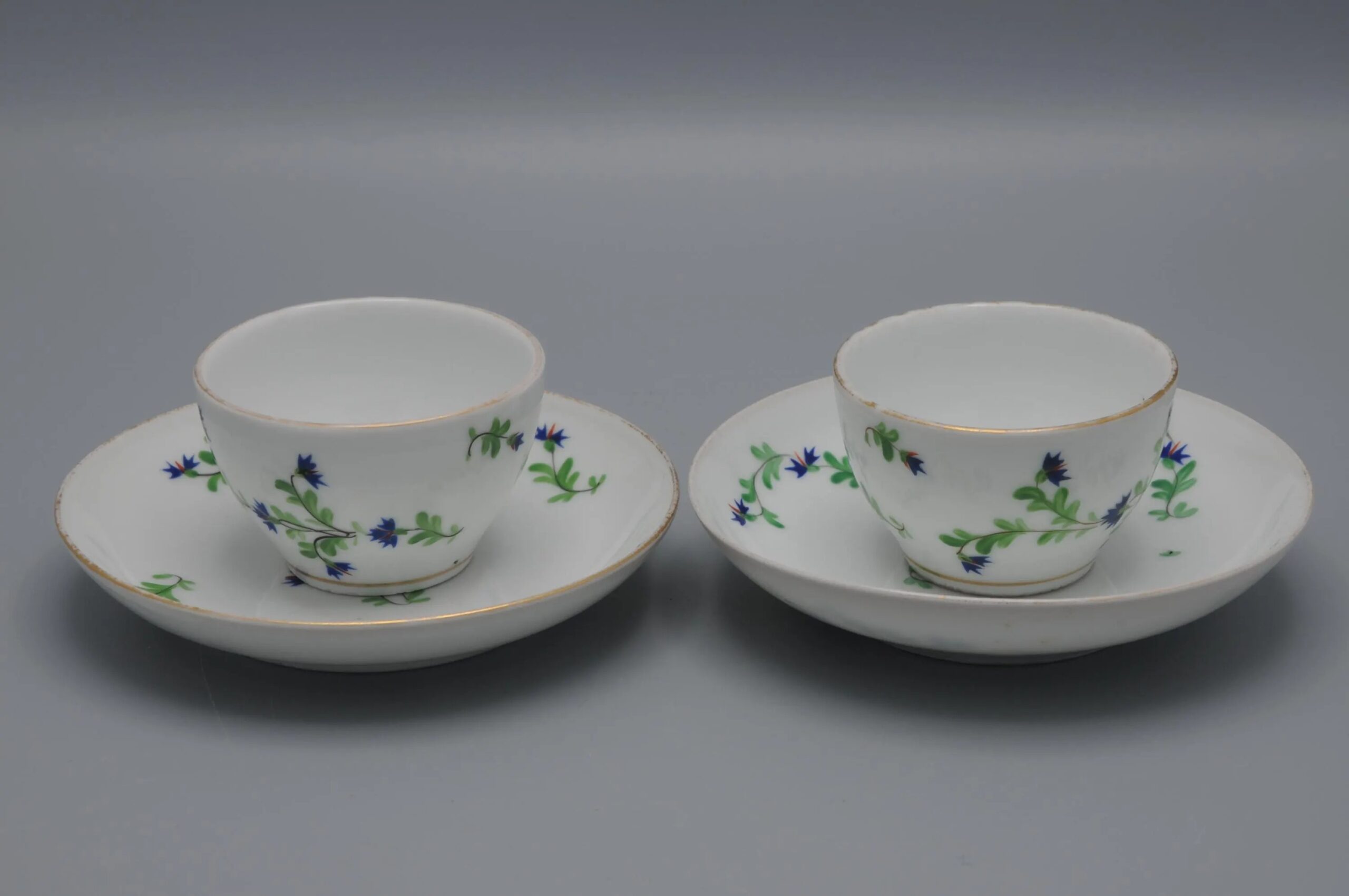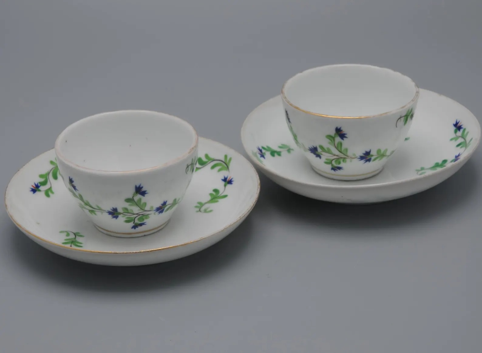 Set of 2 cups and saucers with decoration of corn flower sprays and flower buds.