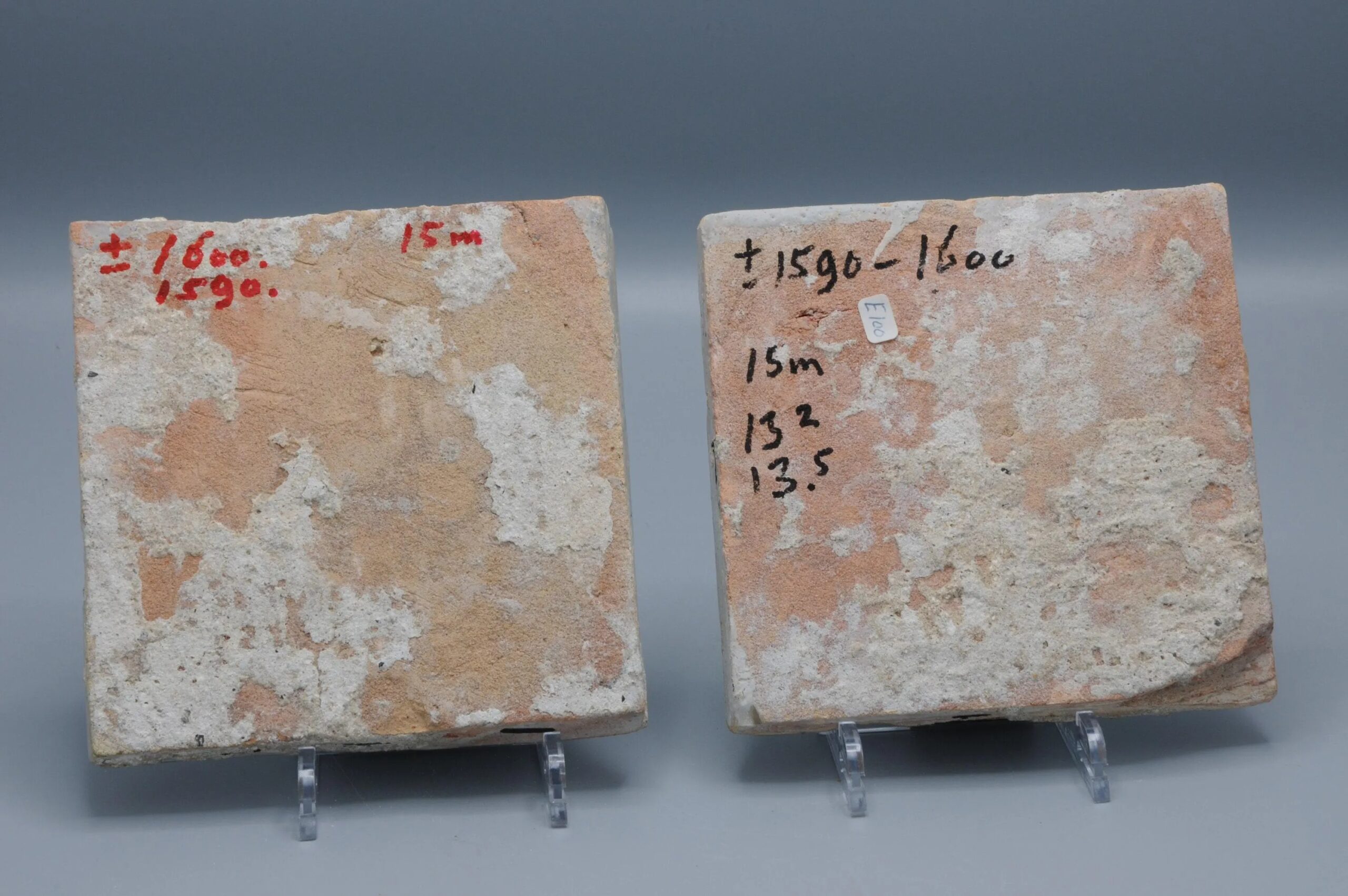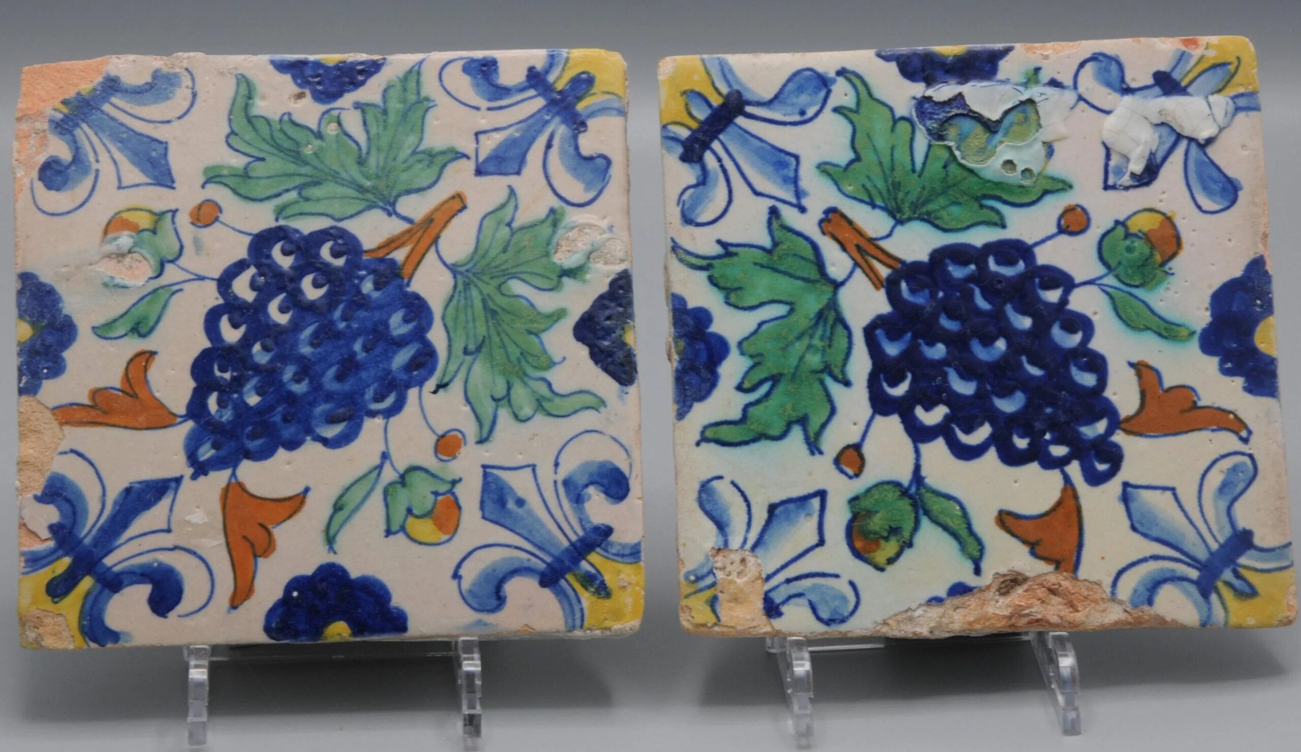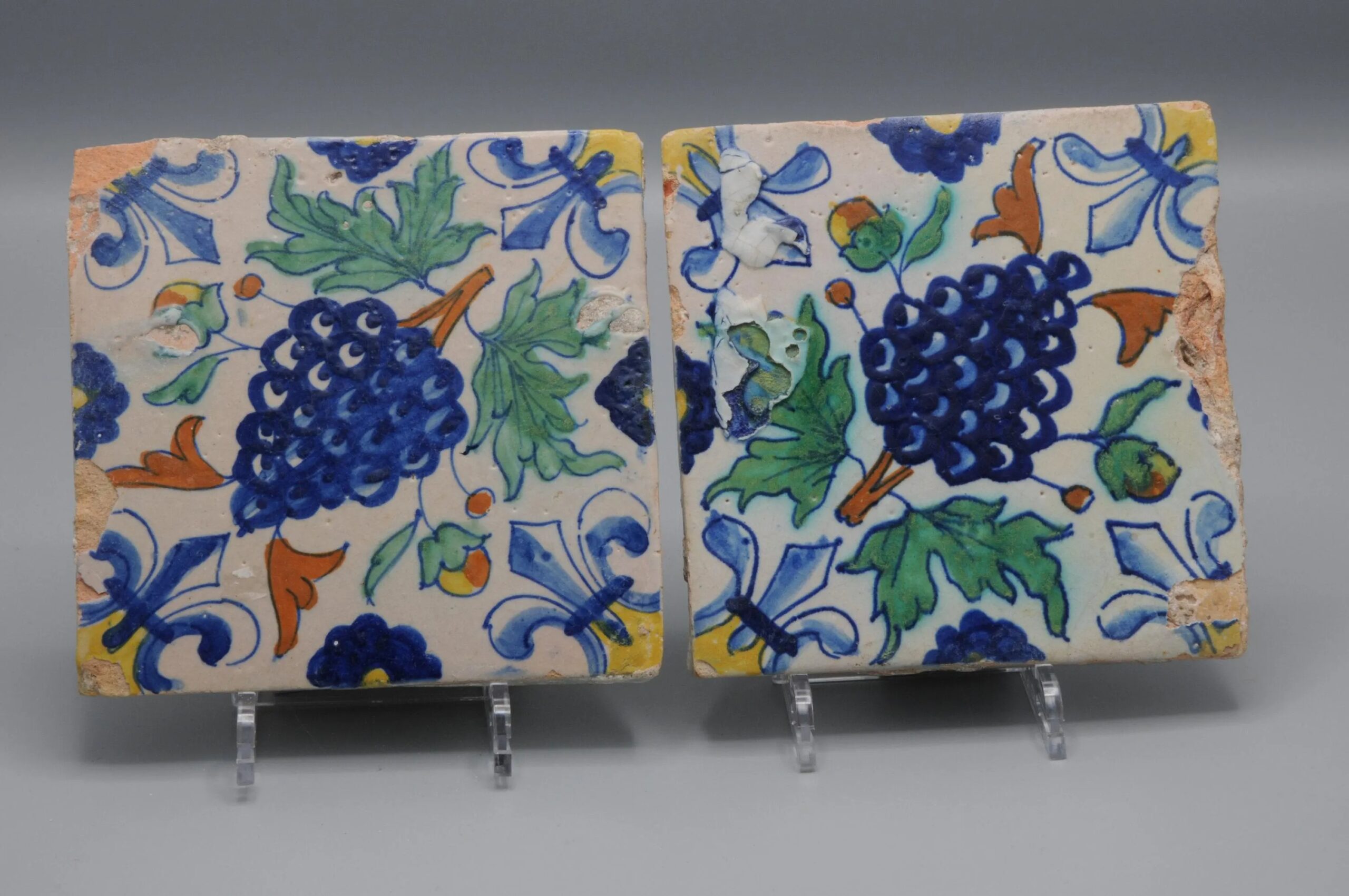 Pair of early 17th century Dutch renaissance Delft tiles, Each with a multi-colored (blue, green, orange and yellow) painted bunch of grapes, placed diagonally. Along the edges, half a rosette and a lily in the corners.