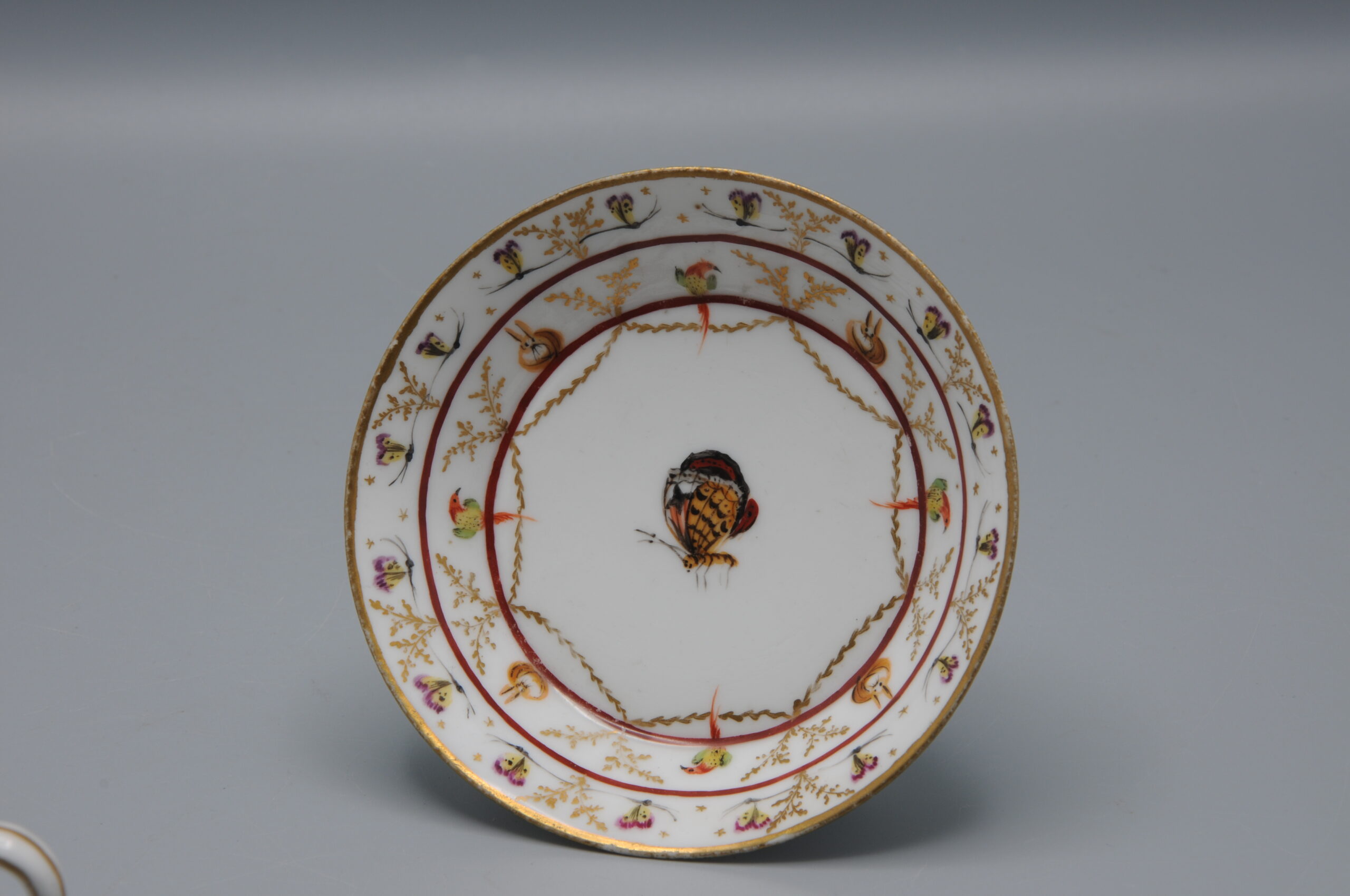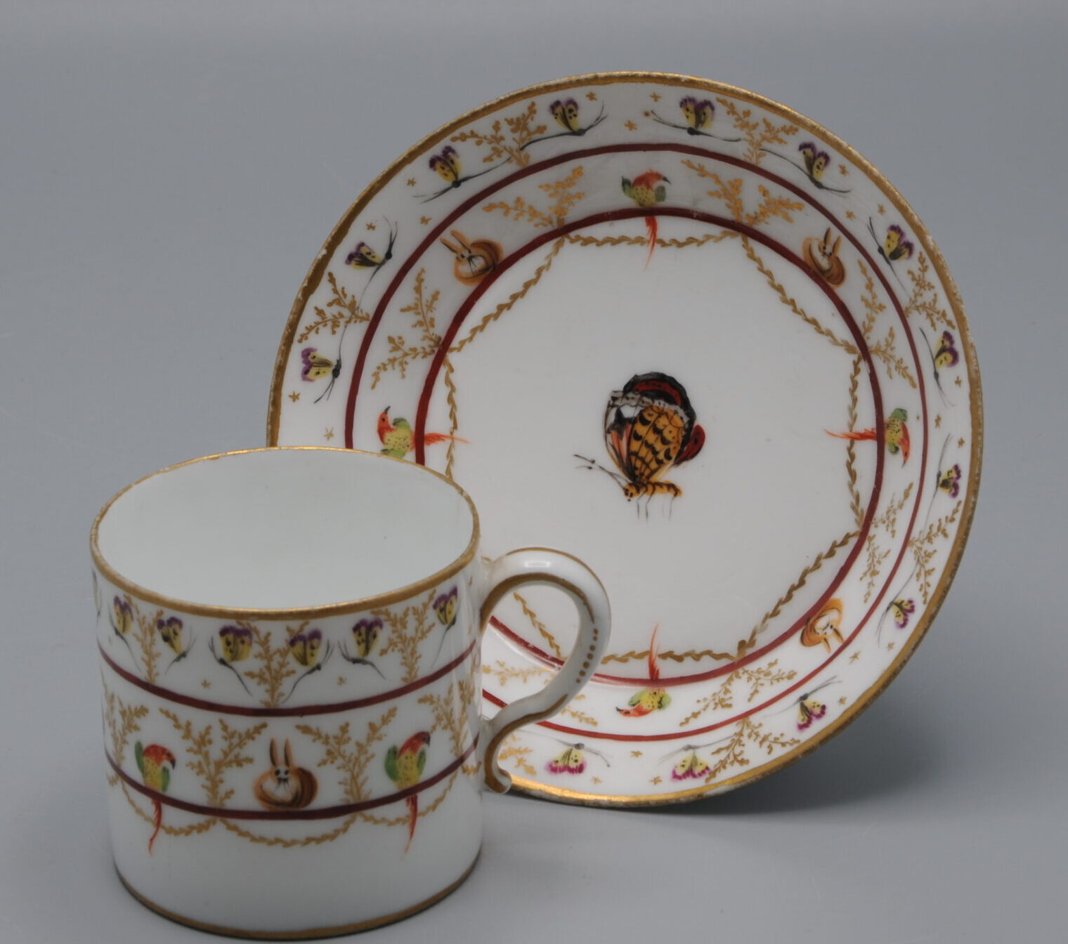Elegant cup and saucer, of the model ‘Litron’ decorated with 2 ornament friezes depicting parakeets and rabbits and iinsects withing elaborate gilded garlands. A butterly on the center of the saucer. Very delicately painted.