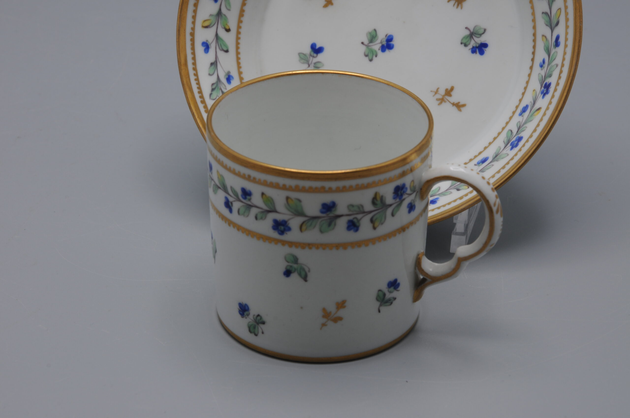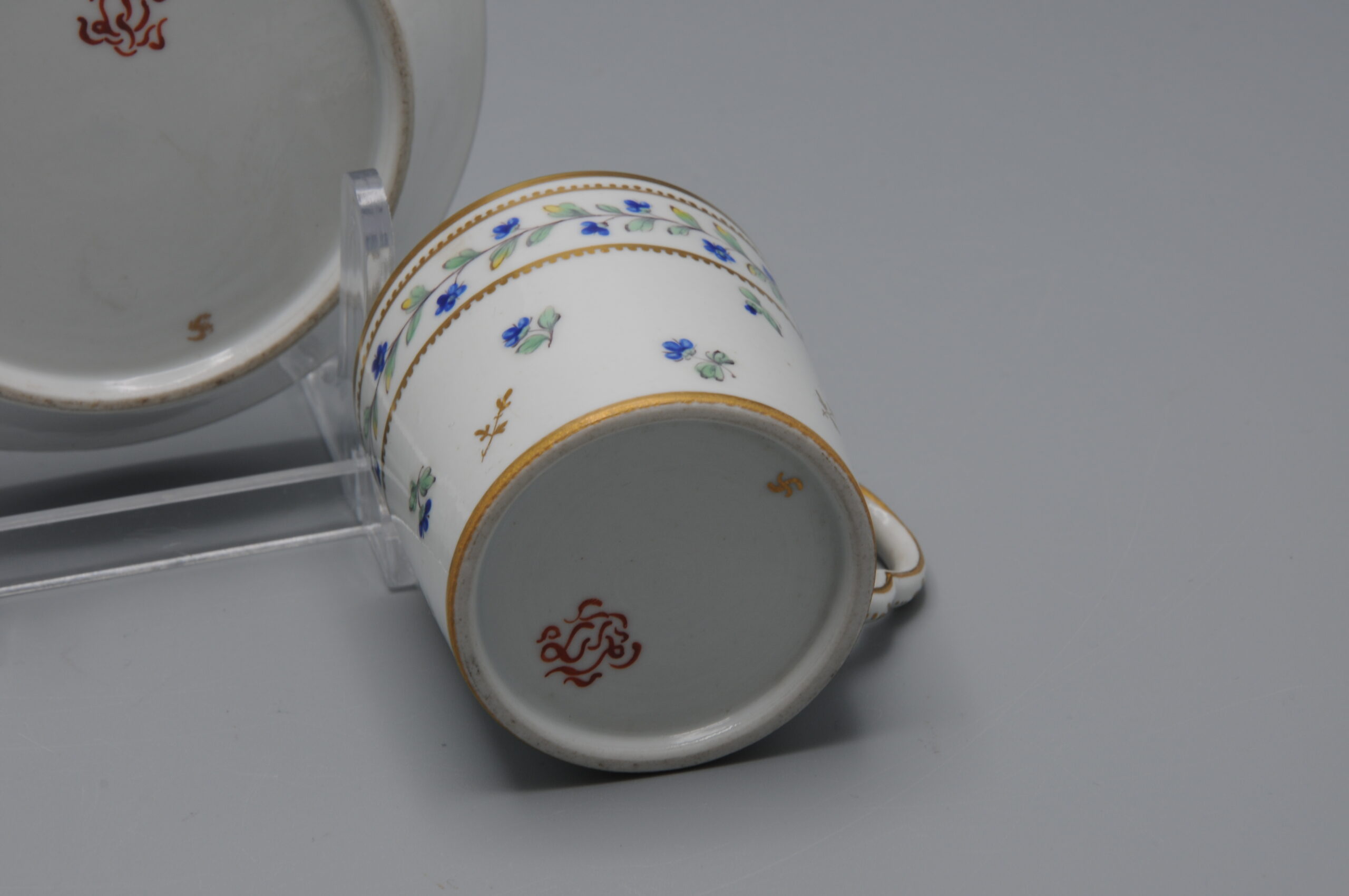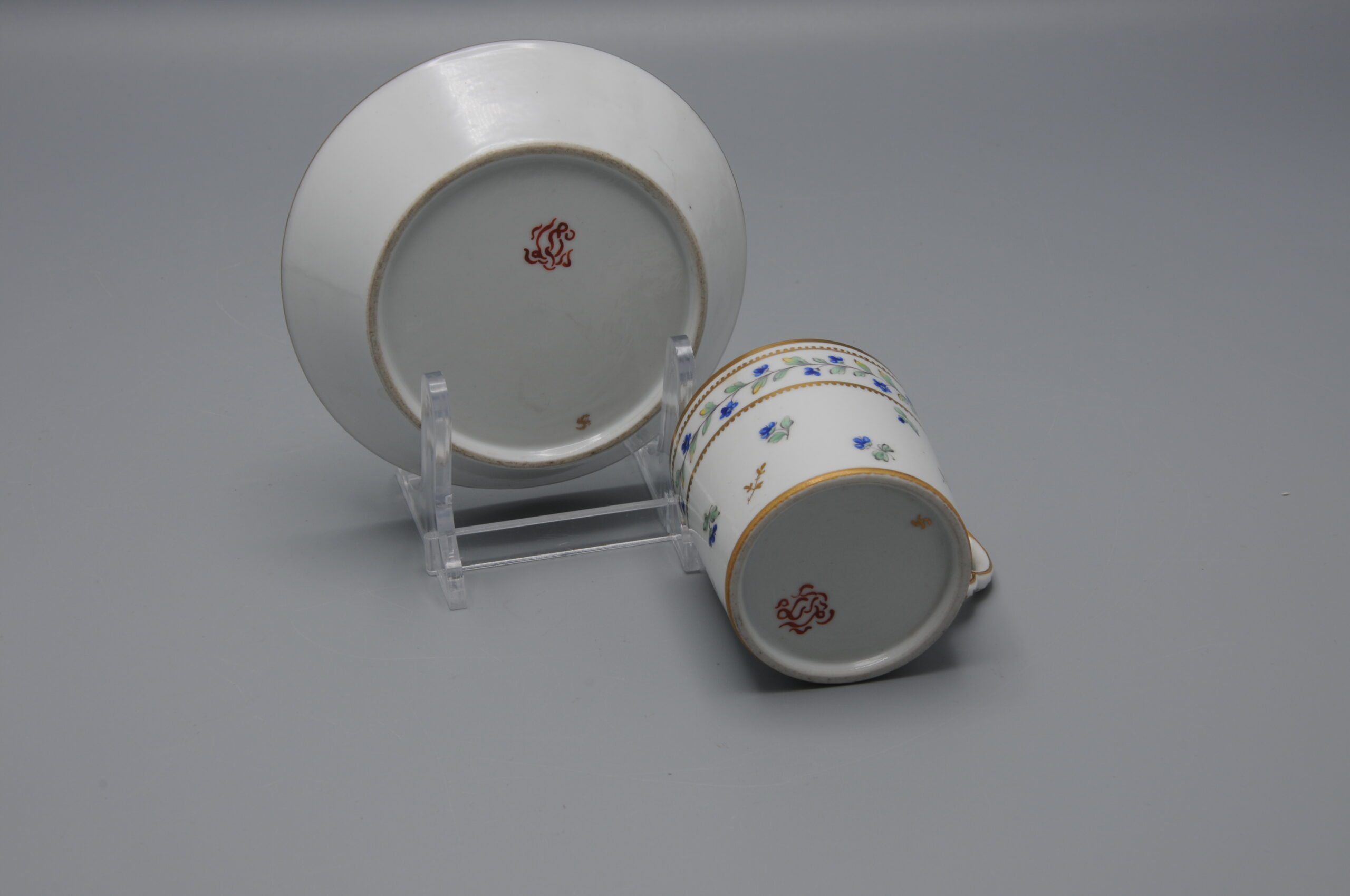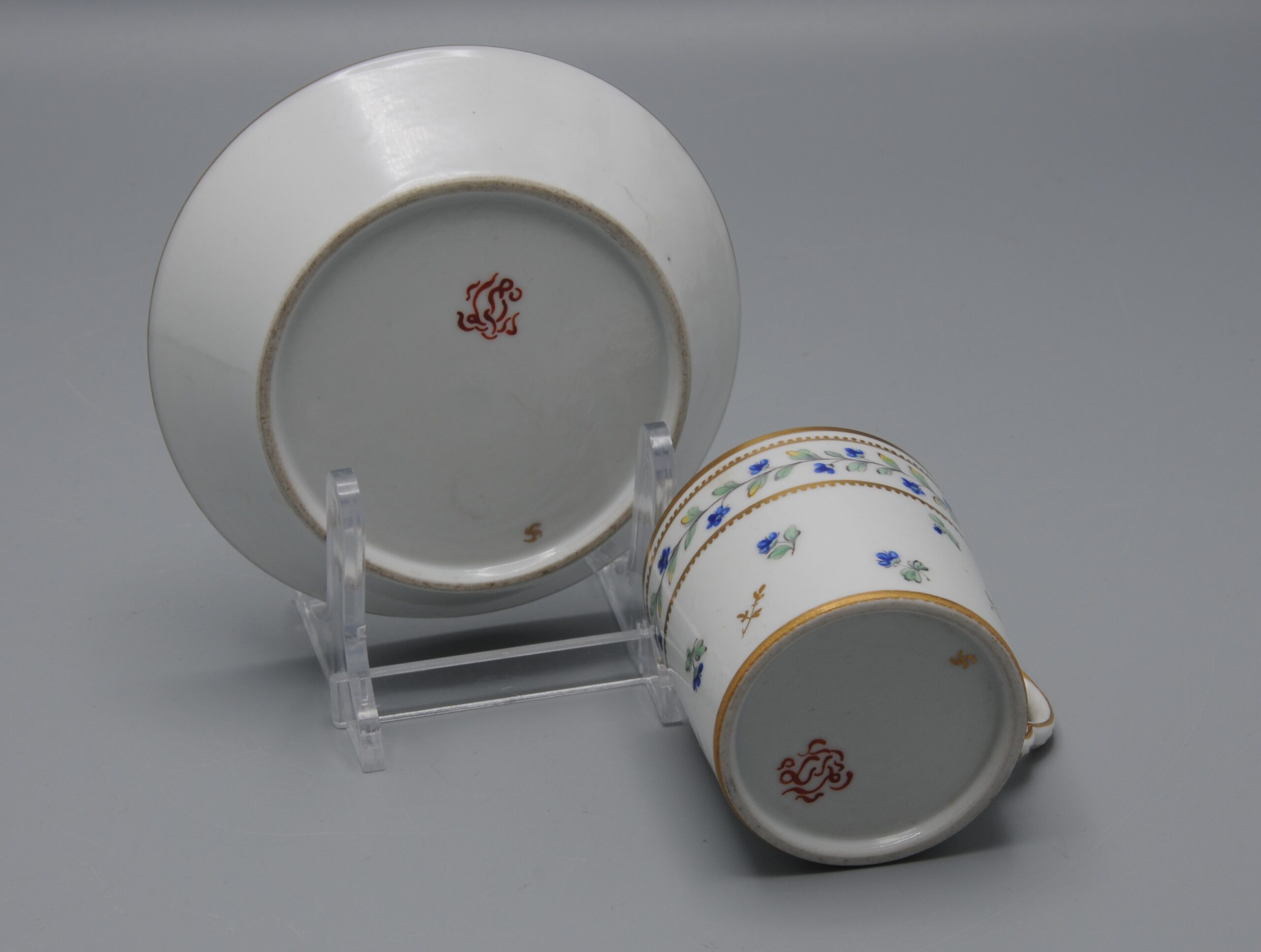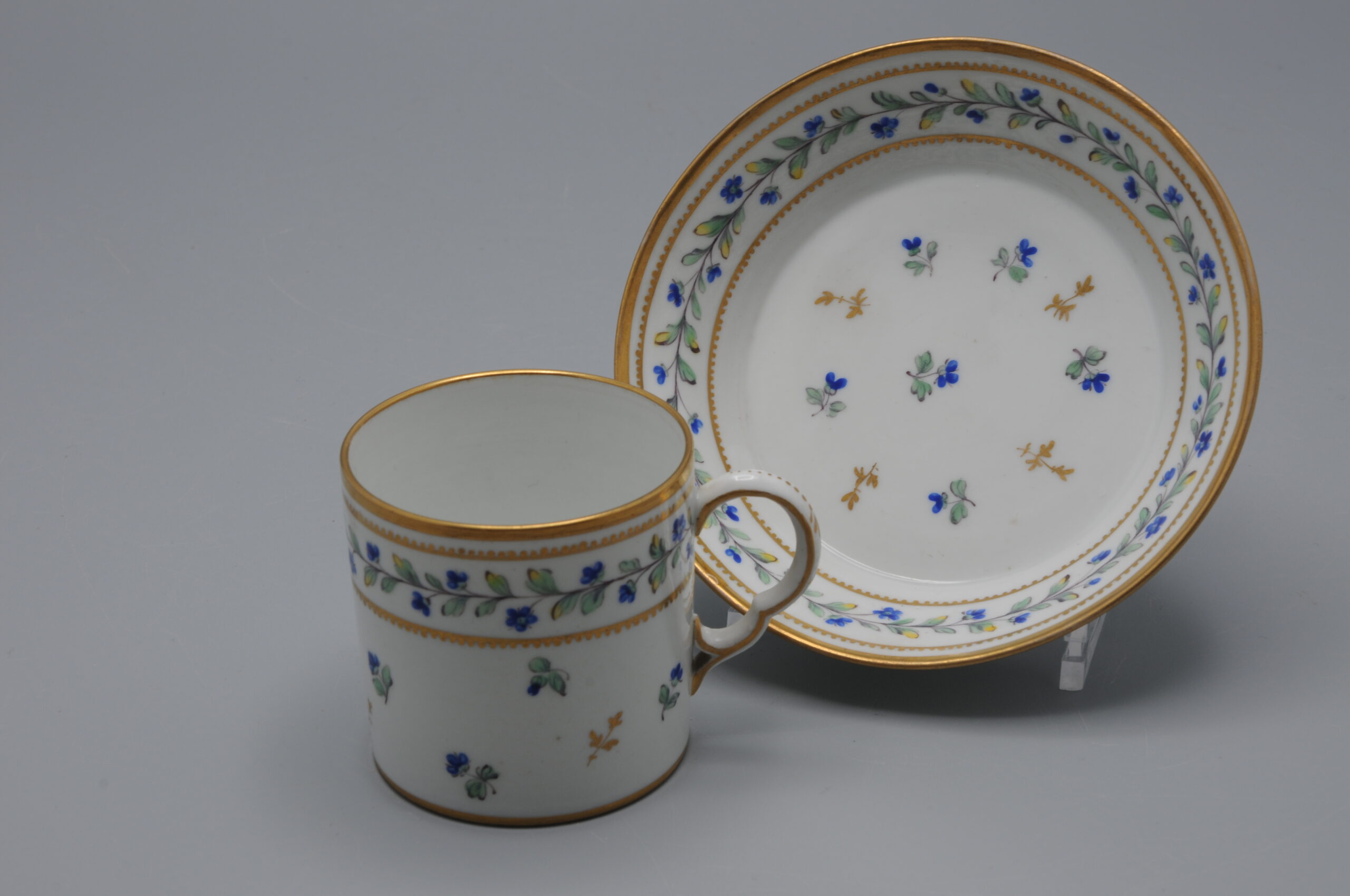 The form and decoration of the cup and saucer closely follow the late 18th-century models, with gilded accents applied to the rim and handle.