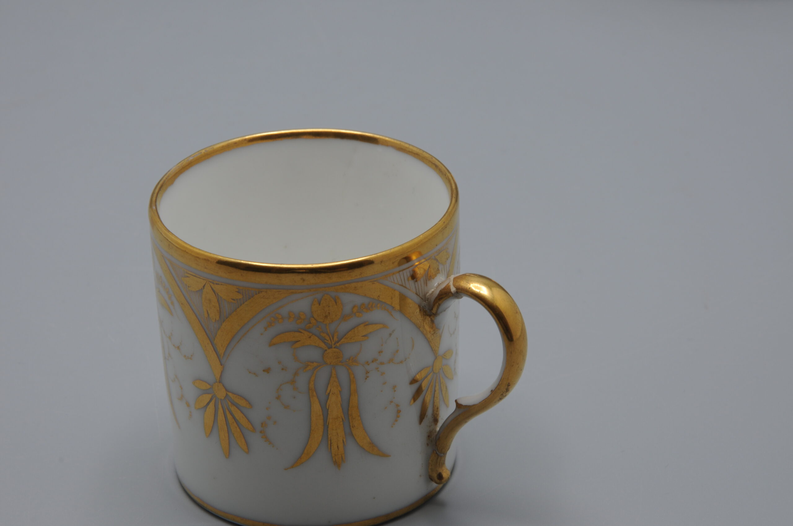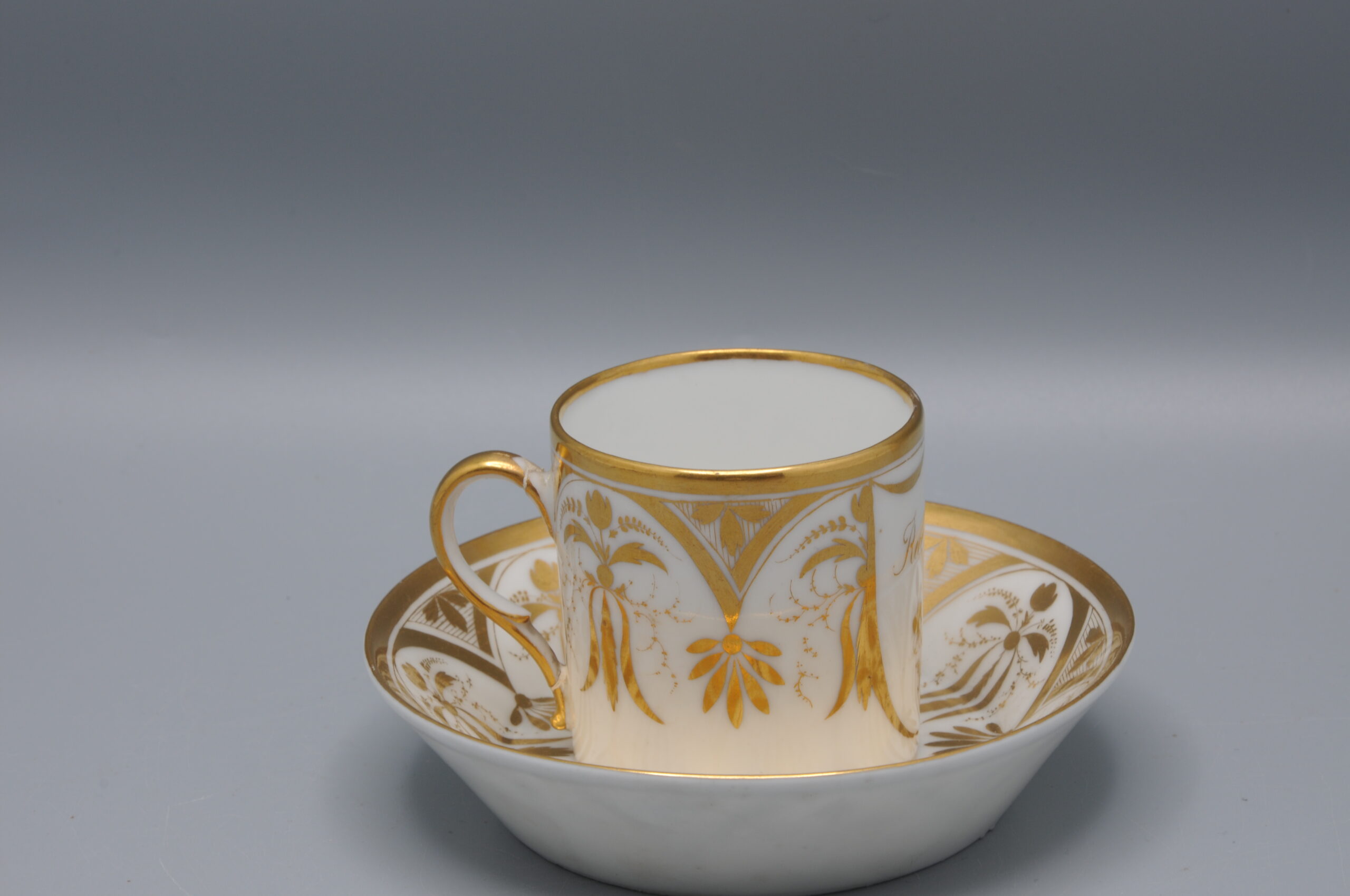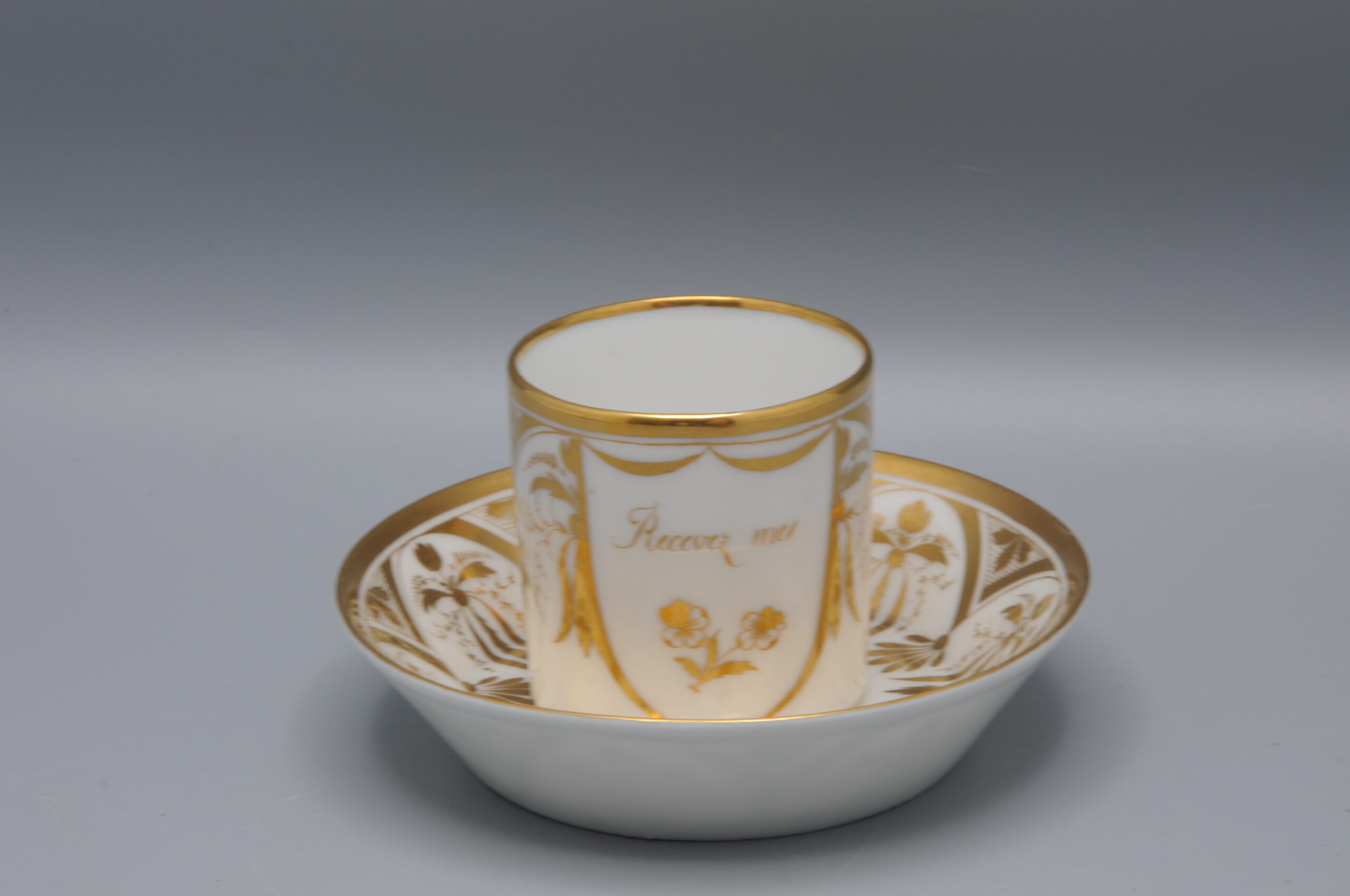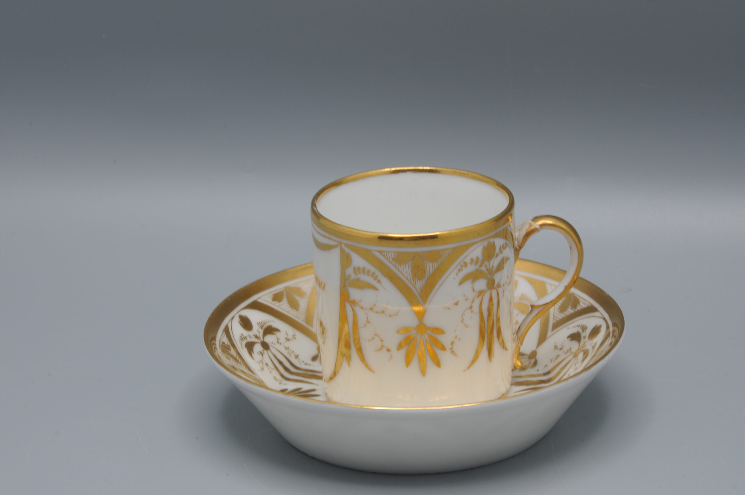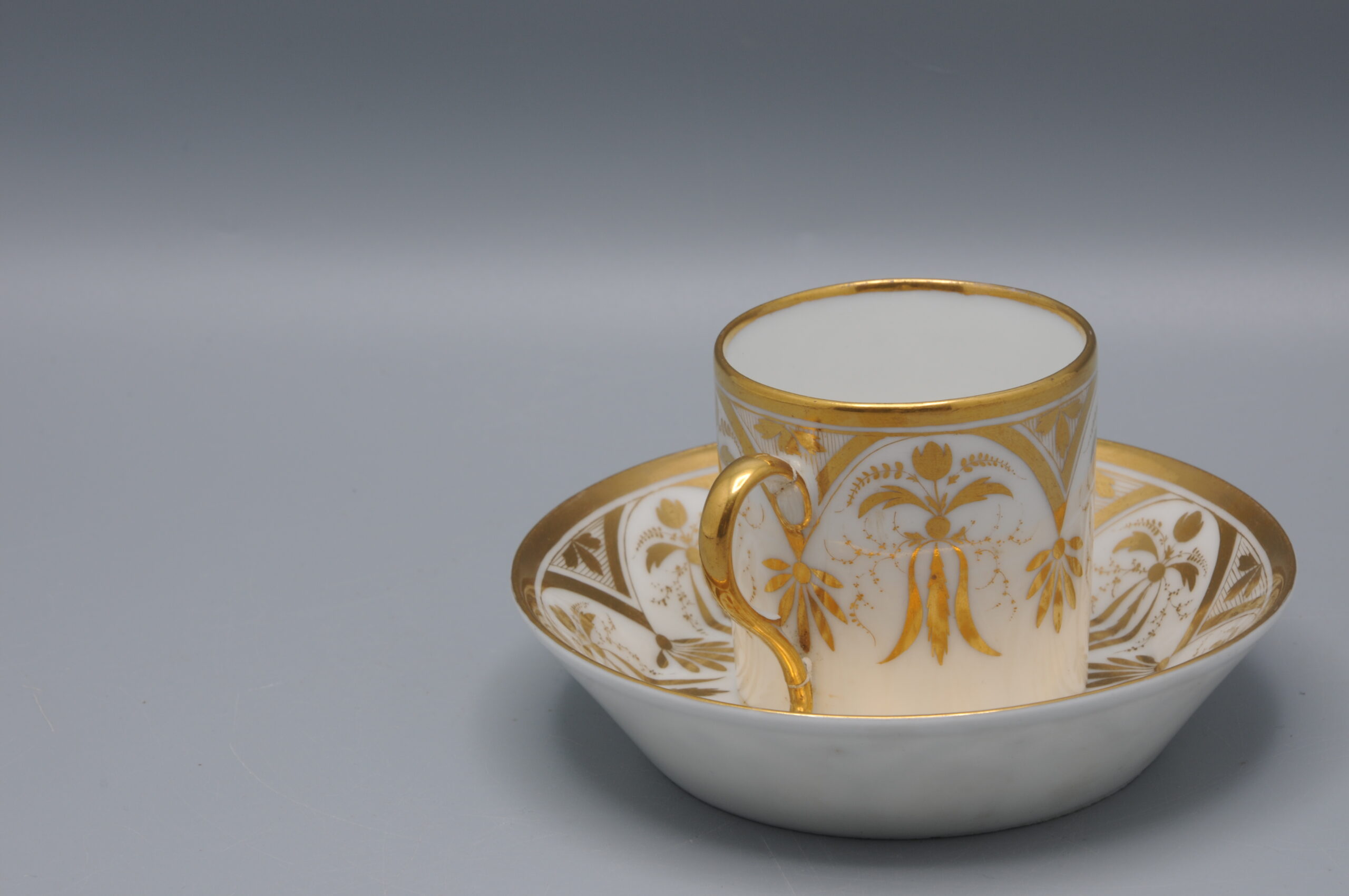 Elegant cup and saucer, of the model ‘Litron’ with elaborate gilt decoration