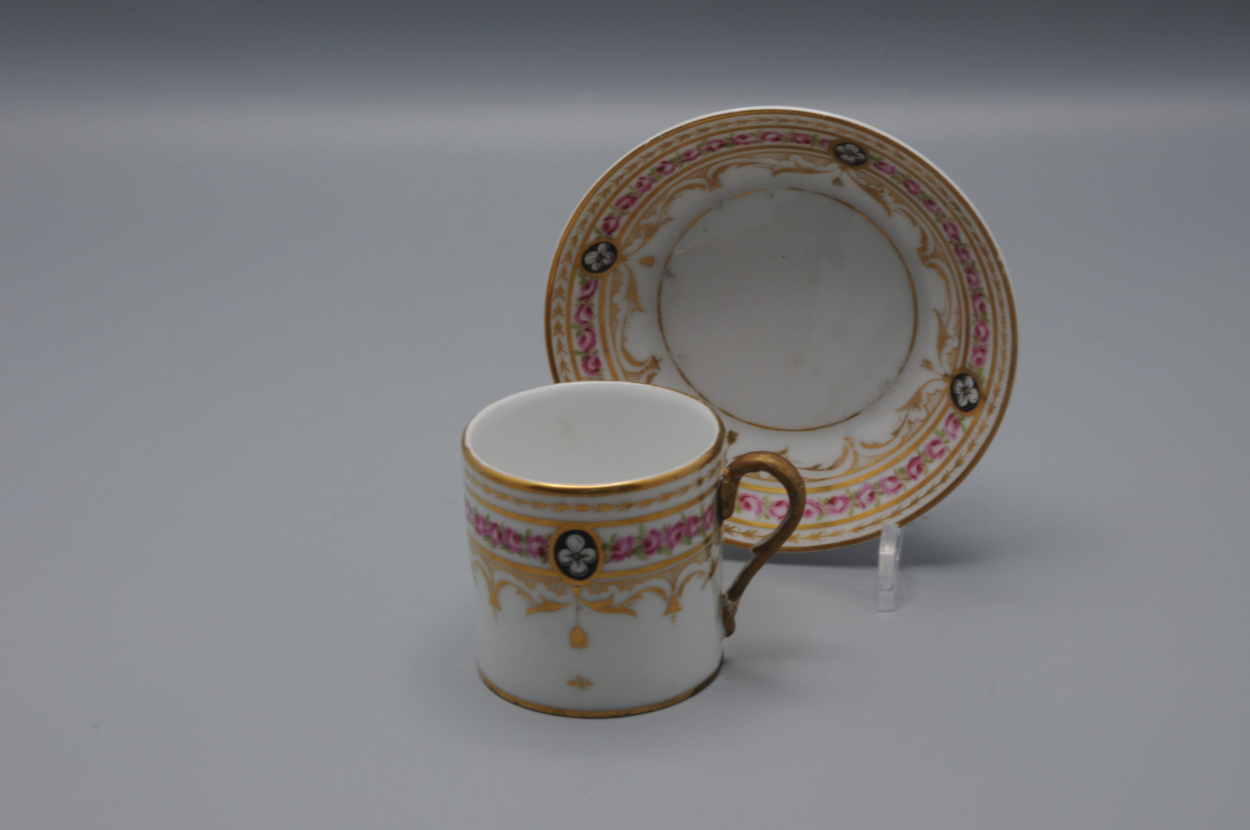 Elegant cup and saucer, of the model ‘Litron’ with a floral ornament and elaborate gilding.