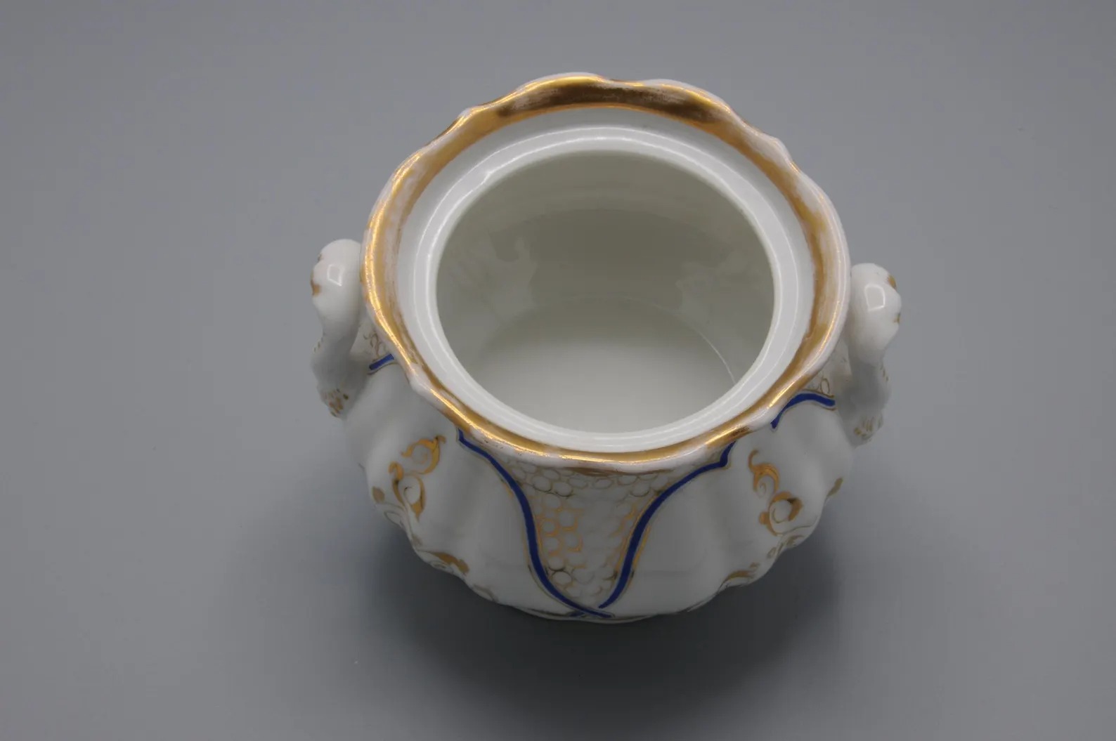 Wonderful jar and cover for sweets by Friedrich Adolph Schumann, Schumann Porzellan Manufaktur in Berlin. Featuring arabesque decoration in gold and blue.