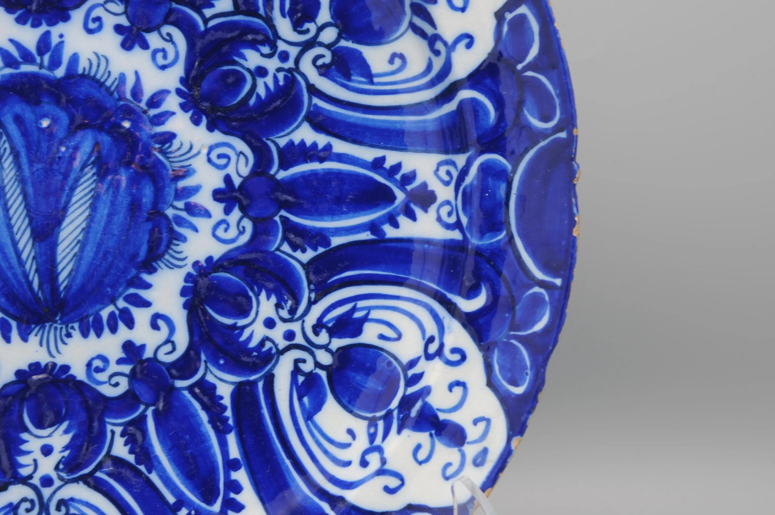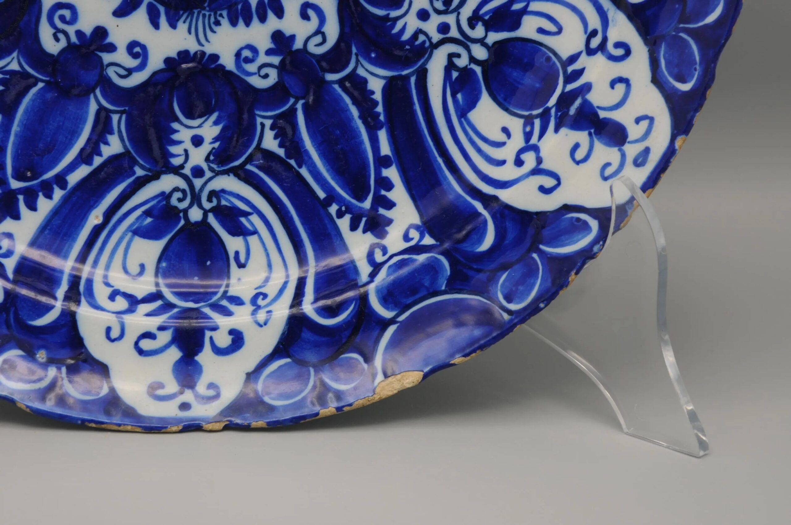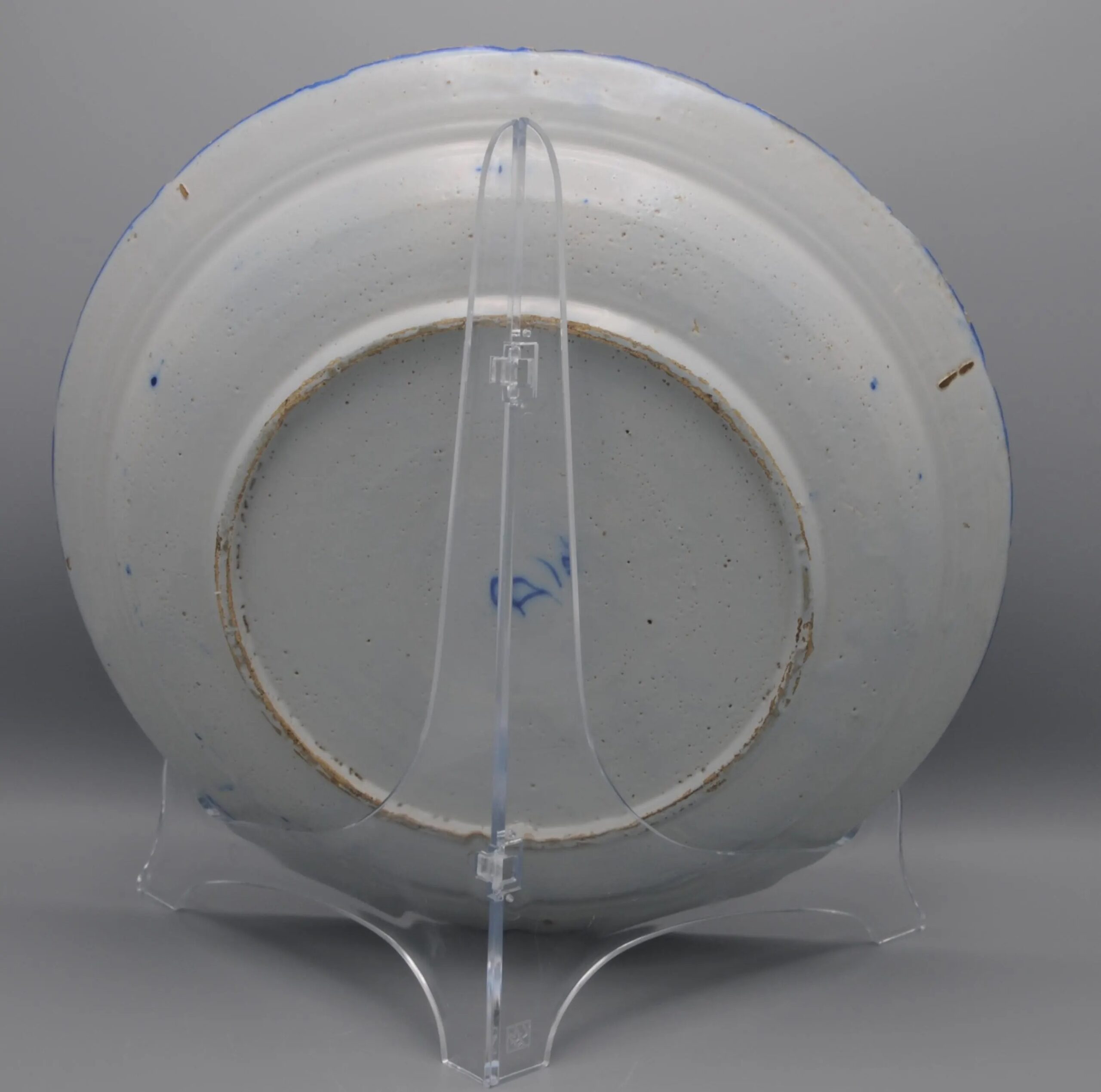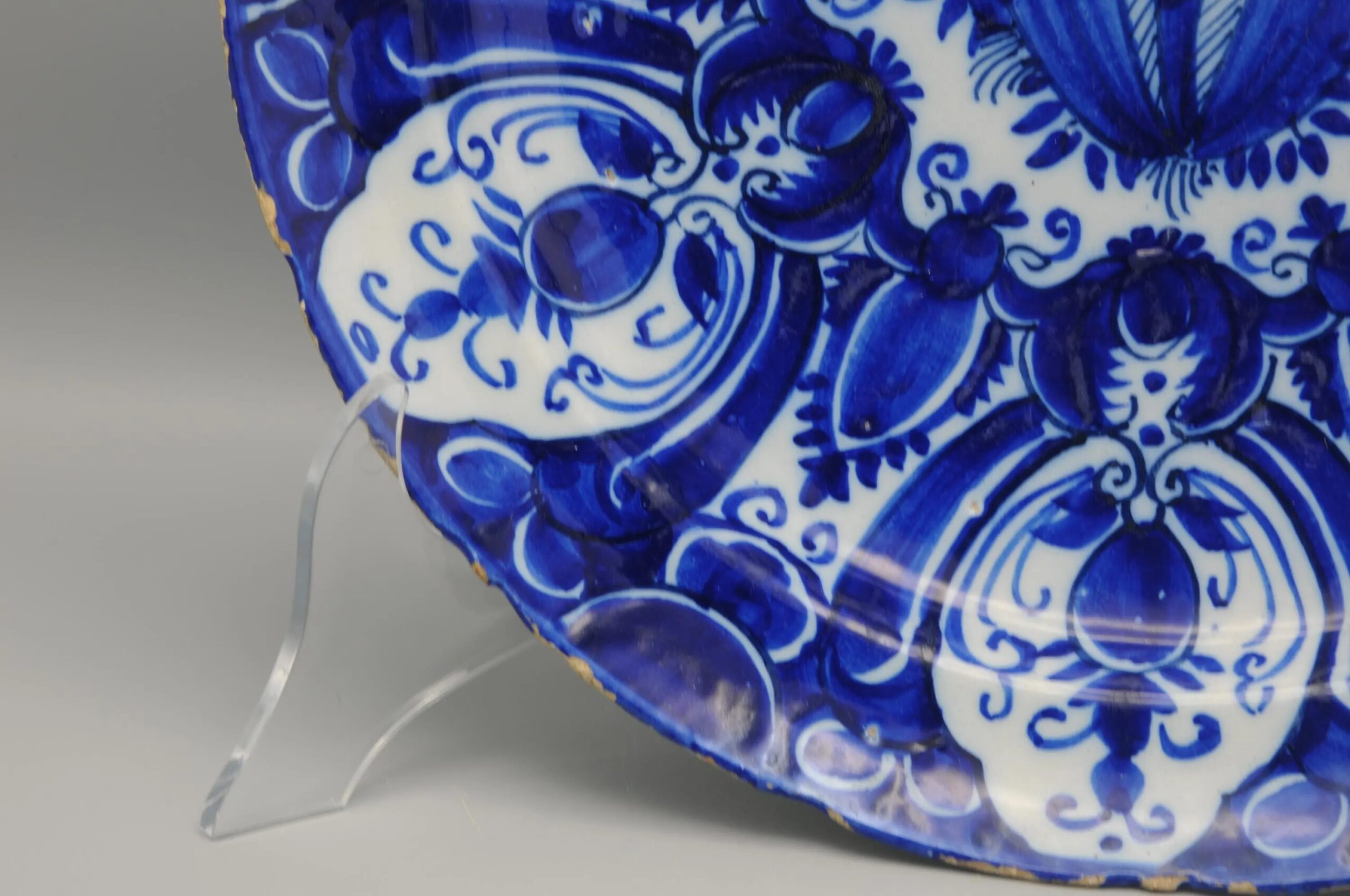 Mid-18th-century Dutch Delftware charger with a scalloped rim, decorated in cobalt blue on a white tin-glazed ground.