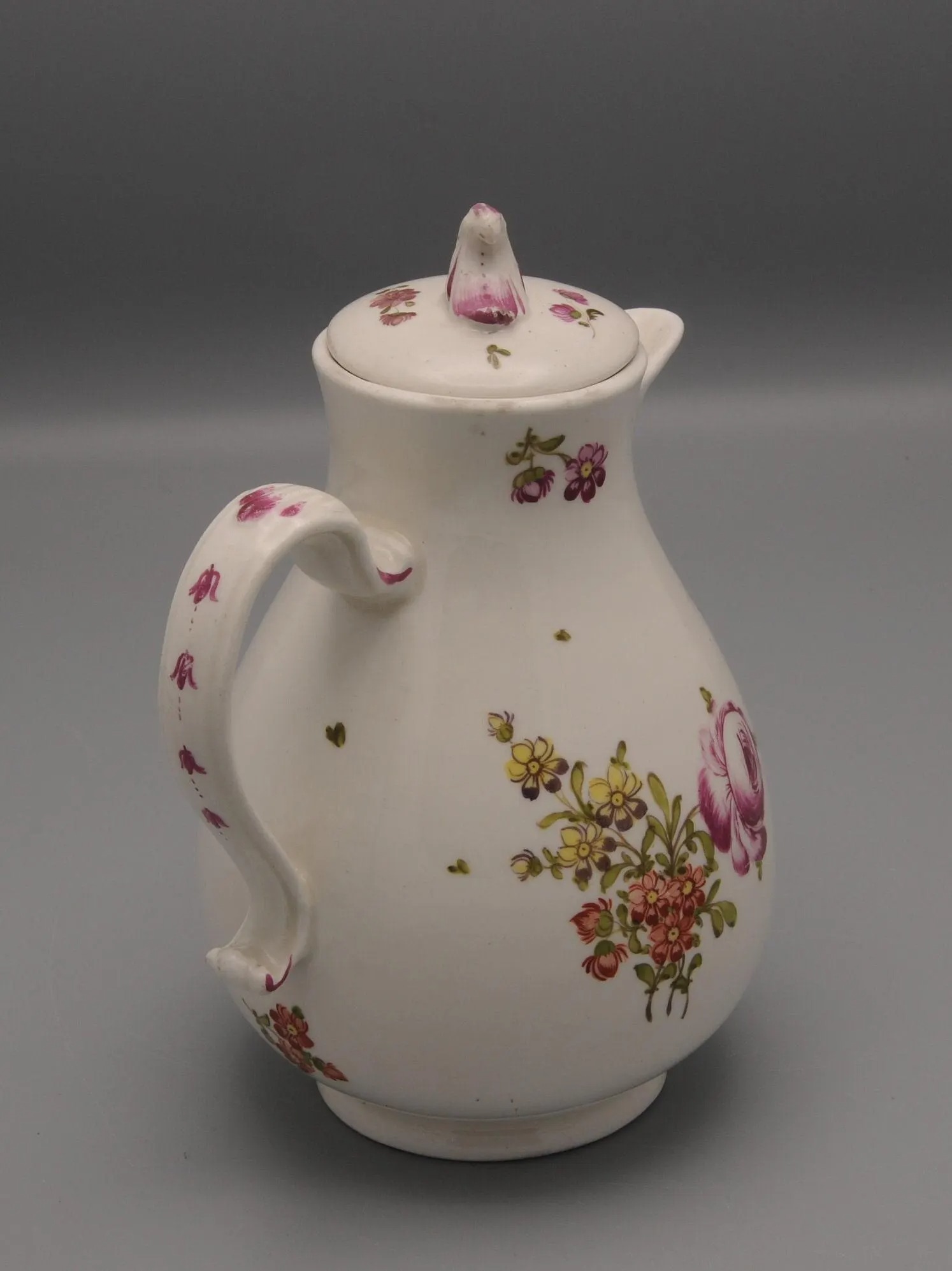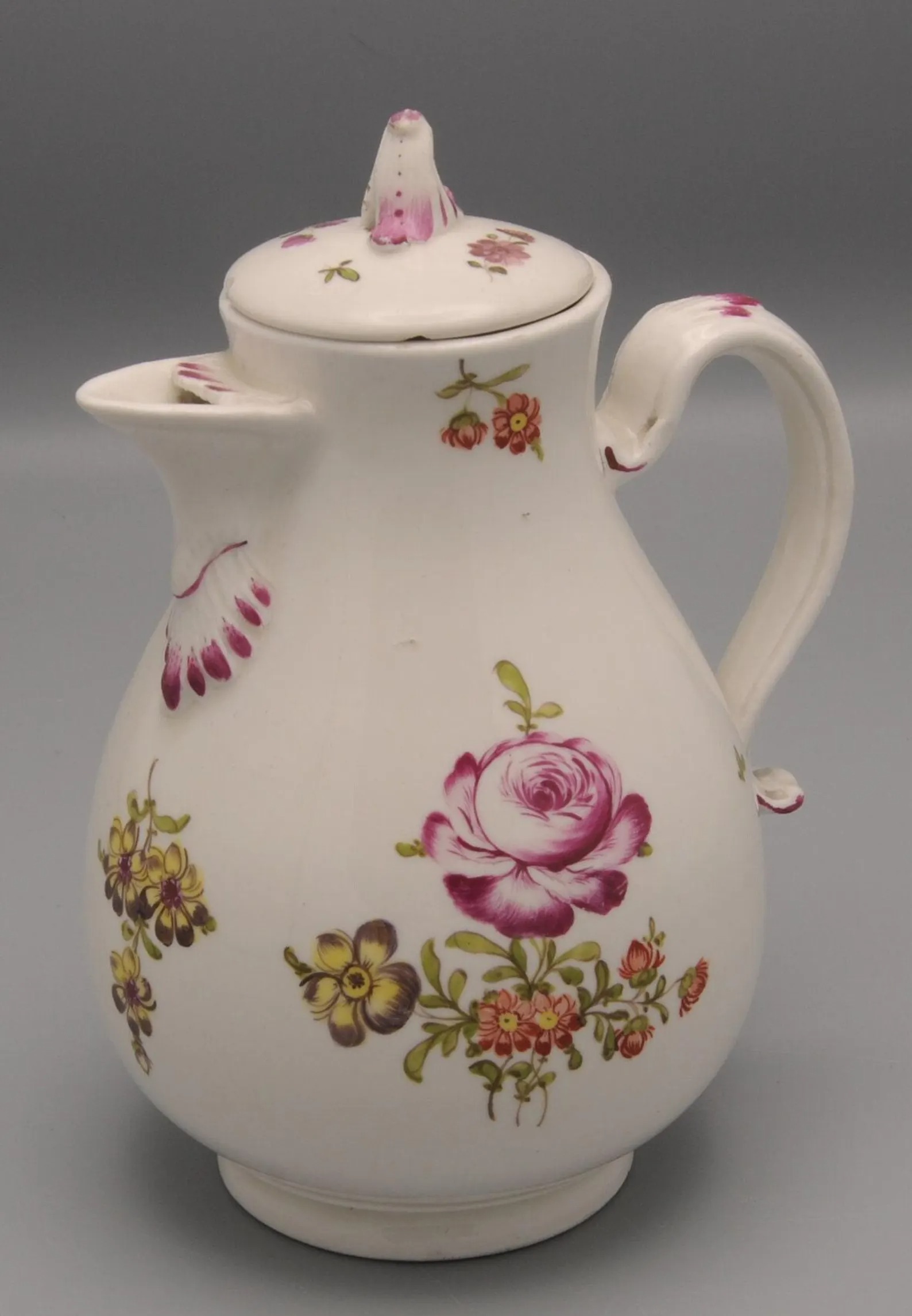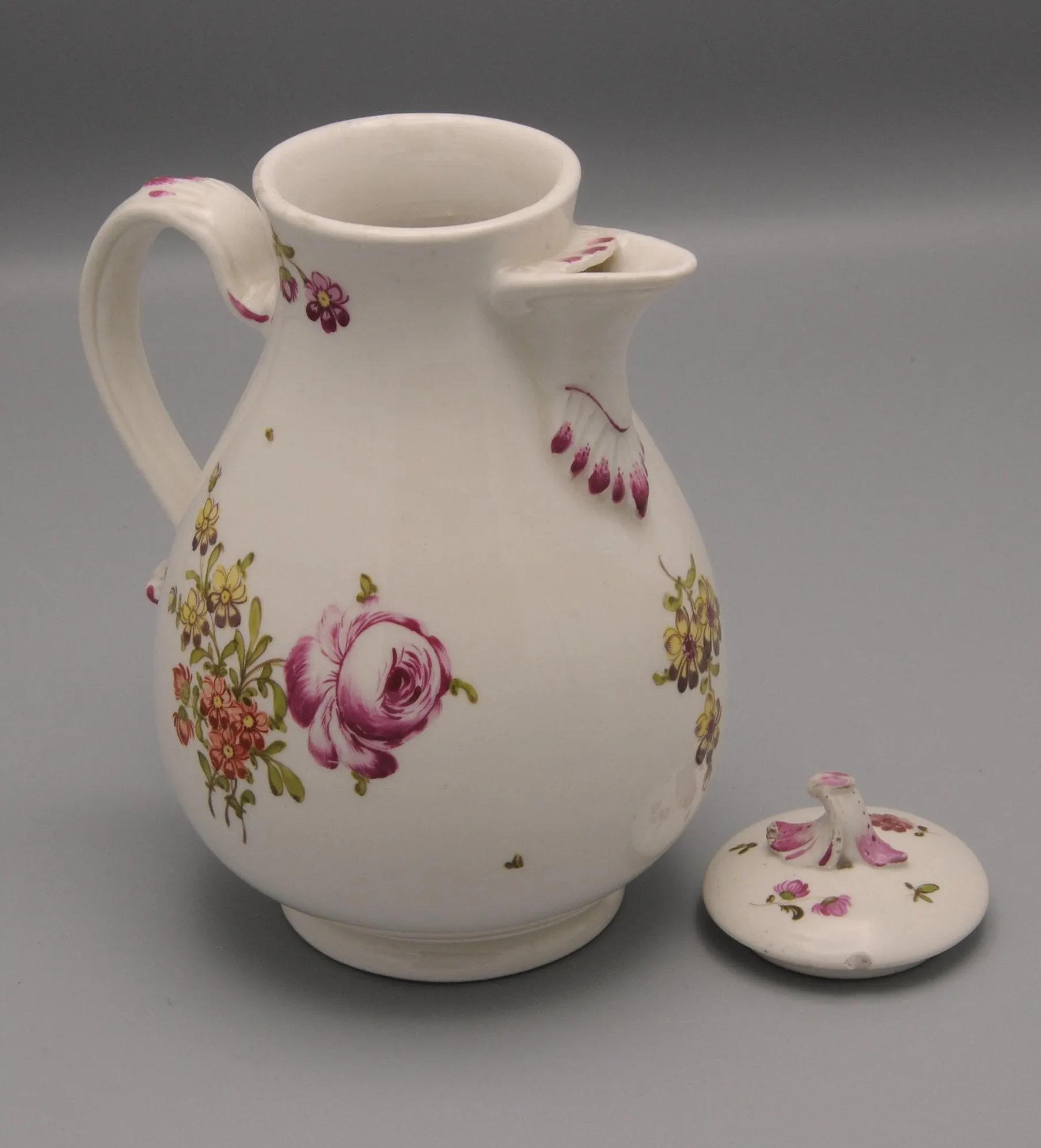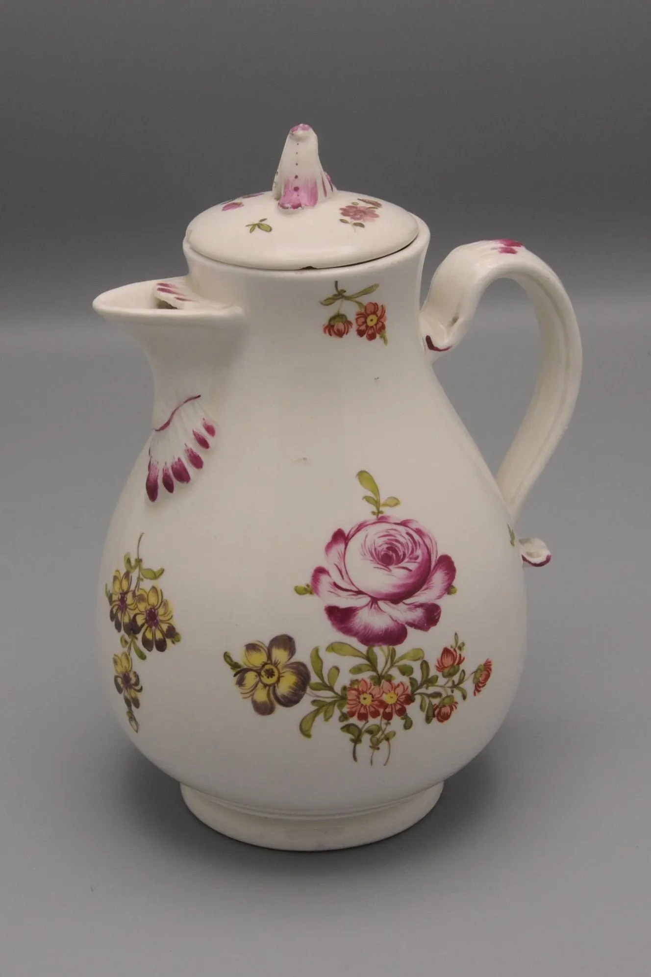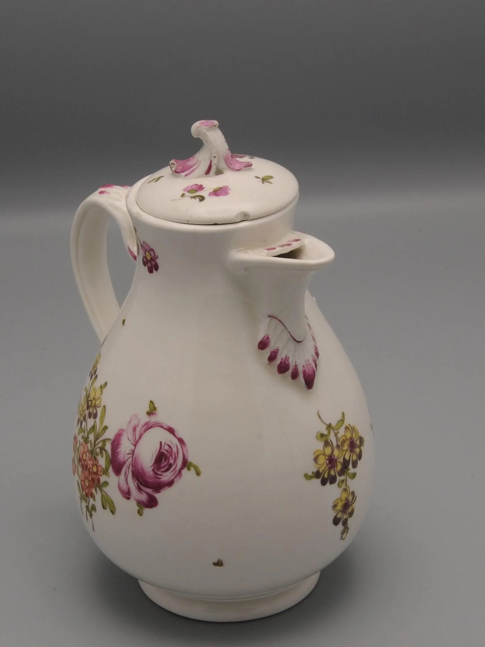 Vienna Porcelain Coffee or Mocha pot with floral decoration and Rococo ornaments on the lid and handle.